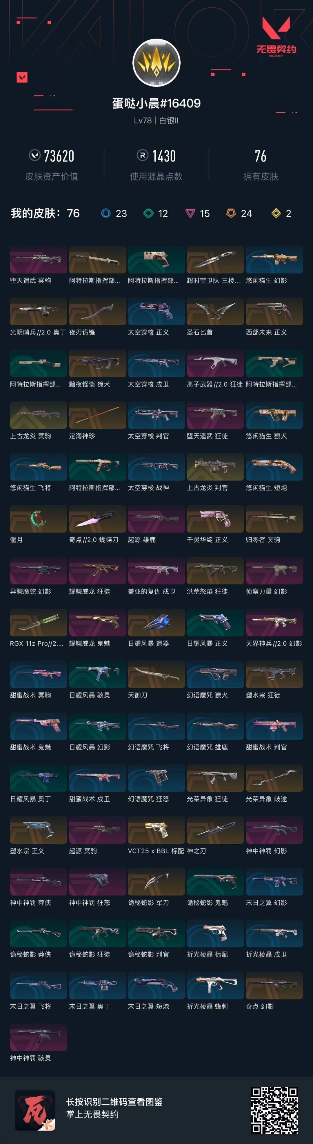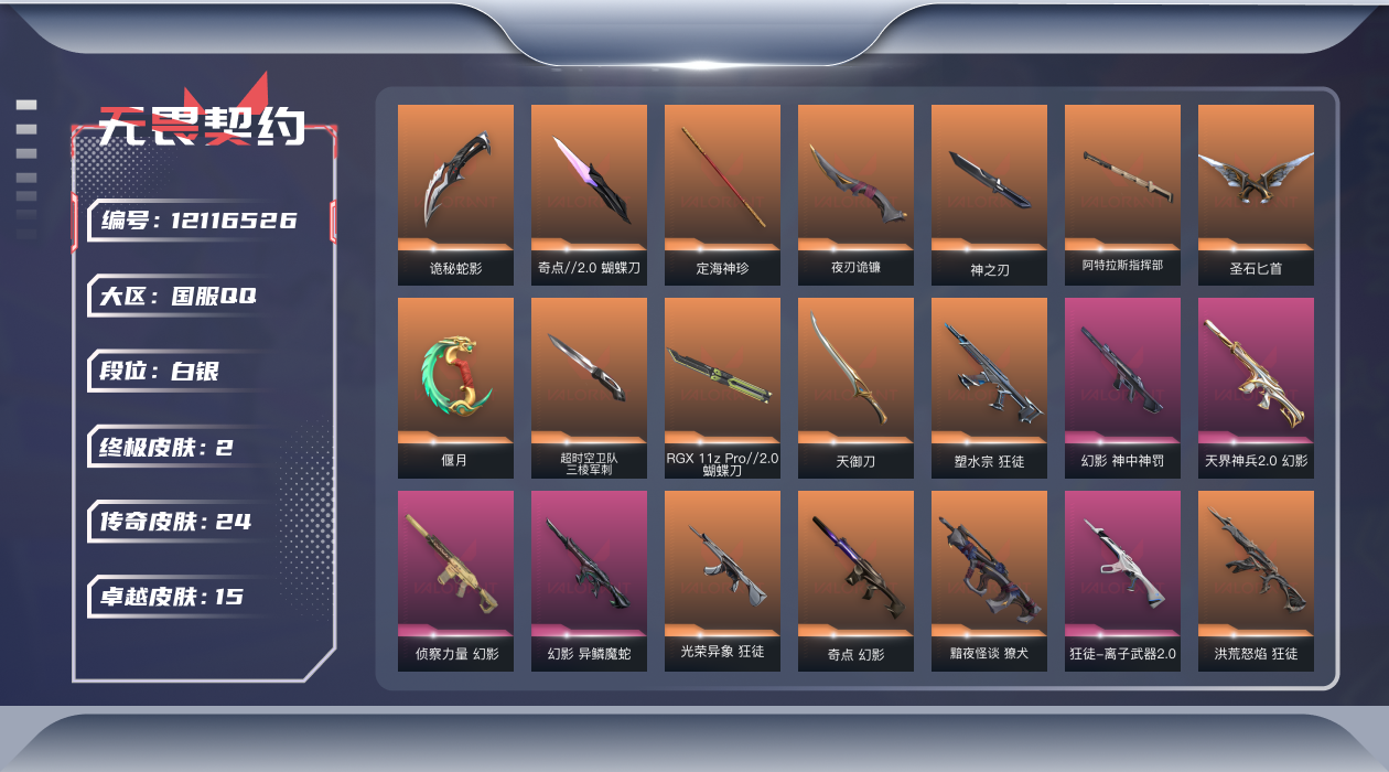 [12116526]24橙皮 2金皮 15紫皮 76皮肤 11英雄 63卡面 1430已用源晶 白银 优质装备:冥驹-归零者,狂徒-塑水宗,幻影-奇点,幻影-侦察力量,正义-塑水宗,冥驹-堕天遗武,狂徒-洪荒怒焰,幻影-天界神兵2.0,正义-千灵华绽,戍卫-盖亚的复仇,偃月,冥驹-起源,定海神珍,奥丁-光明哨兵2.0,圣石匕首,狂徒-耀鳞威龙,天御刀,夜刃诡镰,蝴蝶刀-奇点//2.0,RGX 11z Pro//2.0 蝴蝶刀,诡秘蛇影,神之刃,超时空卫队 三棱军刺,阿特拉斯指挥部,雄鹿-起源,鬼魅-耀鳞威龙 套装:神罚套装,神中神罚套装 佩枪皮肤:标配-VCT25xBBL,狂怒-神中神罚,正义-西部未来 冲锋枪皮肤:骇灵-神中神罚 霰弹枪皮肤:判官-上古龙炎 步枪皮肤:幻影-异鳞魔蛇,獠犬-黯夜怪谈,狂徒-光荣异象,狂徒-离子武器2.0,幻影-神中神罚,狂徒-堕天遗武 狙击枪皮肤:冥驹-上古龙炎,莽侠-神中神罚