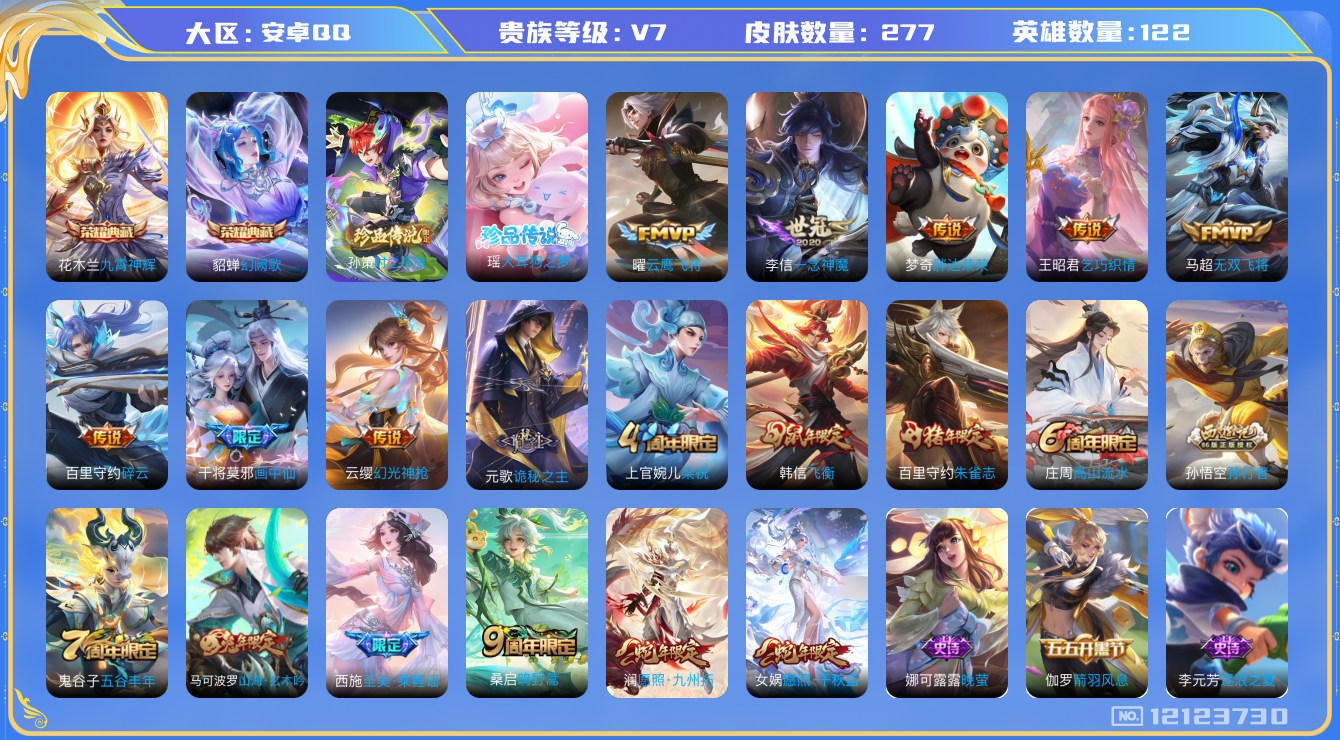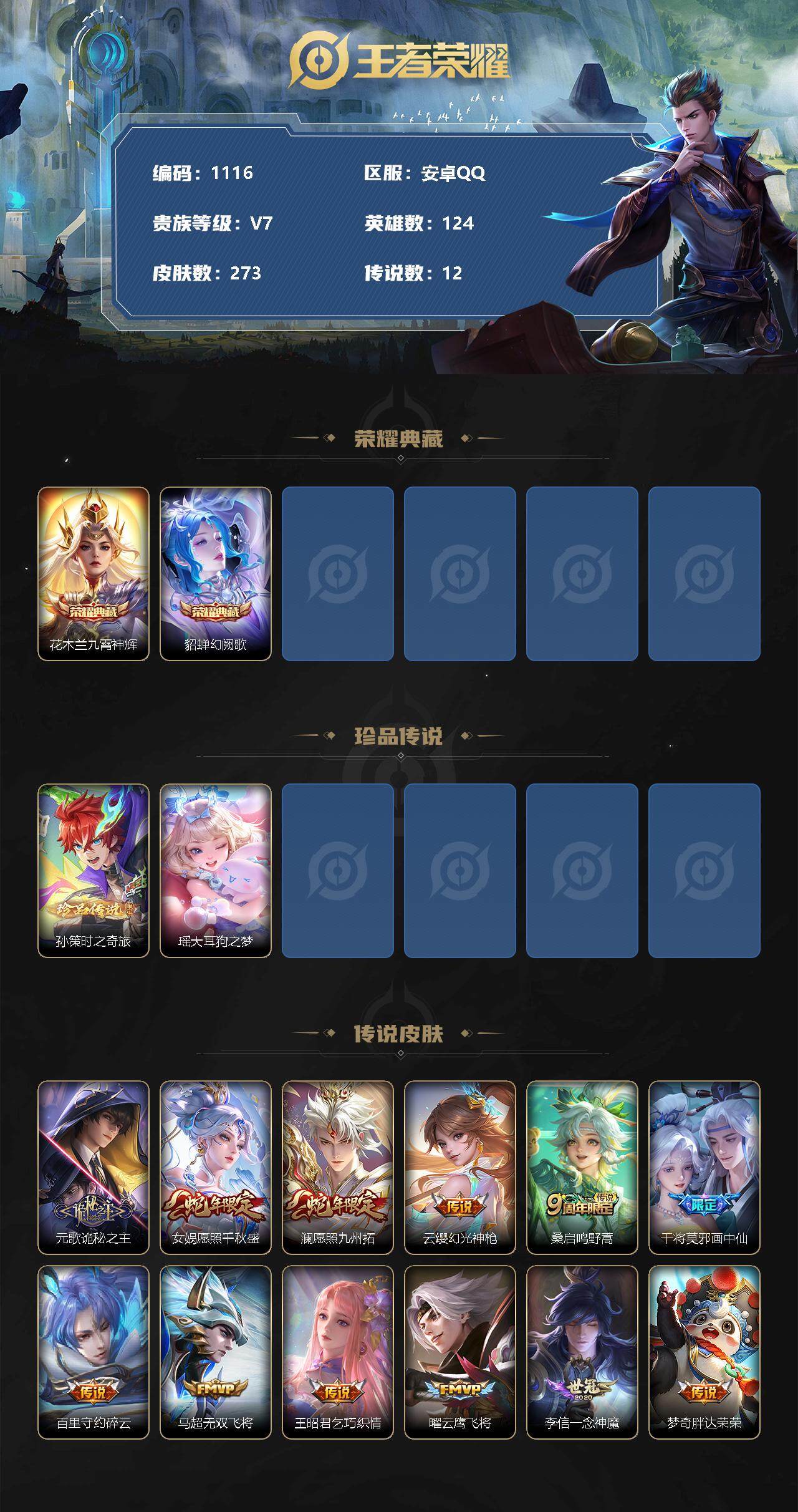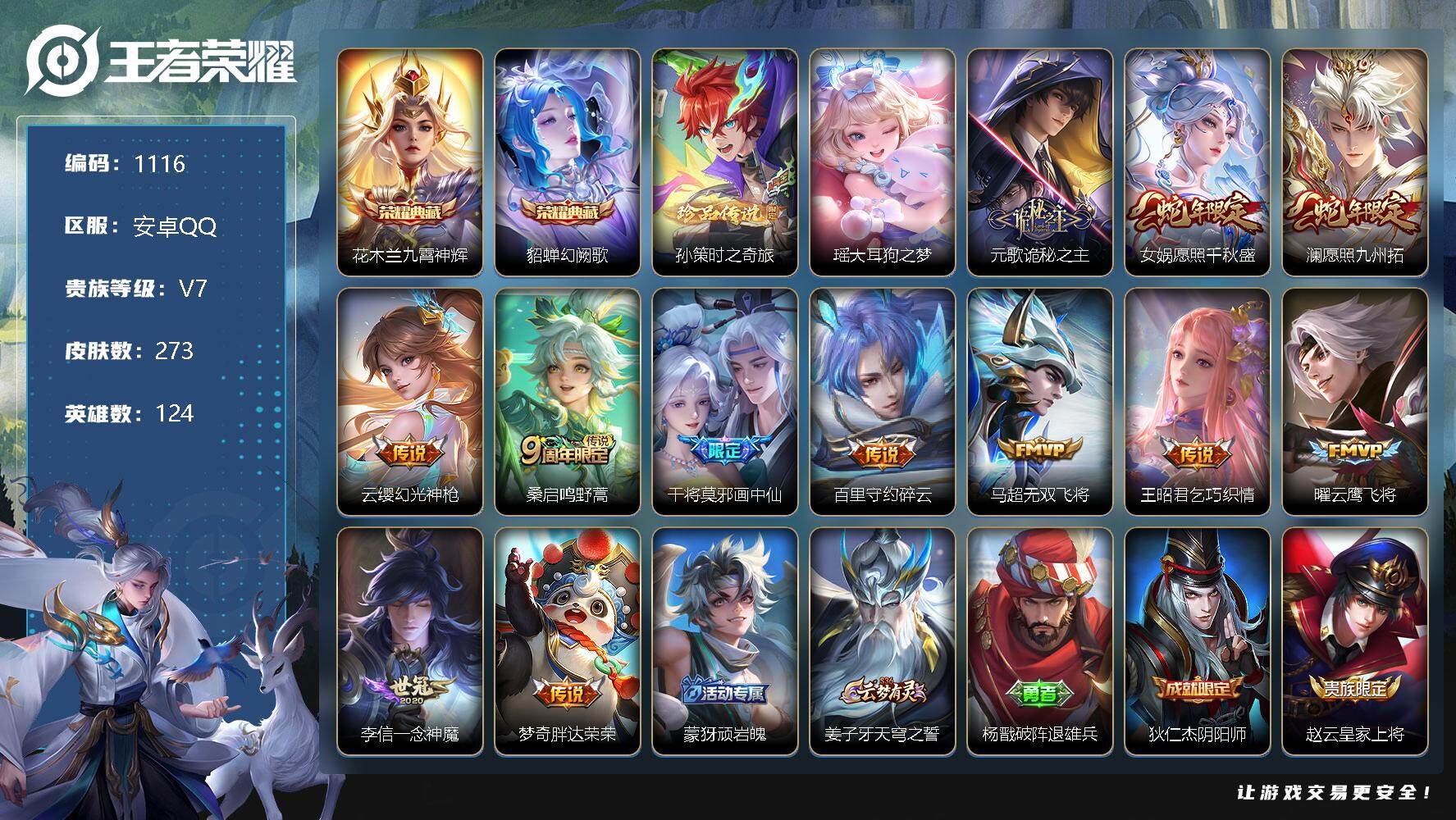 [12123730]【商品标题】:安卓Q-V7-最强王者段位-124英雄-273皮肤-2典藏-0珍品无双-0无双-2珍品传说-12传说-79史诗