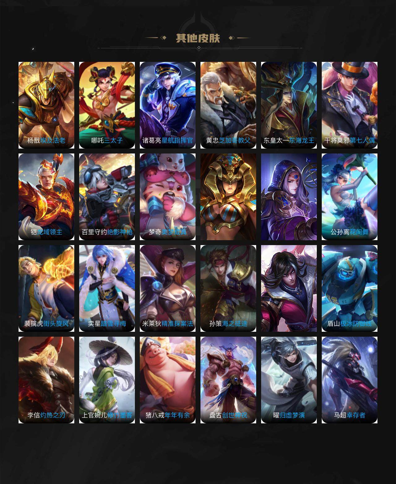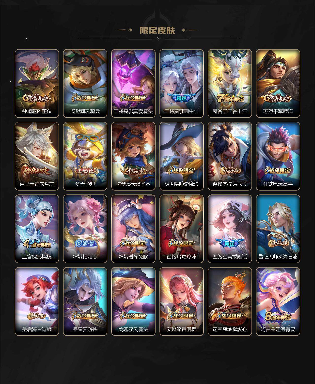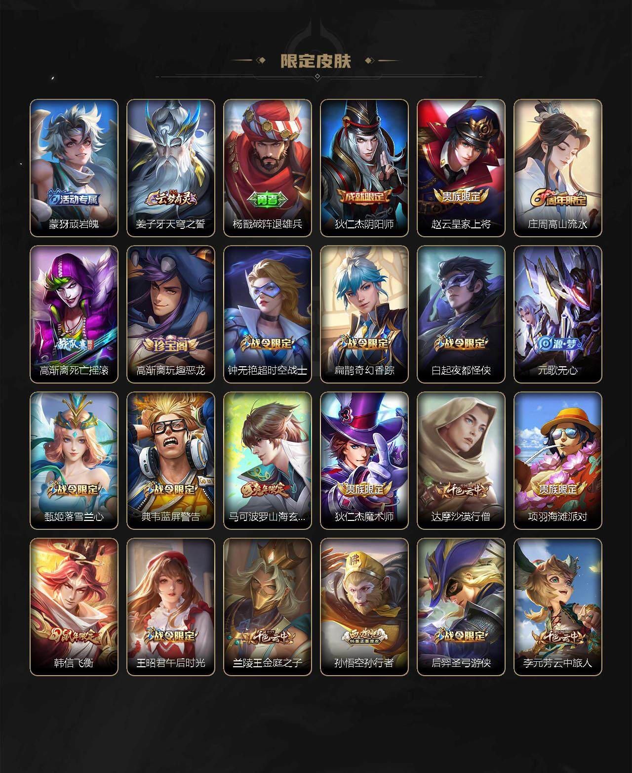 【限定皮肤】:蒙犽顽岩魄,姜子牙天穹之誓,杨戬破阵退雄兵,狄仁杰阴阳师,赵云皇家上将,庄周高山流水,高渐离死亡摇滚,高渐离玩趣恶龙,钟无艳超时空战士,扁鹊奇幻香踪,白起夜都怪侠,元歌无心,甄姬落雪兰心,典韦蓝屏警告,马可波罗山海玄木吟,狄仁杰魔术师,达摩沙漠行僧,项羽海滩派对,韩信飞衡,王昭君午后时光,兰陵王金庭之子,孙悟空孙行者,后羿圣弓游侠,李元芳云中旅人,钟馗驱傩正仪,杨戬潮玩骑兵,干将莫邪真爱魔法,干将莫邪画中仙,鬼谷子五谷丰年,苏烈千军破阵,百里守约朱雀志,梦奇顽趣,沈梦溪大漠名商,明世隐吟游魔法,裴擒虎擒涛扼浪,狂铁电玩高手,上官婉儿梁祝,嫦娥拒霜思,嫦娥暖冬兔眠,西施玲珑珍味,西施至美乘鲤谣,鲁班大师探海日志,桑启海盐诗旅,暃星界游侠,戈娅驭风魔法,艾琳流音漫舞,司空震地狱燃心,阿古朵江河有灵,张良古海寻踪,蒙犽百解令,蒙恬荣光圣徽,鬼谷子天穹祈灯,姬小满妄想食味,沈梦溪龙舞盛年,刘邦剑破天穹,程咬金群星魔术团,镜青焰无极,项羽苍威无极,周瑜熔金海岸