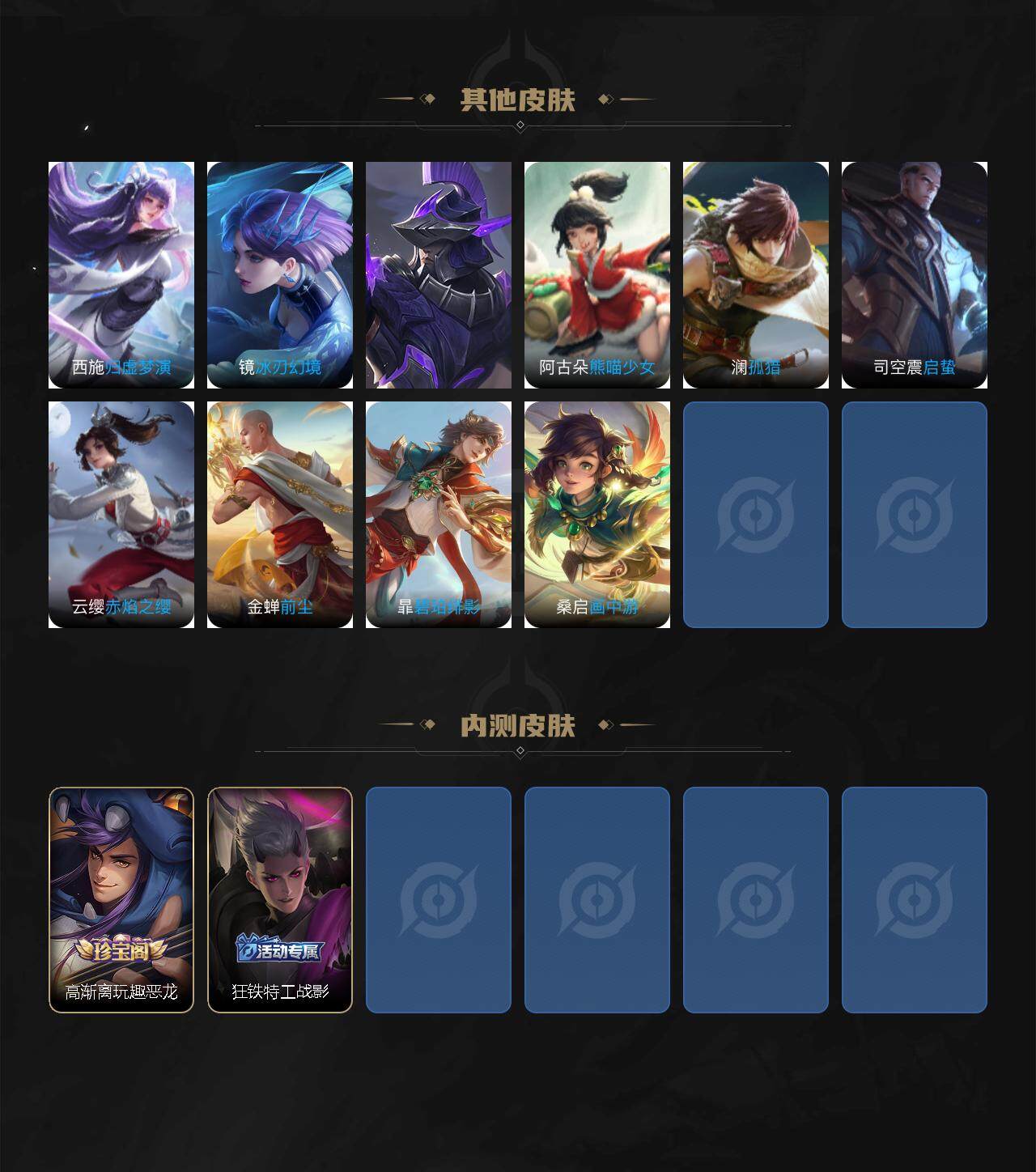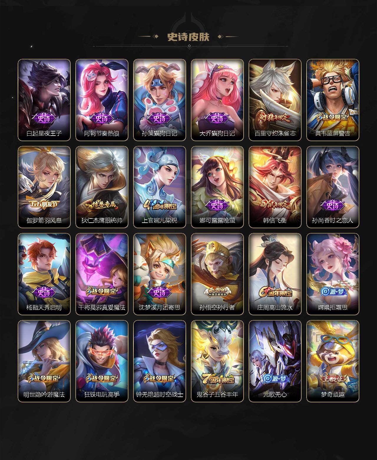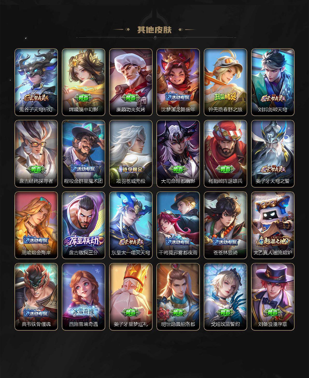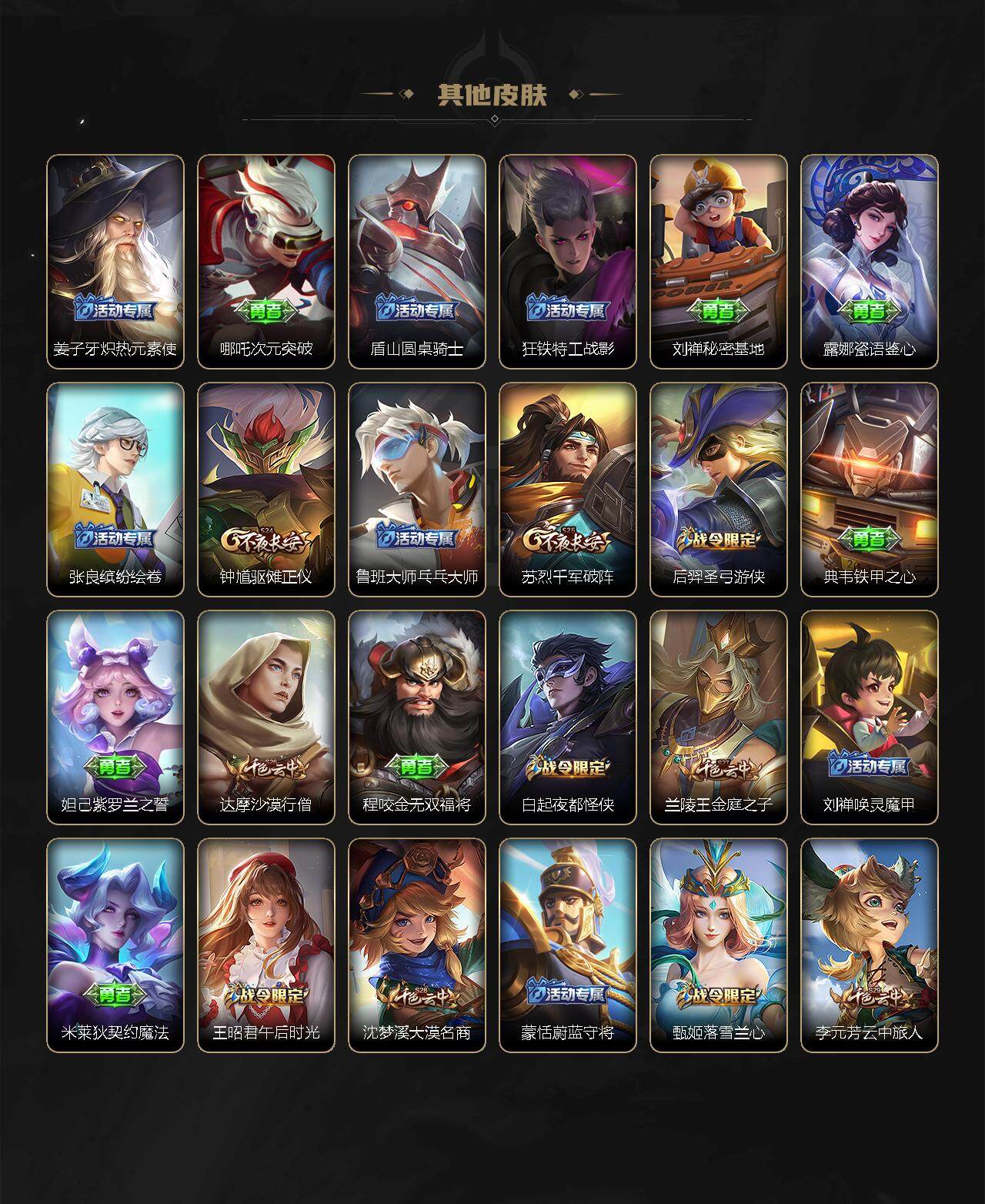 【限定皮肤】:蒙犽顽岩魄,姜子牙天穹之誓,杨戬破阵退雄兵,狄仁杰阴阳师,赵云皇家上将,庄周高山流水,高渐离死亡摇滚,高渐离玩趣恶龙,钟无艳超时空战士,扁鹊奇幻香踪,白起夜都怪侠,元歌无心,甄姬落雪兰心,典韦蓝屏警告,马可波罗山海玄木吟,狄仁杰魔术师,达摩沙漠行僧,项羽海滩派对,韩信飞衡,王昭君午后时光,兰陵王金庭之子,孙悟空孙行者,后羿圣弓游侠,李元芳云中旅人,钟馗驱傩正仪,杨戬潮玩骑兵,干将莫邪真爱魔法,干将莫邪画中仙,鬼谷子五谷丰年,苏烈千军破阵,百里守约朱雀志,梦奇顽趣,沈梦溪大漠名商,明世隐吟游魔法,裴擒虎擒涛扼浪,狂铁电玩高手,上官婉儿梁祝,嫦娥拒霜思,嫦娥暖冬兔眠,西施玲珑珍味,西施至美乘鲤谣,鲁班大师探海日志,桑启海盐诗旅,暃星界游侠,戈娅驭风魔法,艾琳流音漫舞,司空震地狱燃心,阿古朵江河有灵,张良古海寻踪,蒙犽百解令,蒙恬荣光圣徽,鬼谷子天穹祈灯,姬小满妄想食味,沈梦溪龙舞盛年,刘邦剑破天穹,程咬金群星魔术团,镜青焰无极,项羽苍威无极,周瑜熔金海岸