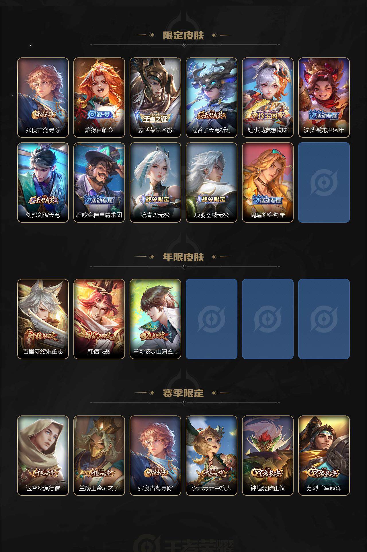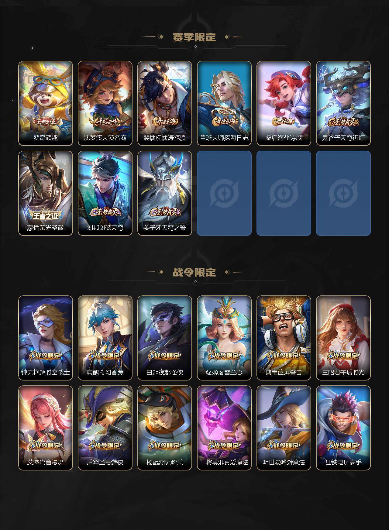 【赛季限定】:达摩沙漠行僧,兰陵王金庭之子,张良古海寻踪,李元芳云中旅人,钟馗驱傩正仪,苏烈千军破阵,梦奇顽趣,沈梦溪大漠名商,裴擒虎擒涛扼浪,鲁班大师探海日志,桑启海盐诗旅,鬼谷子天穹祈灯,蒙恬荣光圣徽,刘邦剑破天穹,姜子牙天穹之誓
