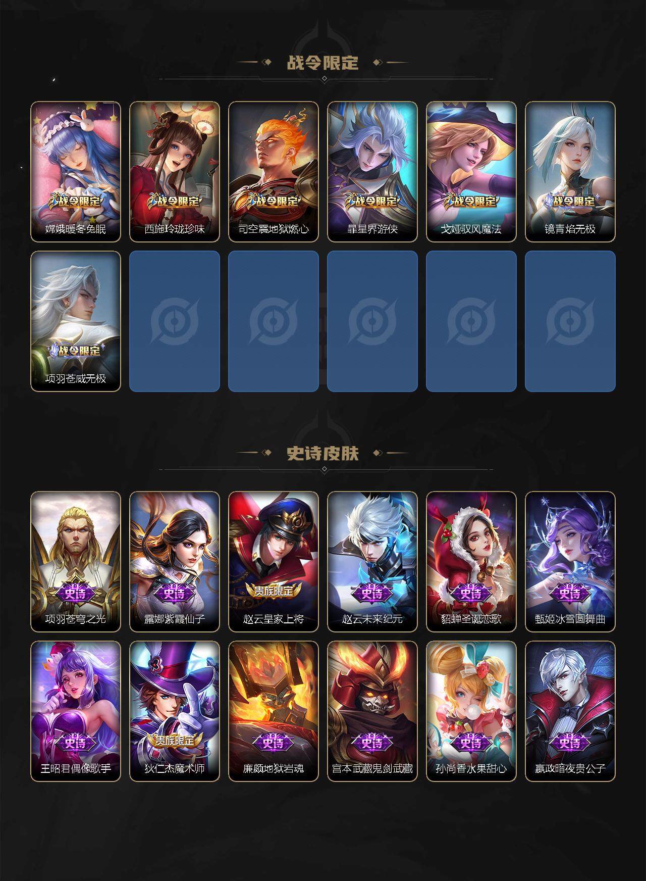 【战令限定】:钟无艳超时空战士,扁鹊奇幻香踪,白起夜都怪侠,甄姬落雪兰心,典韦蓝屏警告,王昭君午后时光,艾琳流音漫舞,后羿圣弓游侠,杨戬潮玩骑兵,干将莫邪真爱魔法,明世隐吟游魔法,狂铁电玩高手,嫦娥暖冬兔眠,西施玲珑珍味,司空震地狱燃心,暃星界游侠,戈娅驭风魔法,镜青焰无极,项羽苍威无极