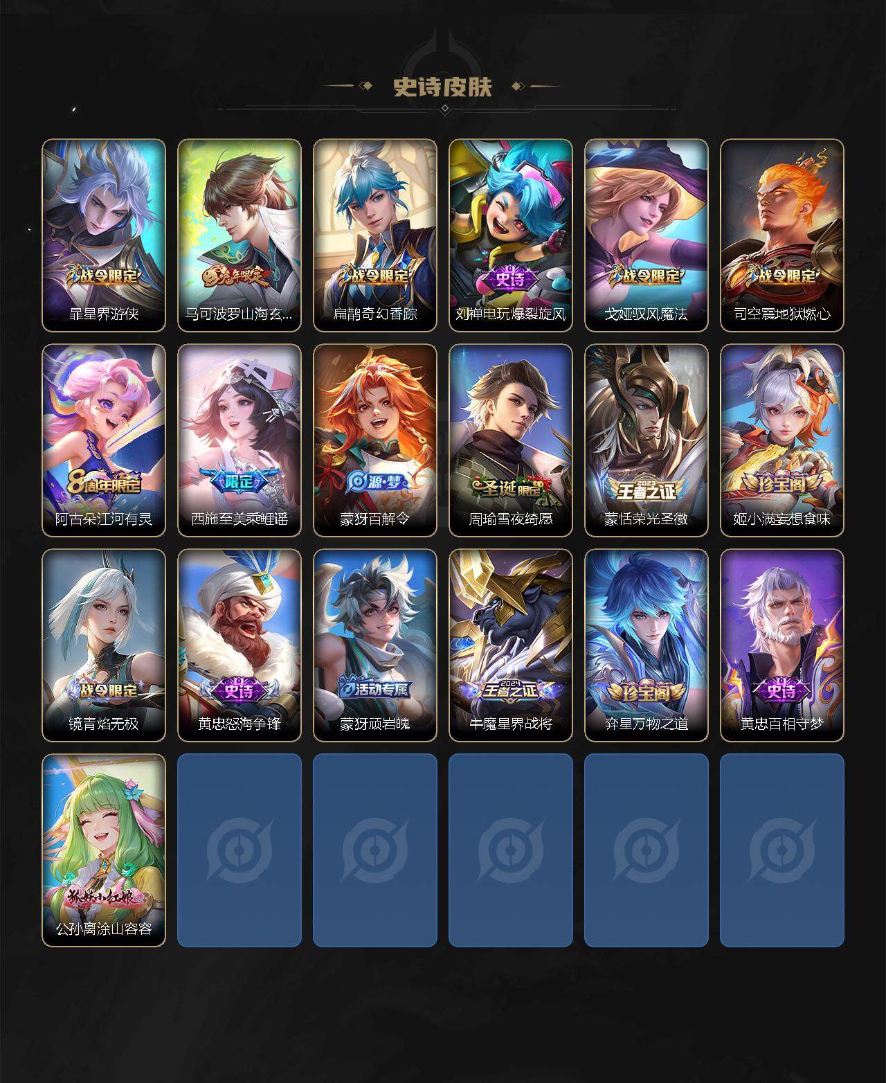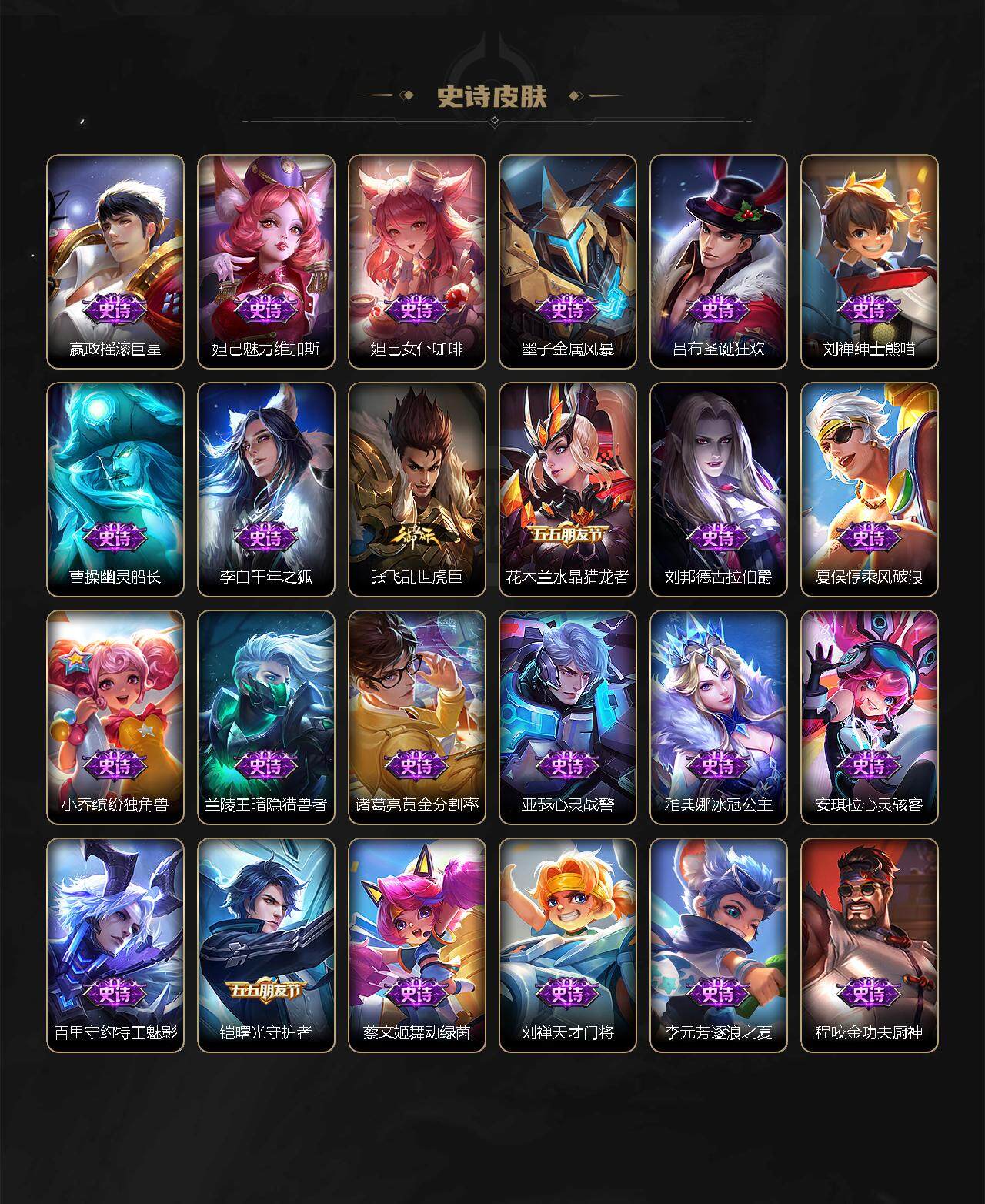 【史诗皮肤】:项羽苍穹之光,露娜紫霞仙子,赵云皇家上将,赵云未来纪元,貂蝉圣诞恋歌,甄姬冰雪圆舞曲,王昭君偶像歌手,狄仁杰魔术师,廉颇地狱岩