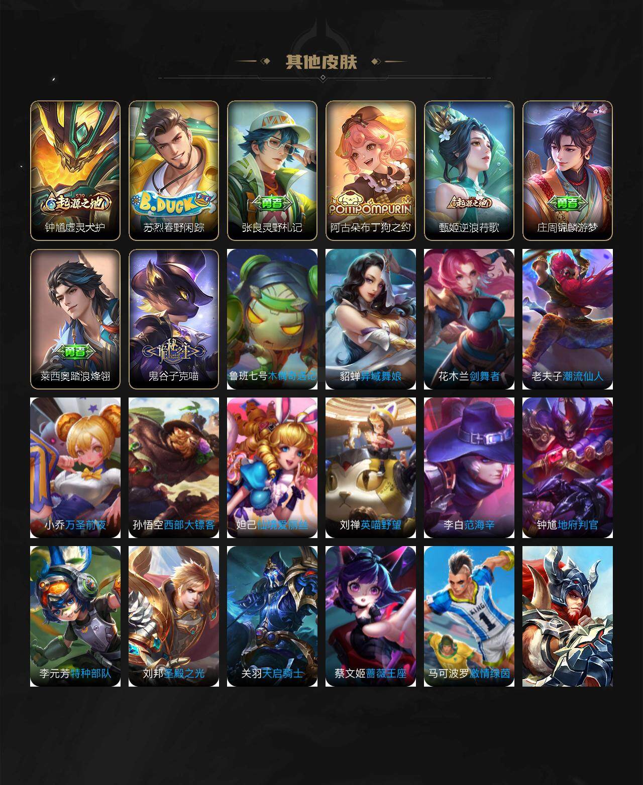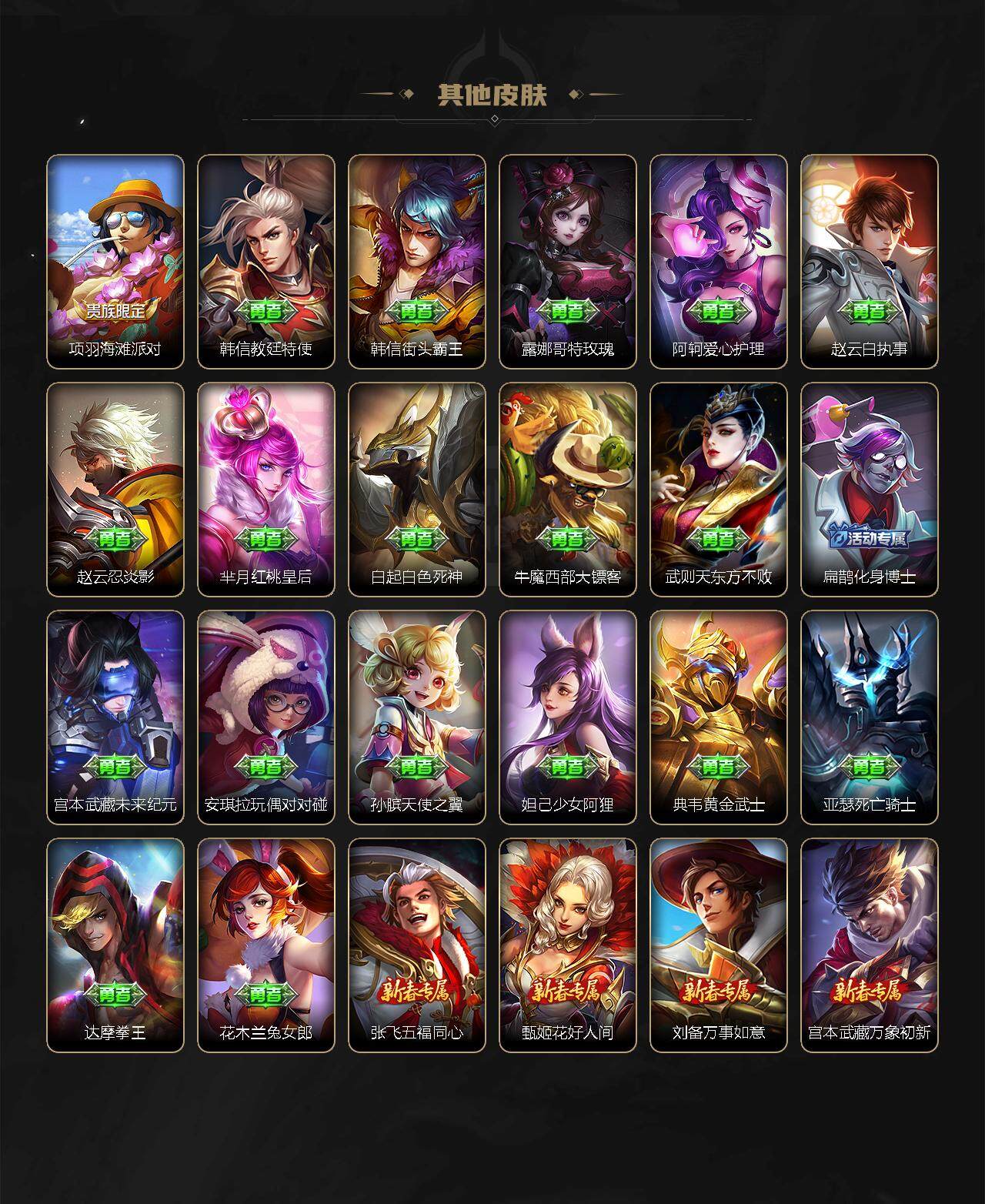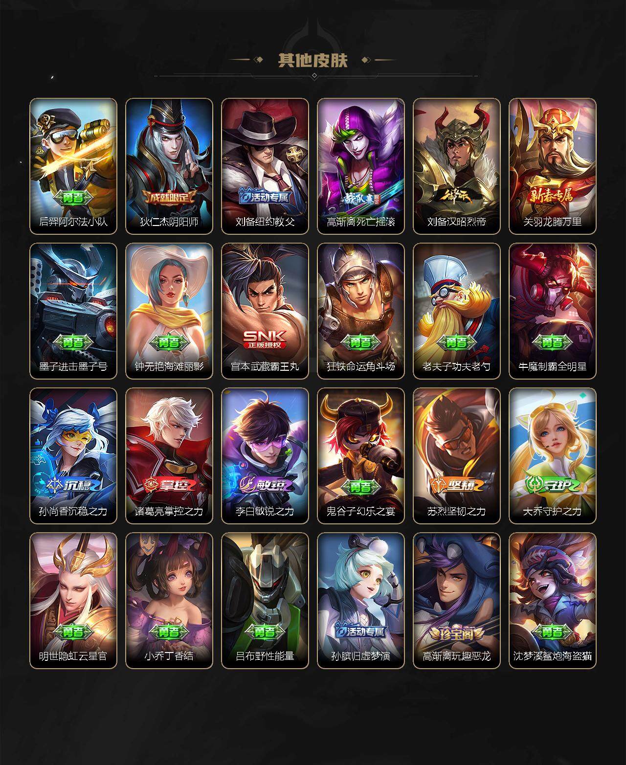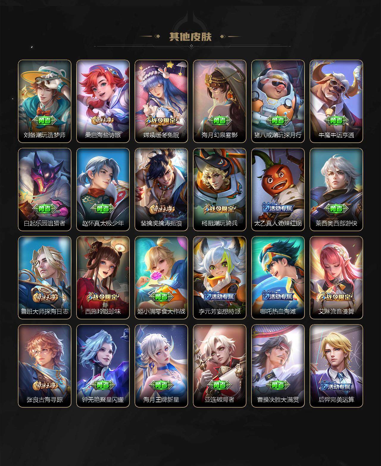 娜可露露晚萤,伽罗箭羽风息,李元芳逐浪之夏,大乔猫狗日记,孙策猫狗日记,阿轲节奏热浪,露娜紫霞仙子,诸葛亮黄金分割率,王昭君偶像歌手,项羽苍穹之光,孙尚香时之恋人,雅典娜冰冠公主,嬴政摇滚巨星,刘禅绅士熊喵,刘禅天才门将,白起星夜王子,安琪拉心灵骇客,程咬金功夫厨神,刘邦德古拉伯爵,兰陵王暗隐猎兽者,曹操幽灵船长,宫本武藏鬼剑武藏,司马懿暗渊魔法,亚瑟心灵战警,杨戬天秀·启明,蔡文姬舞动绿茵,廉颇地狱岩魂,小乔缤纷独角兽,夏侯惇乘风破浪,花木兰水晶猎龙者,铠曙光守护者,墨子金属风暴,吕布圣诞狂欢,貂蝉圣诞恋歌,百里守约特工魅影,嬴政暗夜贵公子,嫦娥拒霜思,李白千年之狐,刘禅电玩·爆裂旋风,蒙犽百解令,周瑜雪夜绮愿