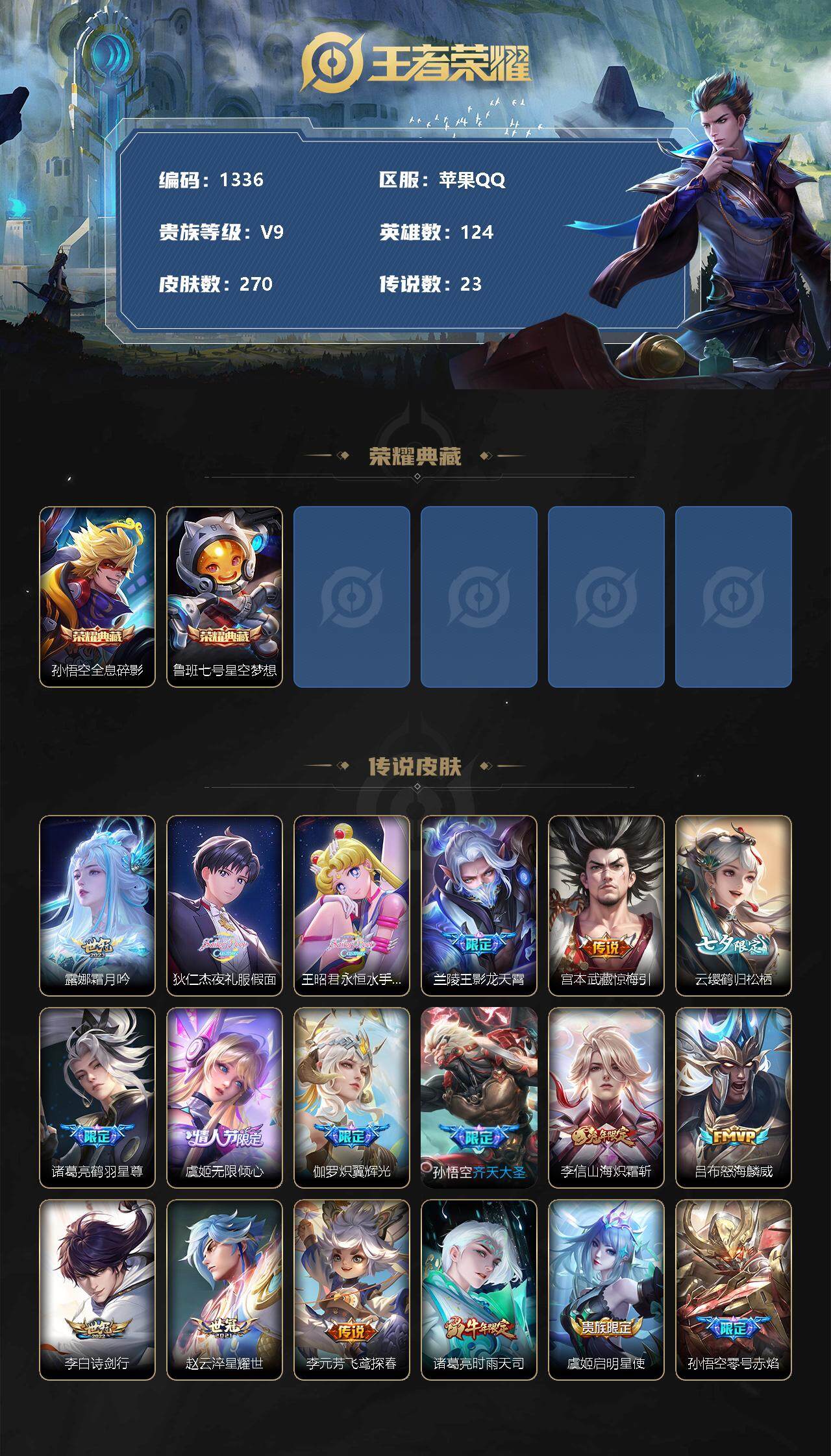 - [11678083]V8 1典藏 6传说 123英雄 277皮肤 可修改实名 优质装备:鸣剑·曳影,黄金射手座,猫影幻舞,地狱火 珍宝阁皮:蔷薇恋人,女武神 限定皮:鸣野蒿,至尊宝,凤求凰(白切鸡),凤凰于飞,飞衡(韩信年限),高山流水,五谷丰年,青龙志(铠年限),梁祝,岱宗(典韦年限),李小龙,玄武志(苏烈年限),辉光之辰 史诗皮:龙之律动,蔬乡物语(鲁班七号),琥珀纪元伽罗,紫霞仙子,苍穹之光,白龙吟,特工魅影,千年之狐,永昼,电玩·爆裂旋风,真我赫兹(百里守约),匿光侦查者,江河有灵,雪夜绮愿(周瑜),百解令(蒙犽),高渐离燃音魔法,龙骑士(小龙虾),暗夜猫娘,无限星赏官,猫狗日记-孙策,时之恋人-孙尚香,乱世虎臣,节奏热浪,女仆咖啡,水果甜心,绅士熊喵,星夜王子,心灵骇客,功夫厨神,德古拉伯爵,暗隐猎兽者,幽灵船长,鬼剑武藏,心灵战警,舞动绿茵,地狱岩魂,纤云弄巧,繁星吟游(呼啦呼啦),拒霜思,缤纷独角兽,乘风破浪,逐浪之夏,月团寄思,水晶猎龙者,曙光守护者,唤灵魅影,金属风暴,圣诞狂欢,圣诞恋歌,鹰眼统帅,魅力维加斯,未来纪元-赵云,玫瑰异探