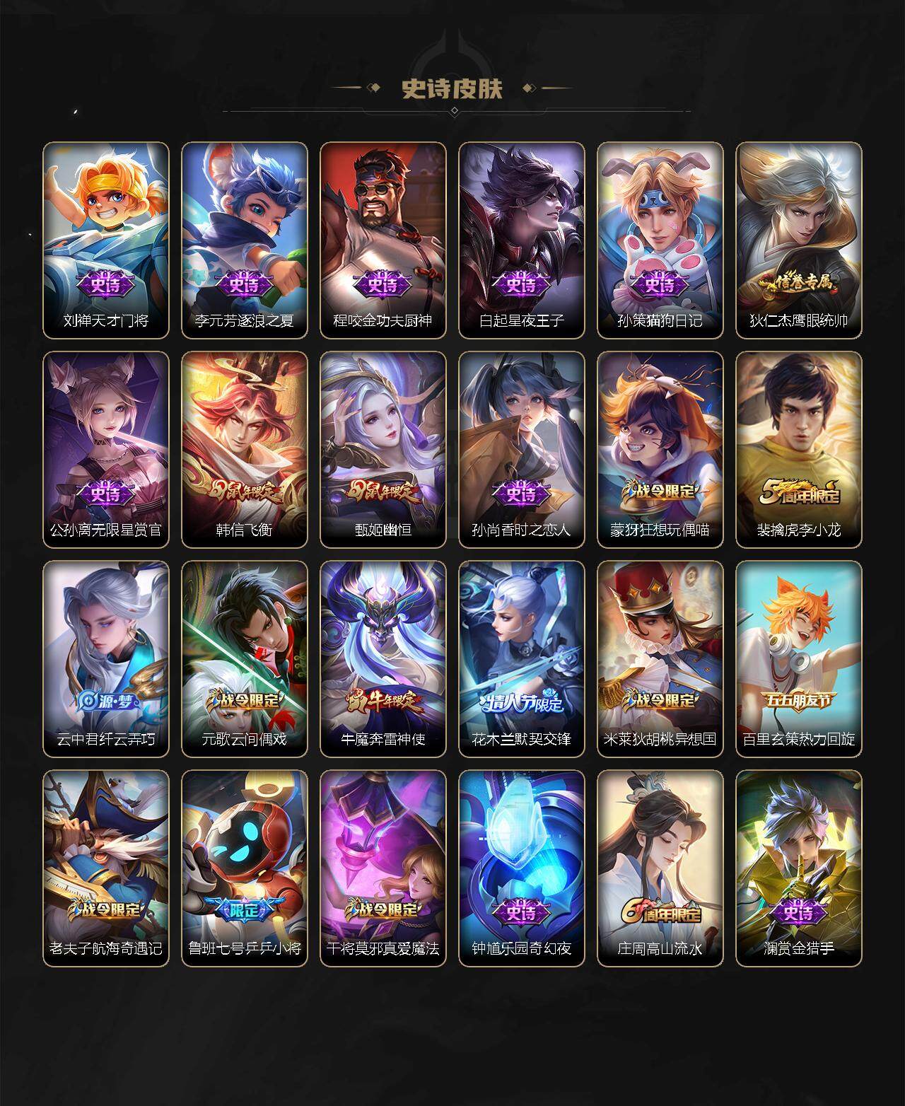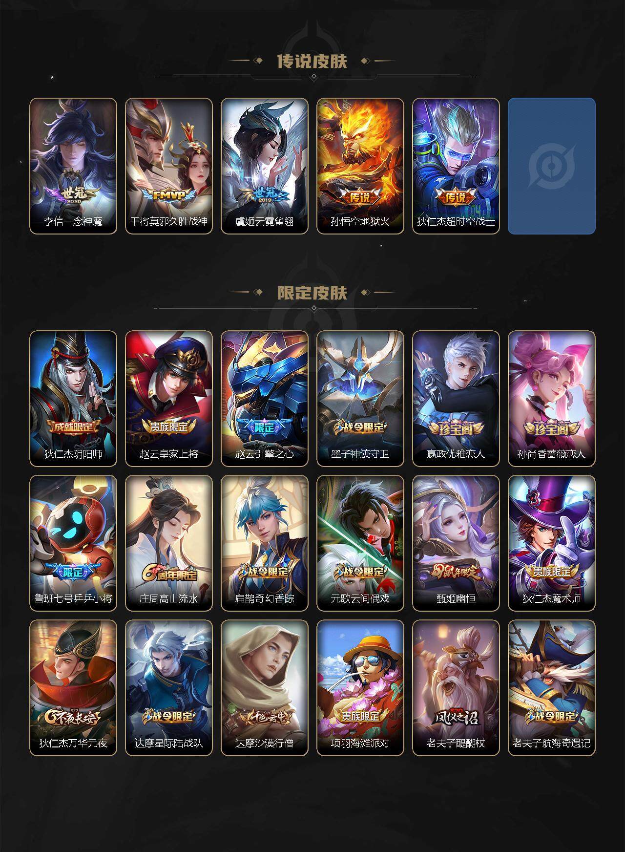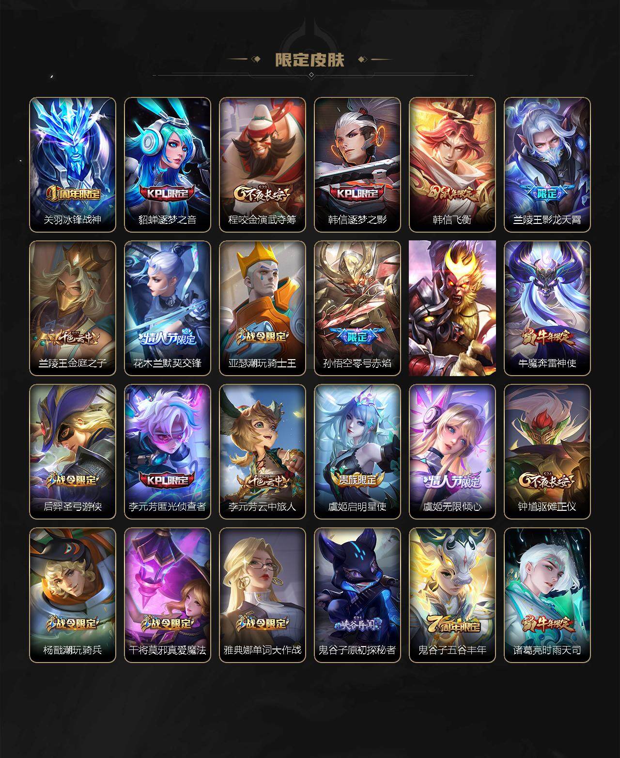 【限定皮肤】:狄仁杰阴阳师,赵云皇家上将,赵云引擎之心,墨子神迹守卫,嬴政优雅恋人,孙尚香蔷薇恋人,鲁班七号乒乒小将,庄周高山流水,扁鹊奇幻香踪,元歌云间偶戏,甄姬幽恒,狄仁杰魔术师,狄仁杰万华元夜,达摩星际陆战队,达摩沙漠行僧,项羽海滩派对,老夫子醍醐杖,老夫子航海奇遇记,关羽冰锋战神,貂蝉逐梦之音,程咬金演武夺筹,韩信逐梦之影,韩信飞衡,兰陵王影龙天霄,兰陵王金庭之子,花木兰默契交锋,亚瑟潮玩骑士王,孙悟空零号赤焰,孙悟空齐天大圣,牛魔奔雷神使,后羿圣弓游侠,李元芳匿光侦查者,李元芳云中旅人,虞姬启明星使,虞姬无限倾心,钟馗驱傩正仪,杨戬潮玩骑兵,干将莫邪真爱魔法,雅典娜单词大作战,鬼谷子原初探秘者,鬼谷子五谷丰年,诸葛亮时雨天司,诸葛亮鹤羽星尊,苏烈千军破阵,弈星混沌棋,沈梦溪大漠名商,明世隐疑决卦,裴擒虎李小龙,裴擒虎擒涛扼浪,米莱狄胡桃异想国,云中君纤云弄巧,李信山海炽霜斩,伽罗炽翼辉光,嫦娥暖冬兔眠,西施玲珑珍味,蒙犽狂想玩偶喵,鲁班大师探海日志,桑启海盐诗旅,戈娅驭风魔法,艾琳流音漫舞,云缨鹤归松栖,张良古海寻踪,王昭君永恒水手月亮,狄仁杰夜礼服假面,鬼谷子天穹祈灯