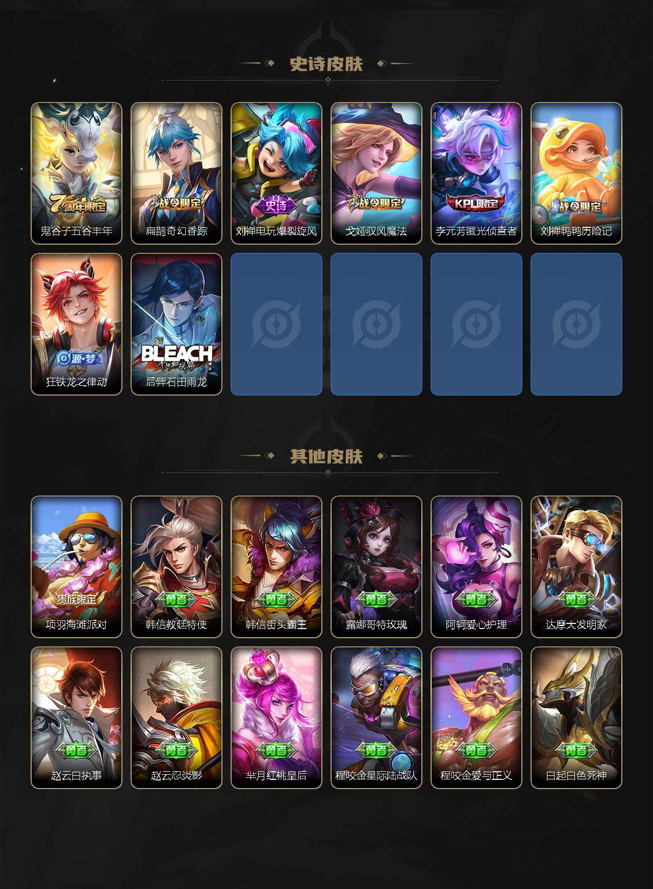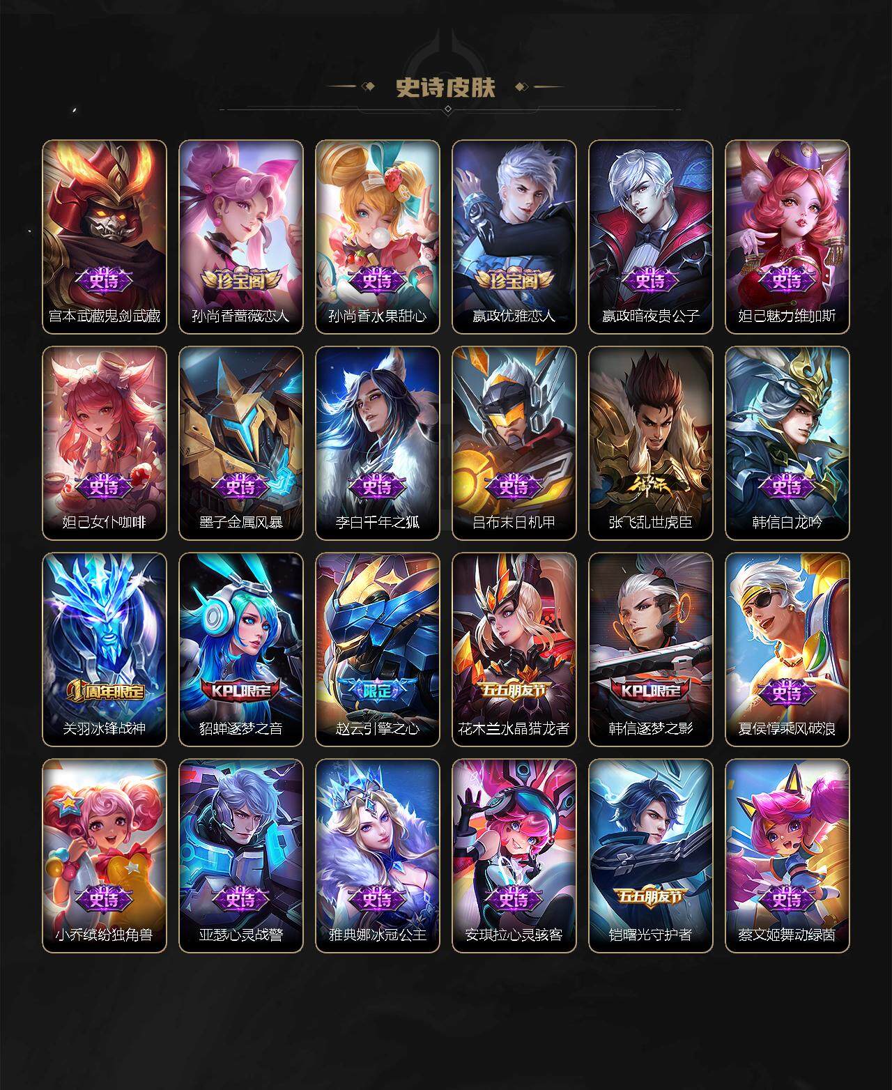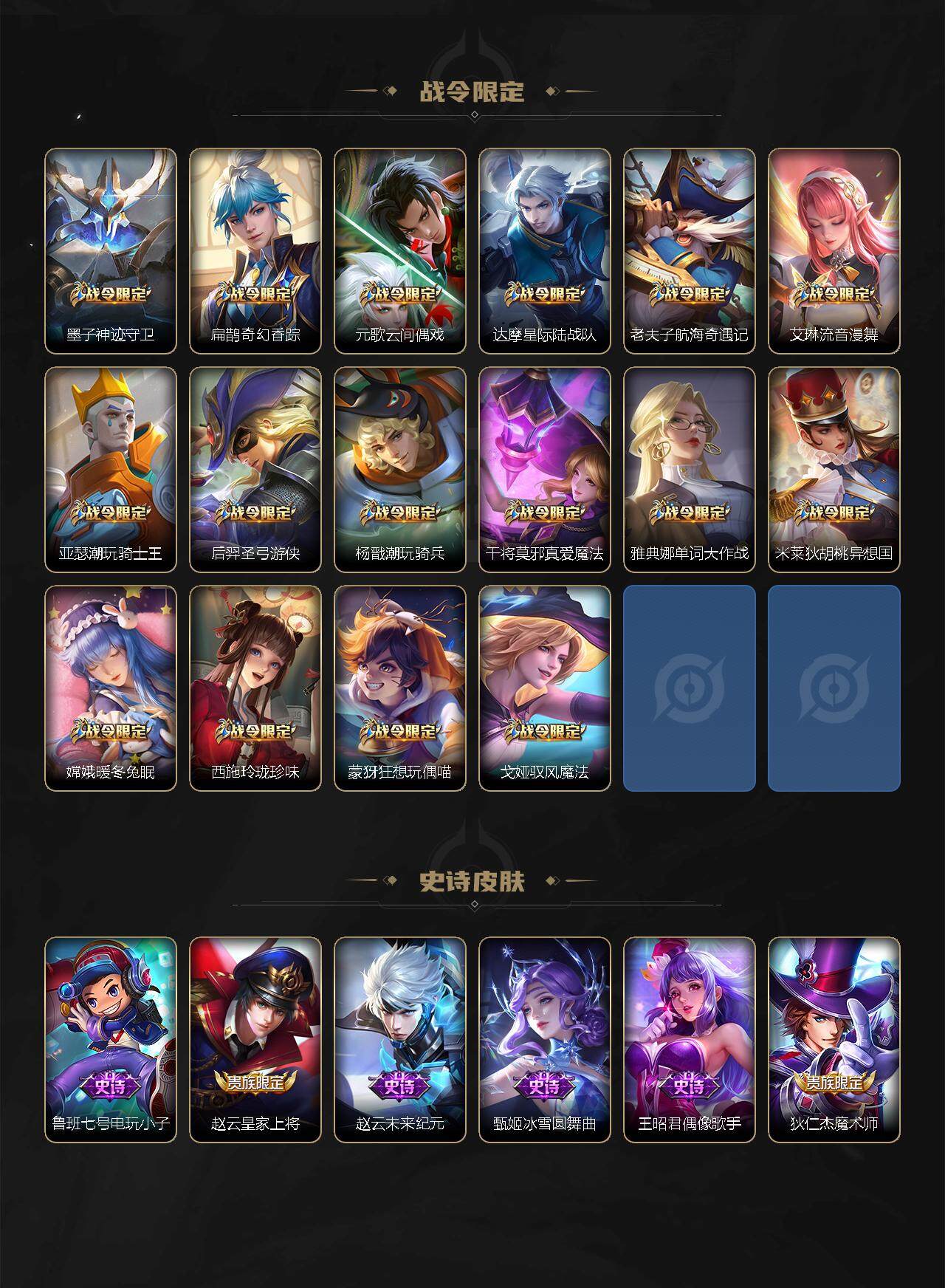 【限定皮肤】:狄仁杰阴阳师,赵云皇家上将,赵云引擎之心,墨子神迹守卫,嬴政优雅恋人,孙尚香蔷薇恋人,鲁班七号乒乒小将,庄周高山流水,扁鹊奇幻香踪,元歌云间偶戏,甄姬幽恒,狄仁杰魔术师,狄仁杰万华元夜,达摩星际陆战队,达摩沙漠行僧,项羽海滩派对,老夫子醍醐杖,老夫子航海奇遇记,关羽冰锋战神,貂蝉逐梦之音,程咬金演武夺筹,韩信逐梦之影,韩信飞衡,兰陵王影龙天霄,兰陵王金庭之子,花木兰默契交锋,亚瑟潮玩骑士王,孙悟空零号赤焰,孙悟空齐天大圣,牛魔奔雷神使,后羿圣弓游侠,李元芳匿光侦查者,李元芳云中旅人,虞姬启明星使,虞姬无限倾心,钟馗驱傩正仪,杨戬潮玩骑兵,干将莫邪真爱魔法,雅典娜单词大作战,鬼谷子原初探秘者,鬼谷子五谷丰年,诸葛亮时雨天司,诸葛亮鹤羽星尊,苏烈千军破阵,弈星混沌棋,沈梦溪大漠名商,明世隐疑决卦,裴擒虎李小龙,裴擒虎擒涛扼浪,米莱狄胡桃异想国,云中君纤云弄巧,李信山海炽霜斩,伽罗炽翼辉光,嫦娥暖冬兔眠,西施玲珑珍味,蒙犽狂想玩偶喵,鲁班大师探海日志,桑启海盐诗旅,戈娅驭风魔法,艾琳流音漫舞,云缨鹤归松栖,张良古海寻踪,王昭君永恒水手月亮,狄仁杰夜礼服假面,鬼谷子天穹祈灯