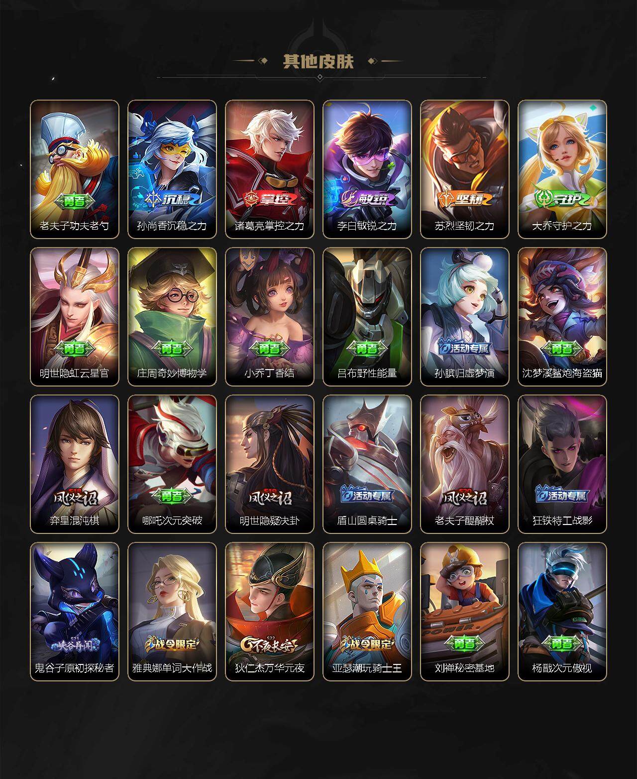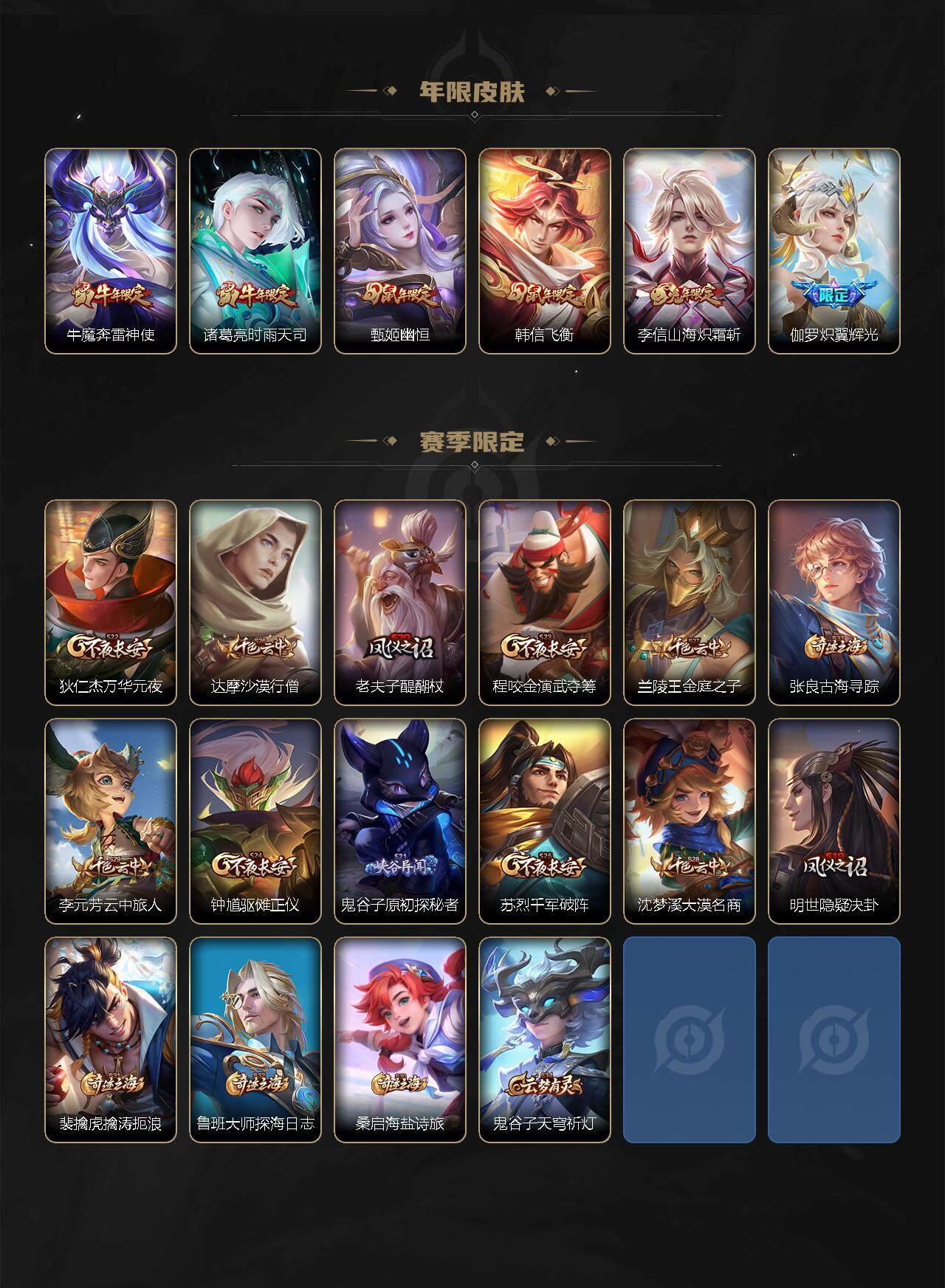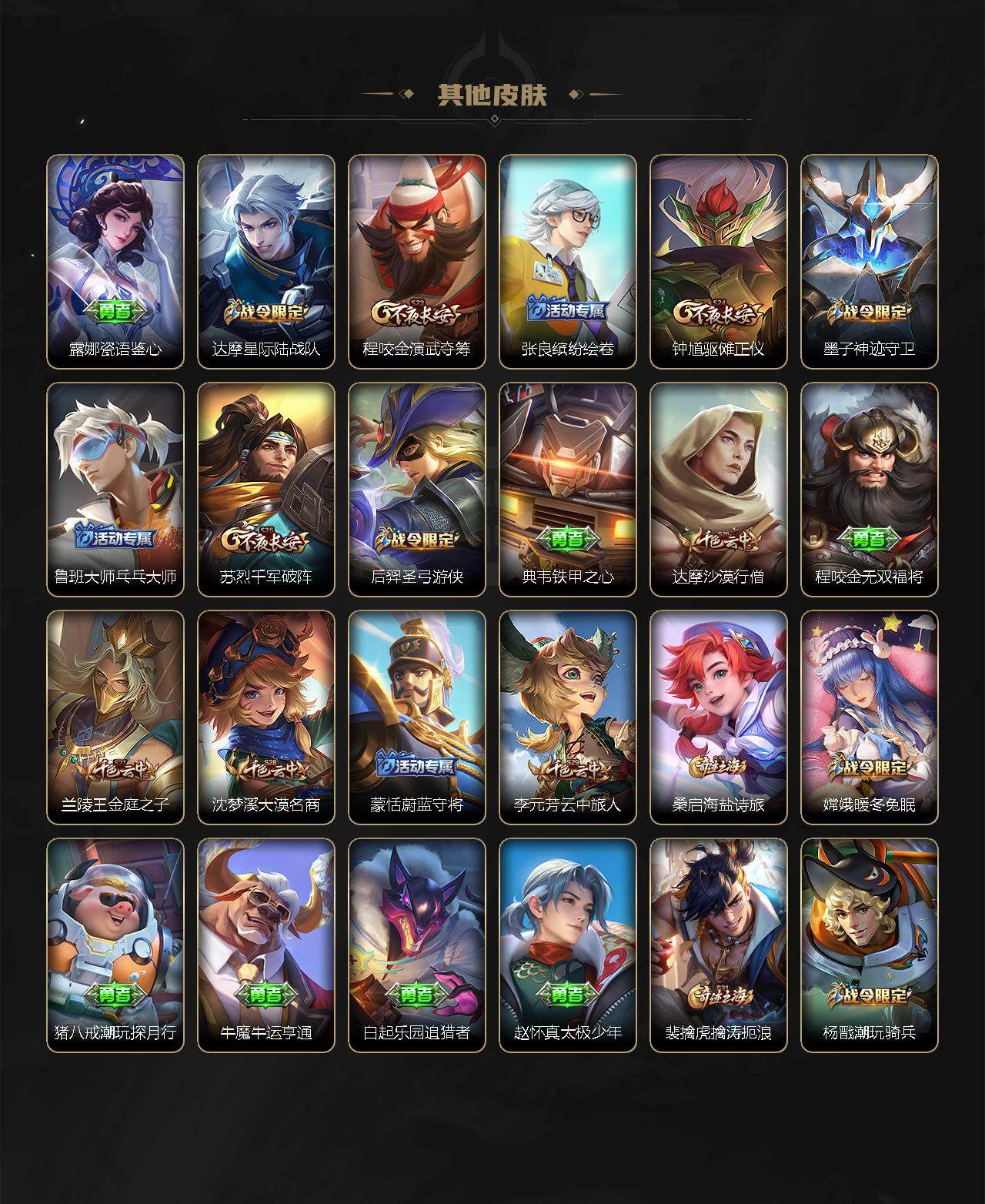 【赛季限定】:狄仁杰万华元夜,达摩沙漠行僧,老夫子醍醐杖,程咬金演武夺筹,兰陵王金庭之子,张良古海寻踪,李元芳云中旅人,钟馗驱傩正仪,鬼谷子原初探秘者,苏烈千军破阵,弈星混沌棋,沈梦溪大漠名商,明世隐疑决卦,裴擒虎擒涛扼浪,鲁班大师探海日志,桑启海盐诗旅,鬼谷子天穹祈灯