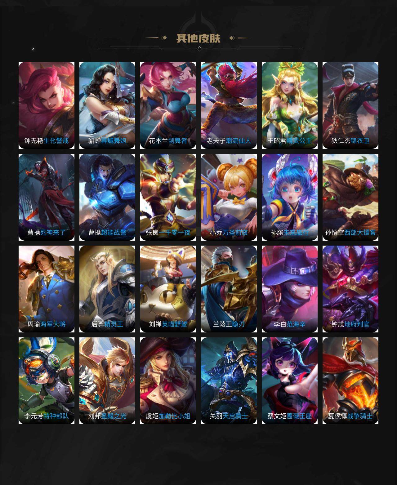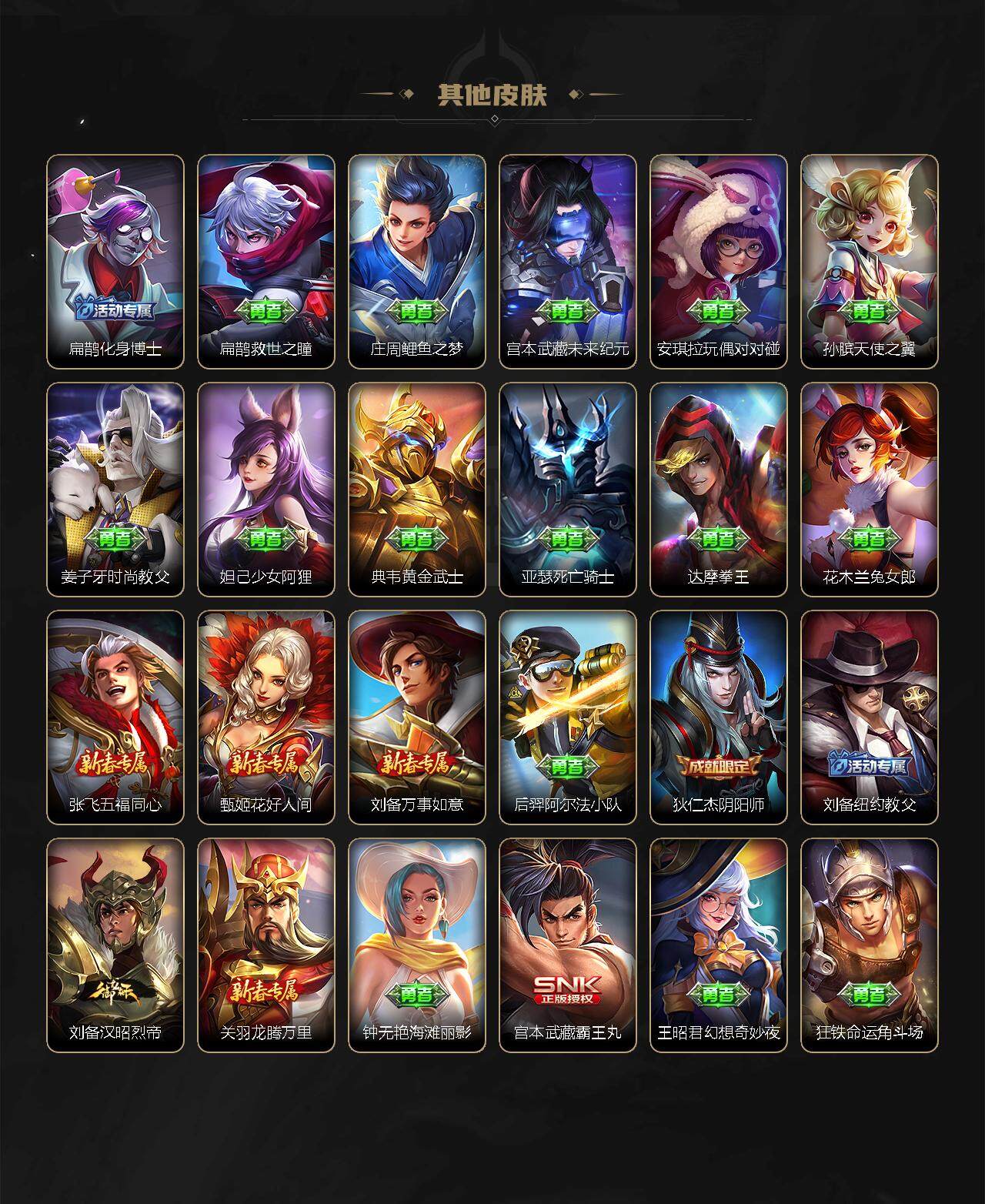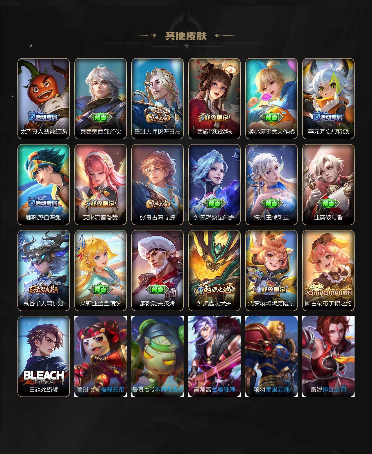 【赛季限定】:狄仁杰万华元夜,达摩沙漠行僧,老夫子醍醐杖,程咬金演武夺筹,兰陵王金庭之子,张良古海寻踪,李元芳云中旅人,钟馗驱傩正仪,鬼谷子原初探秘者,苏烈千军破阵,弈星混沌棋,沈梦溪大漠名商,明世隐疑决卦,裴擒虎擒涛扼浪,鲁班大师探海日志,桑启海盐诗旅,鬼谷子天穹祈灯