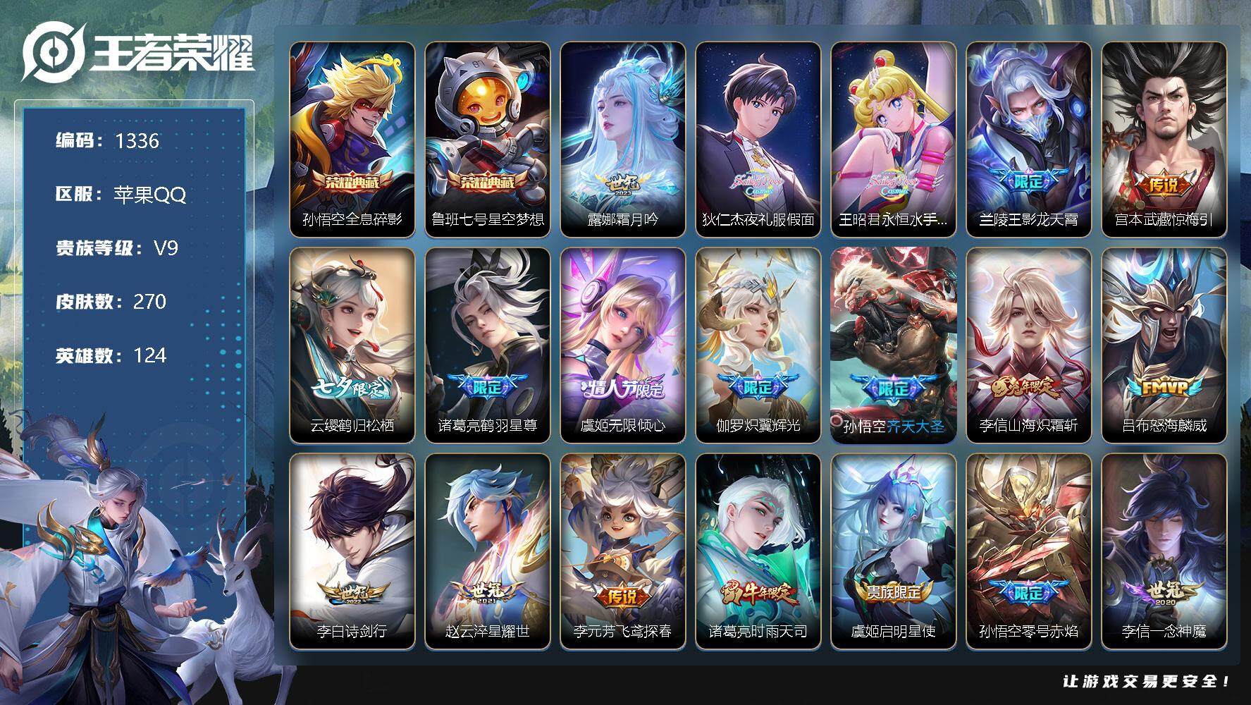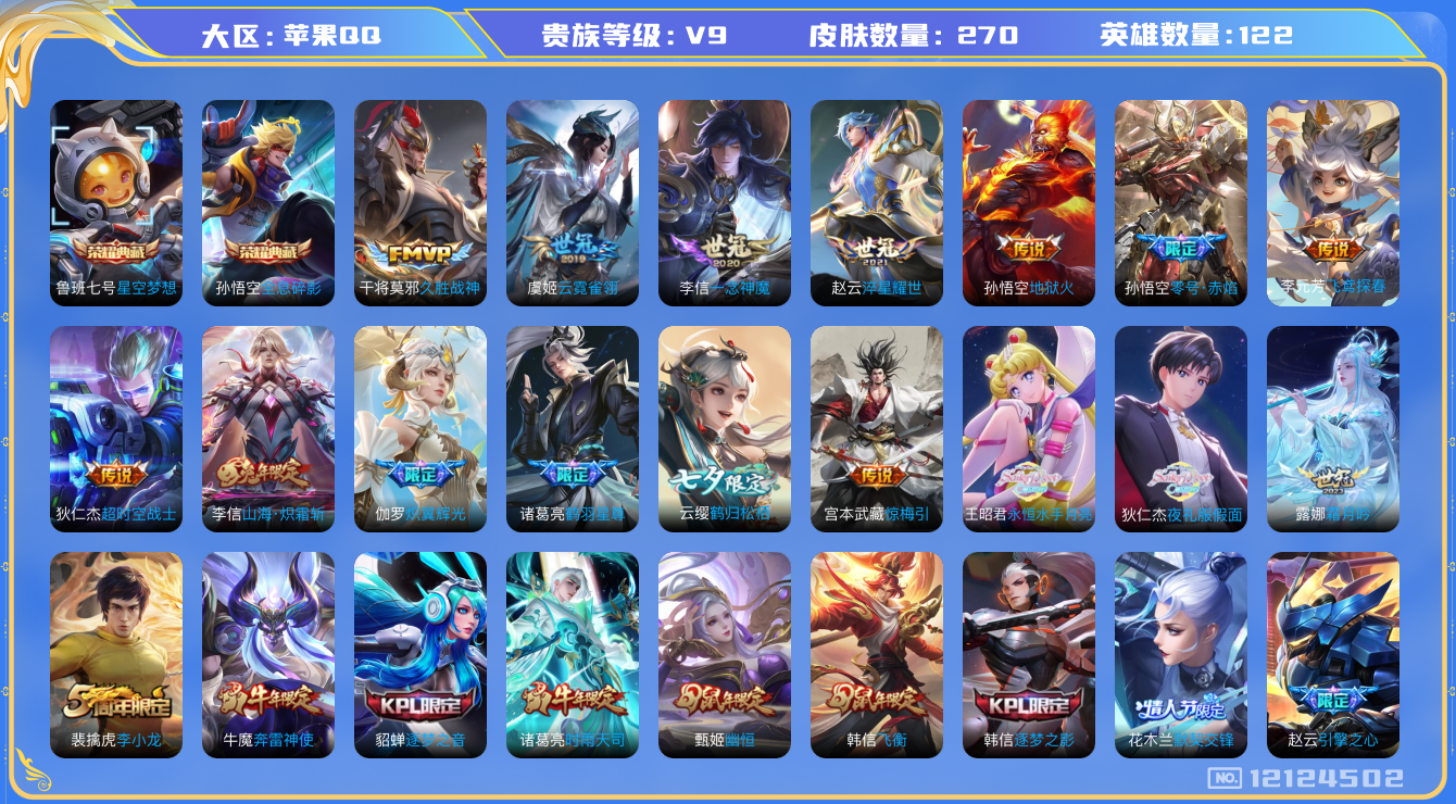 [12124502]【商品标题】:苹果Q-V9-至尊星耀IV段位-124英雄-270皮肤-2典藏-0珍品无双-0无双-0珍品传说-23传说-62史诗