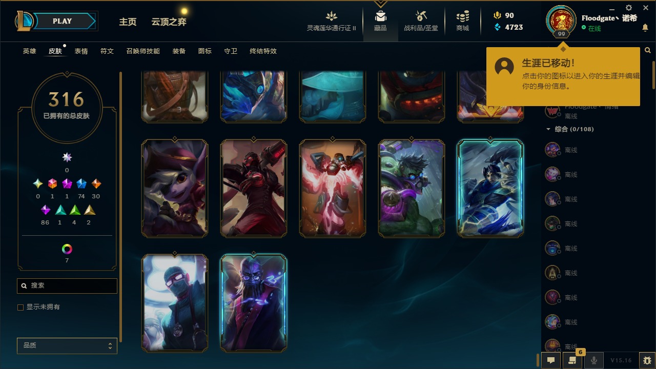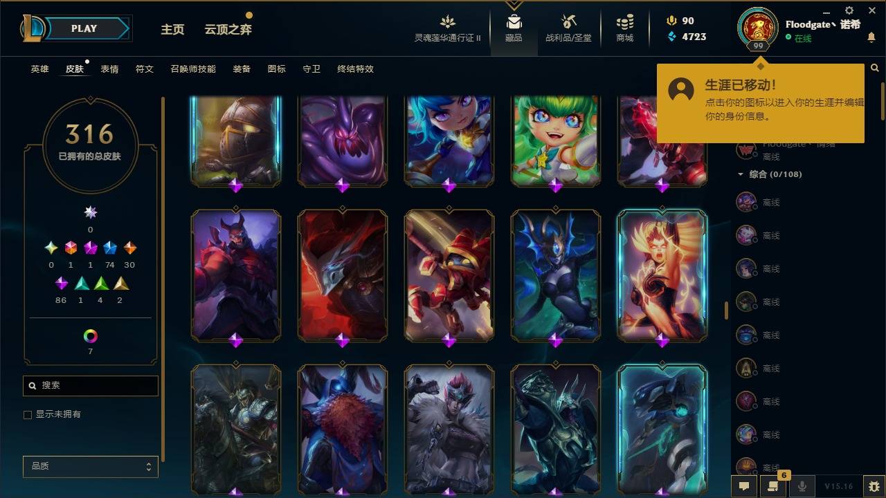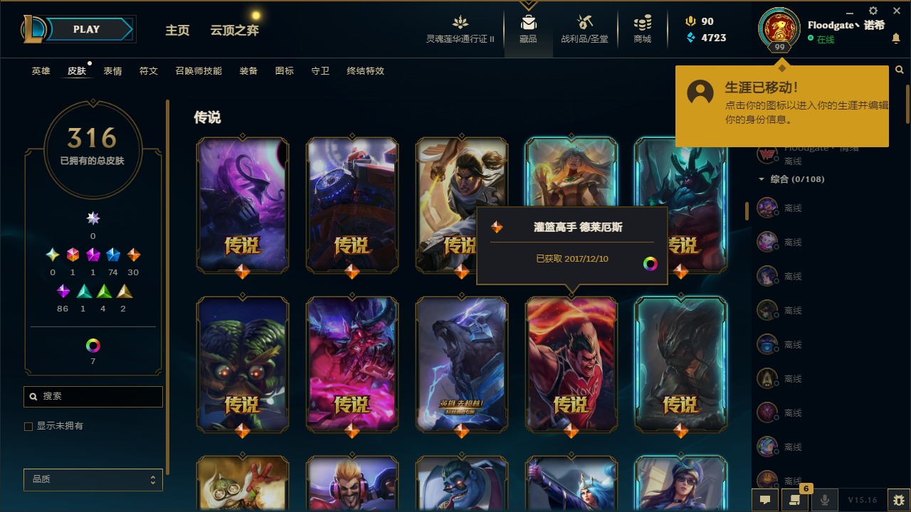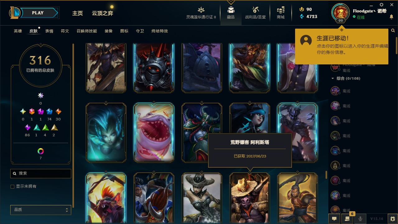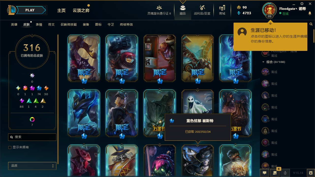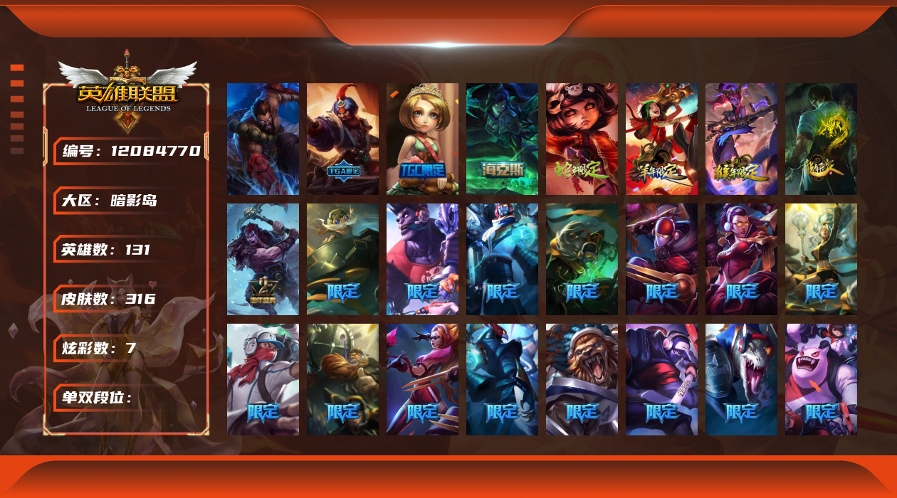 [12084770]1终极 1神话 74限定 30传说 86史诗 316皮肤 7炫彩 131英雄 靓号没买断要续费 可二次 可修改实名 优质装备:巧克力工坊 波比,创世纪 希维尔,都铎王朝 图奇,防爆机器人 布里茨,防爆士兵 炼金,钢铁之翼 凤凰,冠军典狱长 锤石,冠军之矛 滑板鞋,冠军之血 希瓦娜,红桃杰克 崔斯特,惊悚派对 阿木木,蓝色忧郁 崔斯特,蒙多蒙多,密林猎手 提莫,女猎手 希维尔,诺斯费拉图 弗拉基米尔,糖果使徒 费德提克,野兽猎人 瑟庄妮,野兽猎人 泰达米尔,永恒之森 乐芙兰,勇者 阿狸,灵魂守卫,外星装甲 库奇 海克斯:摄魂 薇恩 限定:奥斯曼大帝 普朗克,舞会公主 安妮 赛季限定皮:胜利枪神 格雷福斯,胜利女神 奥利安娜,胜利之剑 剑魔 冠军限定系列:S1FNC 酒桶,S1FNC 迦娜,S1FNC 卡尔萨斯,S1FNC 库奇,S2 暗杀星 蒙多,S2 暗杀星 努努,S2 暗杀星 慎,S3 SKT T1 劫,S3 SKT T1 薇恩,S3 SKT T1 婕拉,S4 SSW 雷恩加尔,S4 SSW 炼金,S5 SKT T1 雷克顿,S5 SKT T1 瑞兹,S5 SKT T1 阿兹尔 冰雪节限定:“主人不要我了” 阿木木,冰雪节 炼金,冰雪女神 辛德拉,冬季仙境 卡尔玛,胡桃夹子 小丑,平安夜女神 娑娜,魄罗骑士 瑟庄妮,圣诞开心鬼 提莫,圣诞精灵 崔丝塔娜,圣诞狂欢 努努,圣诞老人 布隆,圣诞老人 酒桶,圣诞糖果棒 厄运小姐,圣诞玩偶 波比,圣诞驯鹿 克格莫,冰雪节 茂凯,幸福女神 乐芙兰,雪默丁格 泳池派对:泳池派对 男枪,泳池派对 厄运小姐,泳池派对 菲奥娜,泳池派对 雷克顿,泳池派对 李青 万圣节限定:鬼影森森 茂凯,鬼影重重 魔腾,海贼 瑞兹,南瓜头 费德提克 年限:龙年 李青,蛇年 安妮,羊年 金克丝,猴年 凯特琳 周年:2周年 德莱厄斯