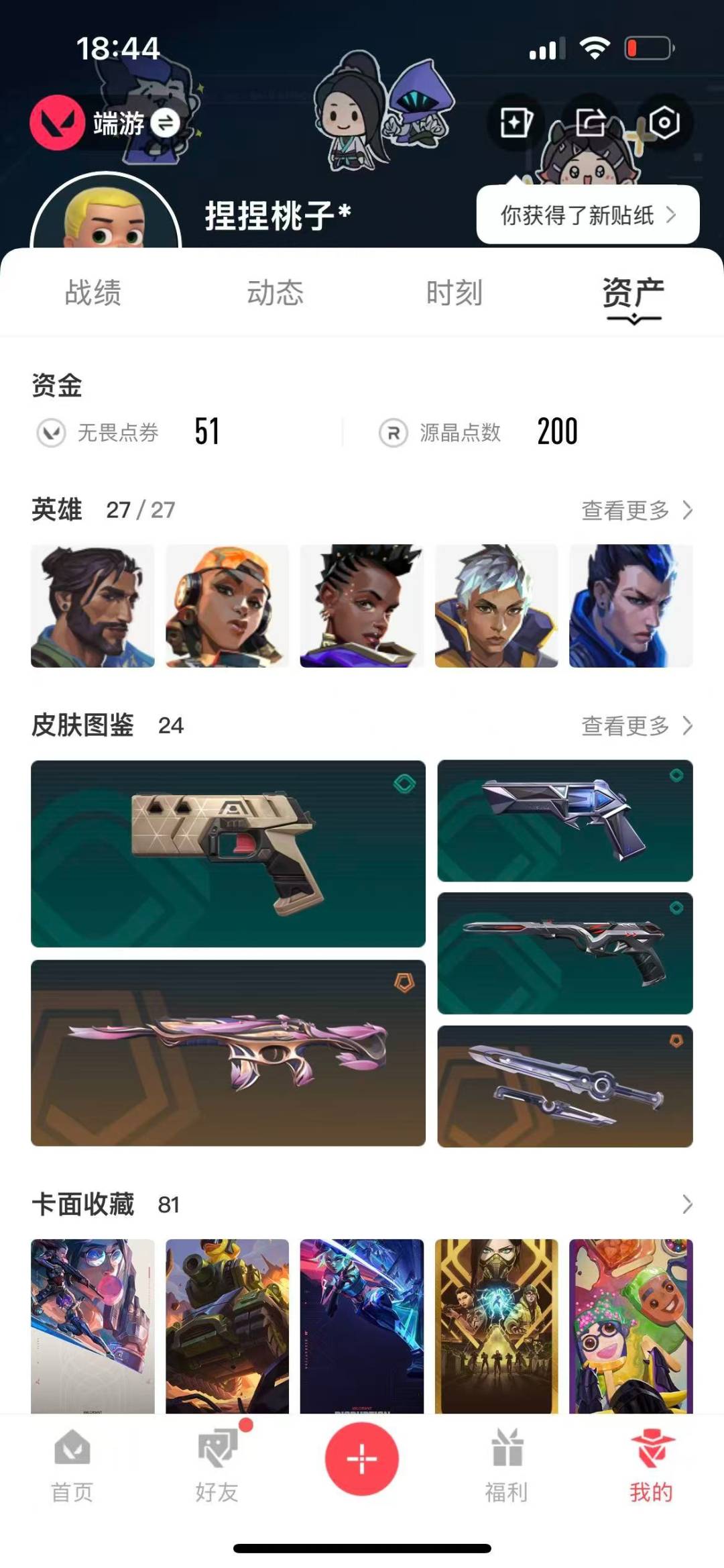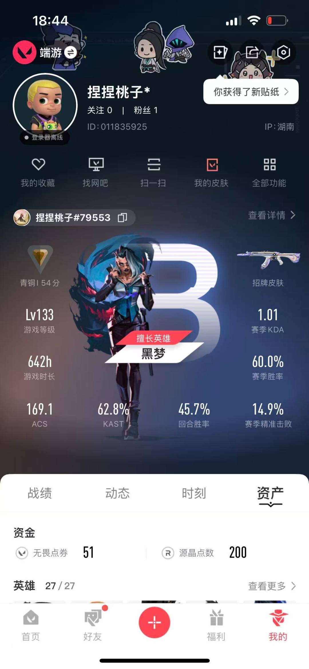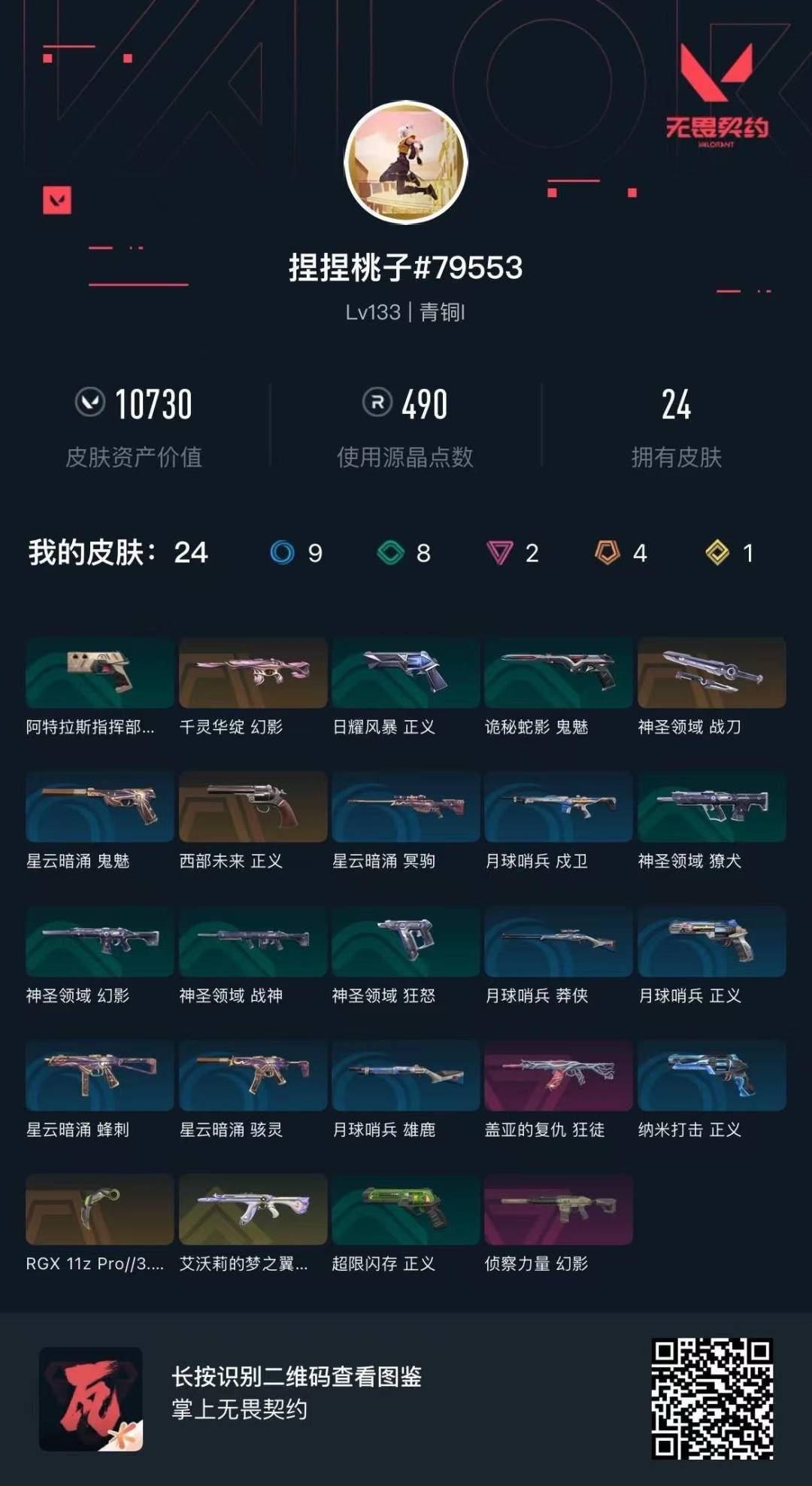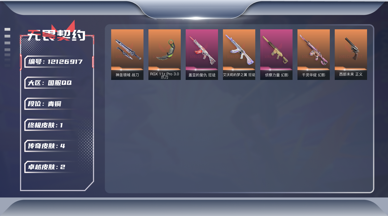 [12126917]4橙皮 1金皮 2紫皮 24皮肤 27英雄 81卡面 490已用源晶 青铜 优质装备:幻影-千灵华绽,狂徒-艾沃莉的梦之翼,狂徒-盖亚的复仇,幻影-侦察力量,爪刀-RGX 11z Pro 3.0,神圣领域 战刀 佩枪皮肤:正义-西部未来