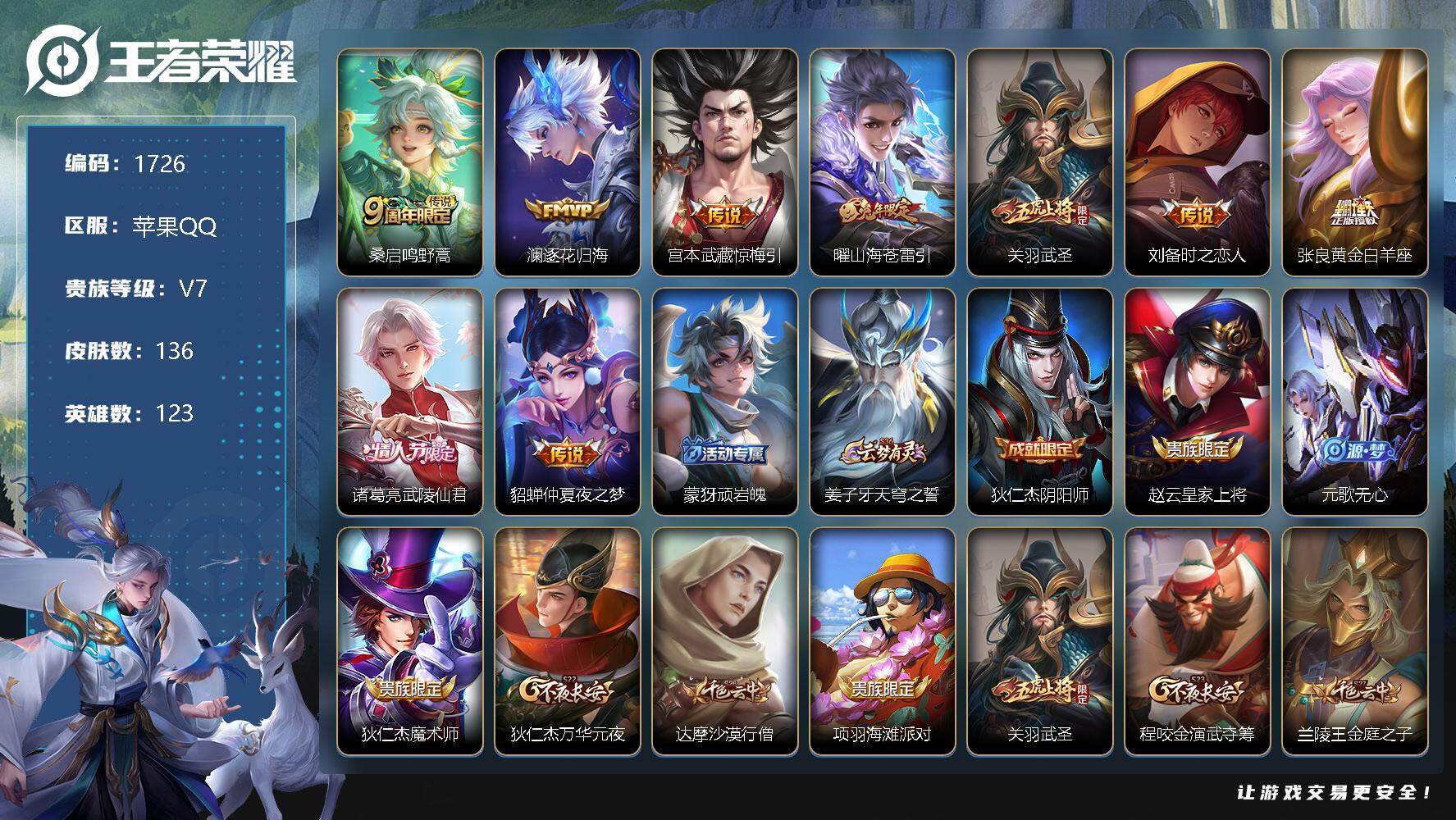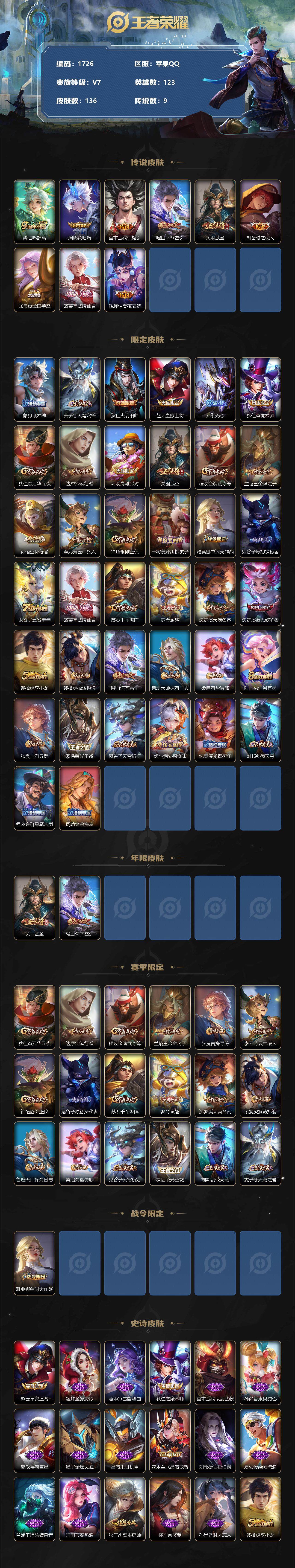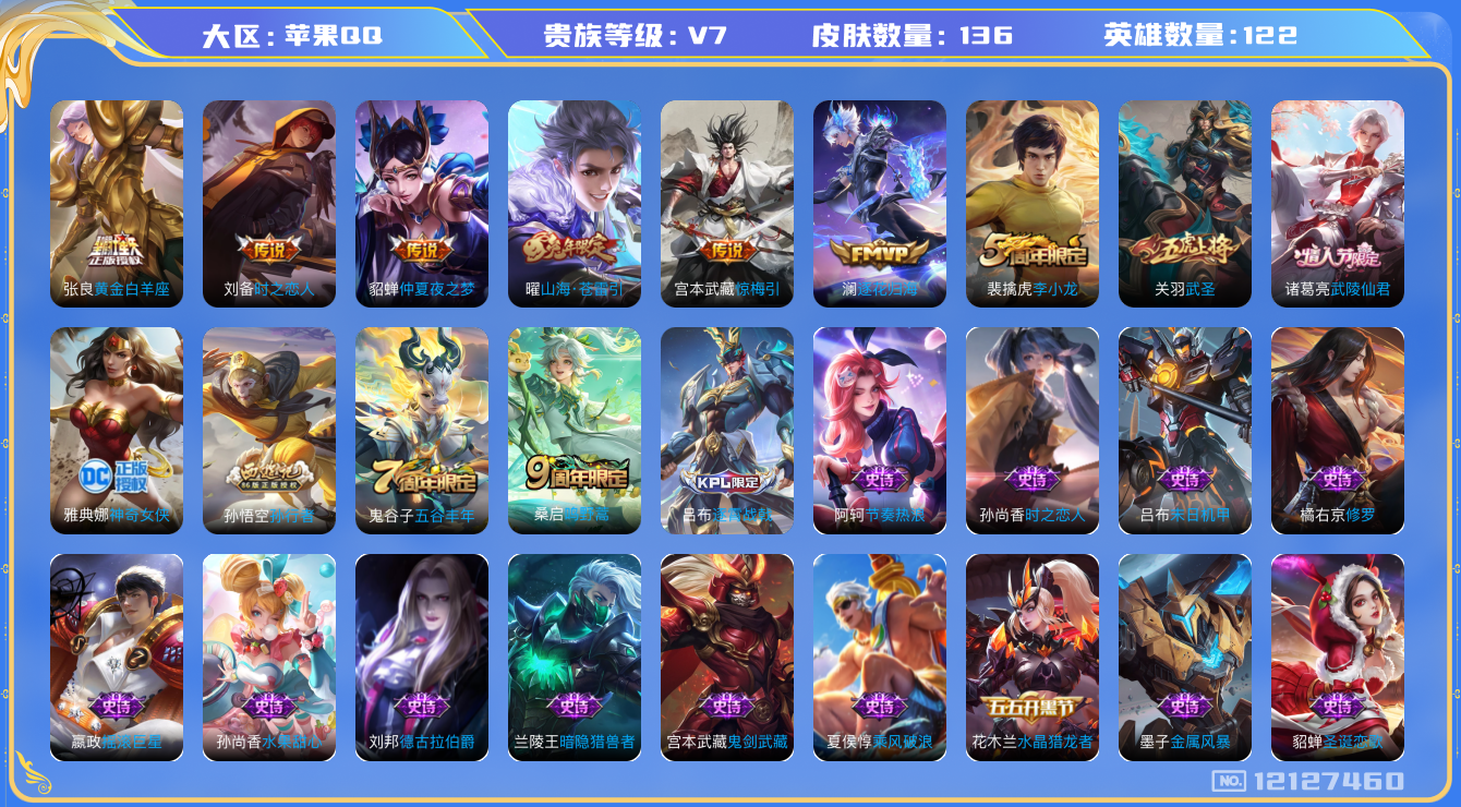 [12127460]【商品标题】:苹果Q-V7-永恒钻石V7段位-123英雄-136皮肤-0典藏-0珍品无双-0无双-0珍品传说-9传说-29史诗