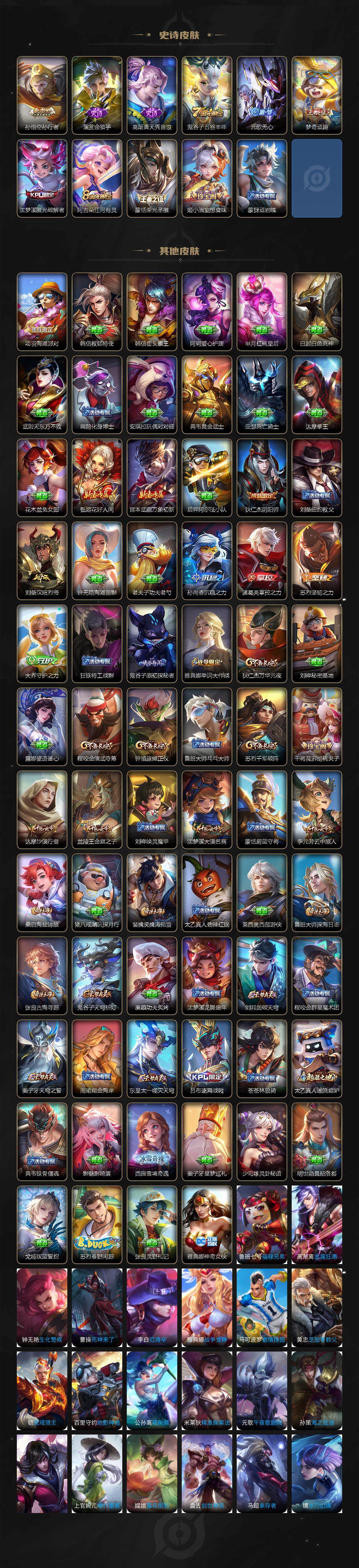 【史诗皮肤】:赵云皇家上将,貂蝉圣诞恋歌,甄姬冰雪圆舞曲,狄仁杰魔术师,宫本武藏鬼剑武藏,孙尚香水果甜心,嬴政摇滚巨星,墨子金属风暴,吕布末日机甲,花木兰水晶猎龙者,刘邦德古拉伯爵,夏侯惇乘风破浪,兰陵王暗隐猎兽者,阿轲节奏热浪,狄仁杰鹰眼统帅,橘右京修罗,孙尚香时之恋人,裴擒虎李小龙,孙悟空孙行者,澜赏金猎手,高渐离天秀音浪,鬼谷子五谷丰年,元歌无心,梦奇顽趣,沈梦溪匿光破解者,阿古朵江河有灵,蒙恬荣光圣徽,姬小满妄想食味,蒙犽顽岩魄