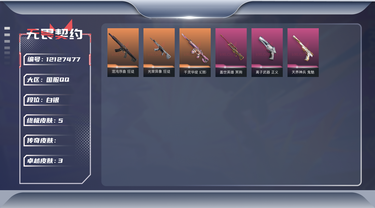 [12127477]【英雄】:炼狱,维斯,暮蝶,壹决,捷风,雷兹,不死鸟,贤者,猎枭,零,芮娜,奇乐,尚勃勒,霓虹,夜露,盖可,黑梦,钢锁 【狂徒】:狂徒-混沌序曲,狂徒-光荣异象 【幻影】:幻影-千灵华绽 【冥驹】:冥驹-盖世英雄 【正义】:正义-离子武器 【鬼魅】:鬼魅-天界神兵,鬼魅-诡秘蛇影 【卡面】:从黄昏到黎明 卡面,欢迎来到底城 卡面,南瓜盛典 卡面,无畏契约:暮蝶 卡面,正义的化身 卡面,树懒大作战 卡面,Clutch 卡面,聚合之力 卡面,无畏契约GO!第一卷:芮娜 卡面,无畏契约GO!第一卷:零 卡面,比比看谁快? 卡面,无垠星环 卡面,光导纤维 卡面,无畏契约GO!第一卷:贤者 卡面,代号红色 卡面,新兵报到 卡面,V契约 卡面,无畏契约 卡面 【喷漆】:都算到了 喷漆,伤心心 喷漆,买装还是存钱 喷漆,关门放狗 喷漆,无畏契约GO!第一卷:贤者 喷漆,放下武器 喷漆,胜利属于无畏契约 喷漆,GLHF 喷漆,无畏契约 喷漆 【挂饰】:薰衣草之心 挂饰,天外飞客 挂饰,《双城之战》魄罗 挂饰,无畏契约 纪念币 挂饰