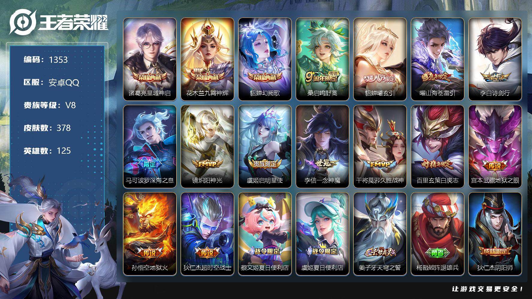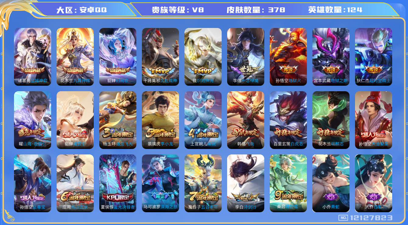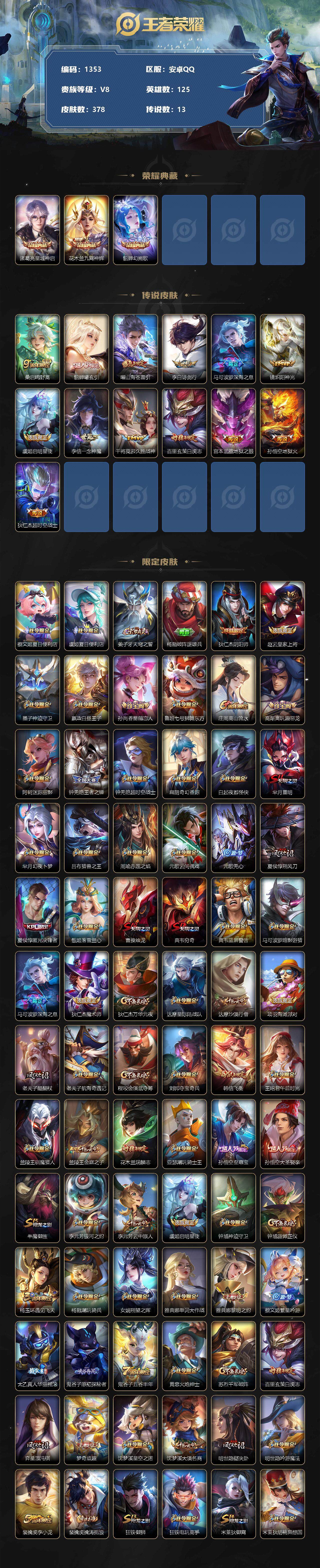 [12127823]【商品标题】:安卓Q-V8-最强王者段位-125英雄-378皮肤-3典藏-0珍品无双-0无双-0珍品传说-13传说-118史诗