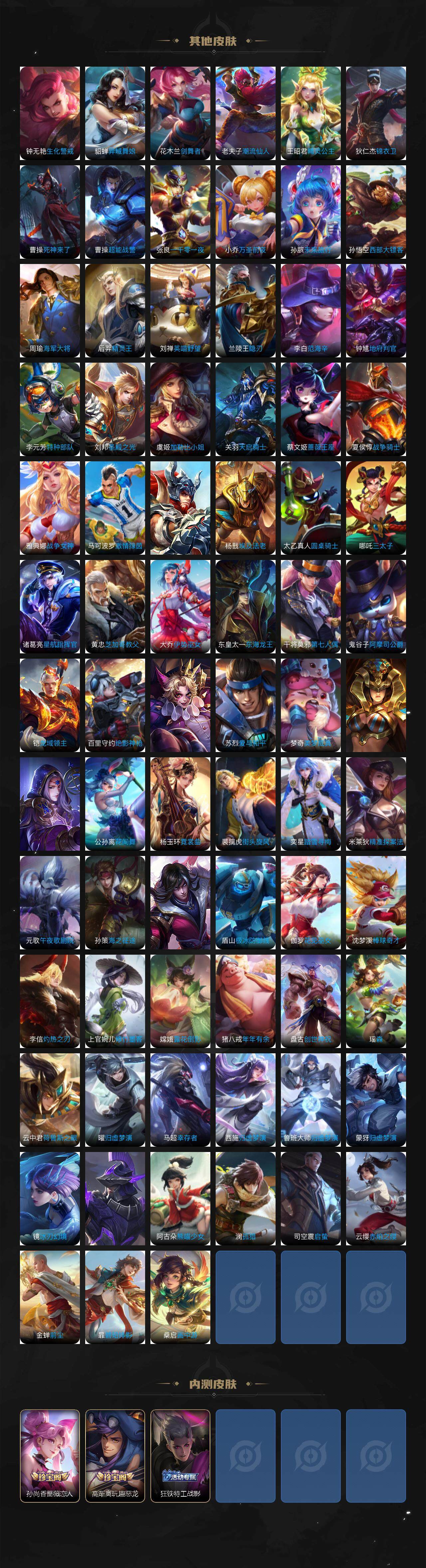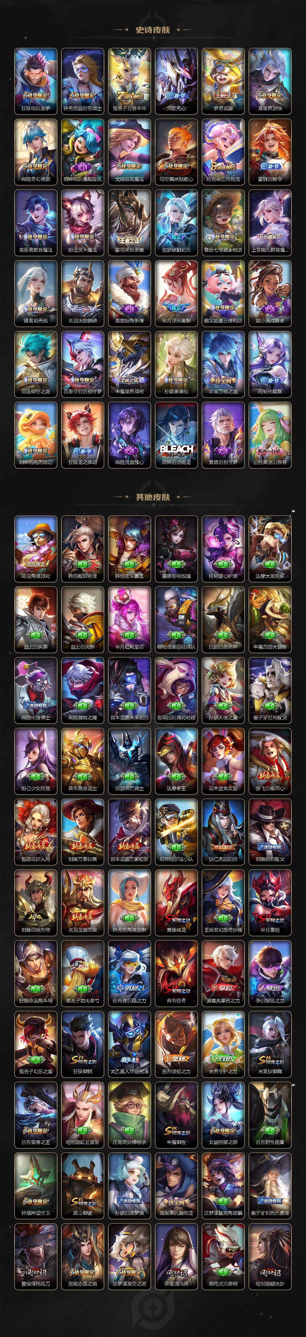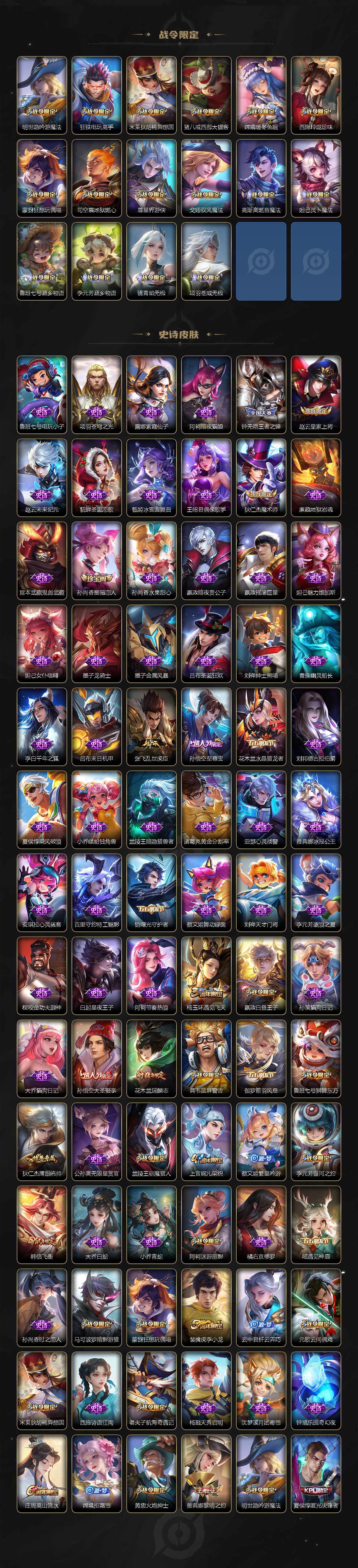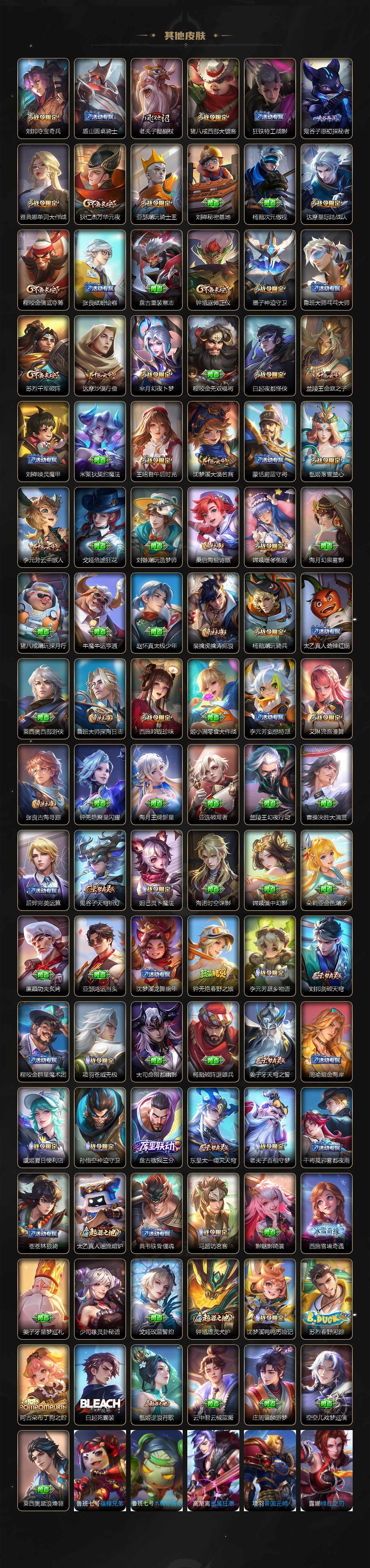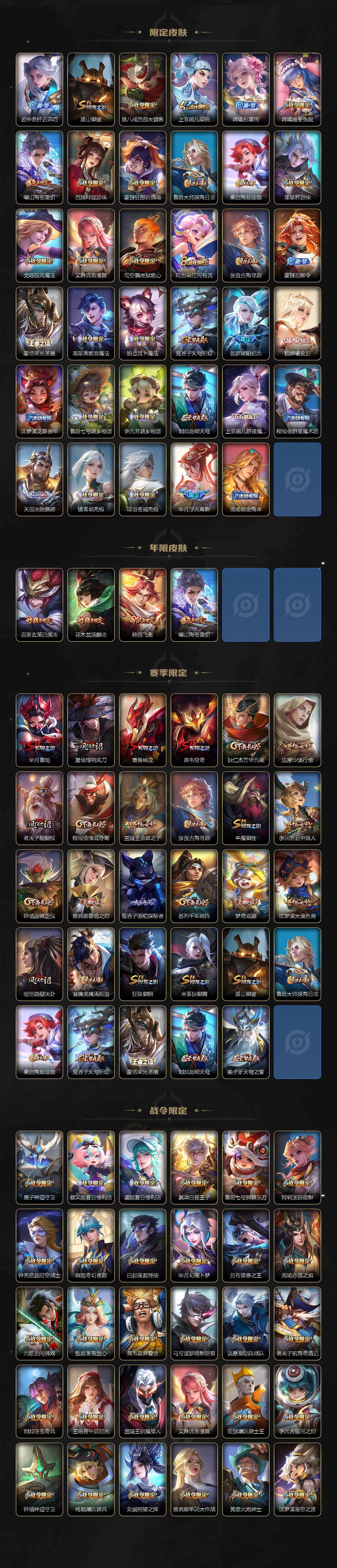 【限定皮肤】:蔡文姬夏日便利店,虞姬夏日便利店,姜子牙天穹之誓,杨戬破阵退雄兵,狄仁杰阴阳师,赵云皇家上将,墨子神迹守卫,嬴政白昼王子,孙尚香蔷薇恋人,鲁班七号狮舞东方,庄周高山流水,高渐离玩趣恶龙,阿轲迷踪丽影,钟无艳王者之锤,钟无艳超时空战士,扁鹊奇幻香踪,白起夜都怪侠,芈月重明,芈月幻夜卜梦,吕布猎兽之王,周瑜赤莲之焰,元歌云间偶戏,元歌无心,夏侯惇朔风刀,夏侯惇匿光决锋者,甄姬落雪兰心,曹操烛龙,典韦穷奇,典韦蓝屏警告,马可波罗暗影游猎,马可波罗深海之息,狄仁杰魔术师,狄仁杰万华元夜,达摩星际陆战队,达摩沙漠行僧,项羽海滩派对,老夫子醍醐杖,老夫子航海奇遇记,程咬金演武夺筹,刘邦夺宝奇兵,韩信飞衡,王昭君午后时光,兰陵王驯魔猎人,兰陵王金庭之子,花木兰瑞麟志,亚瑟潮玩骑士王,孙悟空至尊宝,孙悟空大圣娶亲,牛魔御旌,李元芳银河之约,李元芳云中旅人,虞姬启明星使,钟馗神迹守卫,钟馗驱傩正仪,杨玉环遇见飞天,杨戬潮玩骑兵,女娲朔望之晖,雅典娜单词大作战,雅典娜黎明之约,蔡文姬繁星吟游,太乙真人华丽摇滚,鬼谷子原初探秘者,鬼谷子五谷丰年,黄忠火炮绅士,苏烈千军破阵,百里玄策白虎志,弈星混沌棋,梦奇顽趣,沈梦溪星空之诺,沈梦溪大漠名商,明世隐疑决卦,明世隐吟游魔法,裴擒虎李小龙,裴擒虎擒涛扼浪,狂铁御狮,狂铁电玩高手,米莱狄御霄,米莱狄胡桃异想国,云中君纤云弄巧,盾山御銮,猪八戒西部大镖客,上官婉儿梁祝,嫦娥拒霜思,嫦娥暖冬兔眠,曜山海苍雷引,西施玲珑珍味,蒙犽狂想玩偶喵,鲁班大师探海日志,桑启海盐诗旅,暃星界游侠,戈娅驭风魔法,艾琳流音漫舞,司空震地狱燃心,阿古朵江河有灵,张良古海寻踪,蒙犽百解令,蒙恬荣光圣徽,高渐离燃音魔法,妲己灵卜魔法,鬼谷子天穹祈灯,伽罗琥珀纪元,貂蝉曦玄引,沈梦溪龙舞盛年,鲁班七号蔬乡物语,李元芳蔬乡物语,刘邦剑破天穹,上官婉儿群星魔术团,程咬金群星魔术