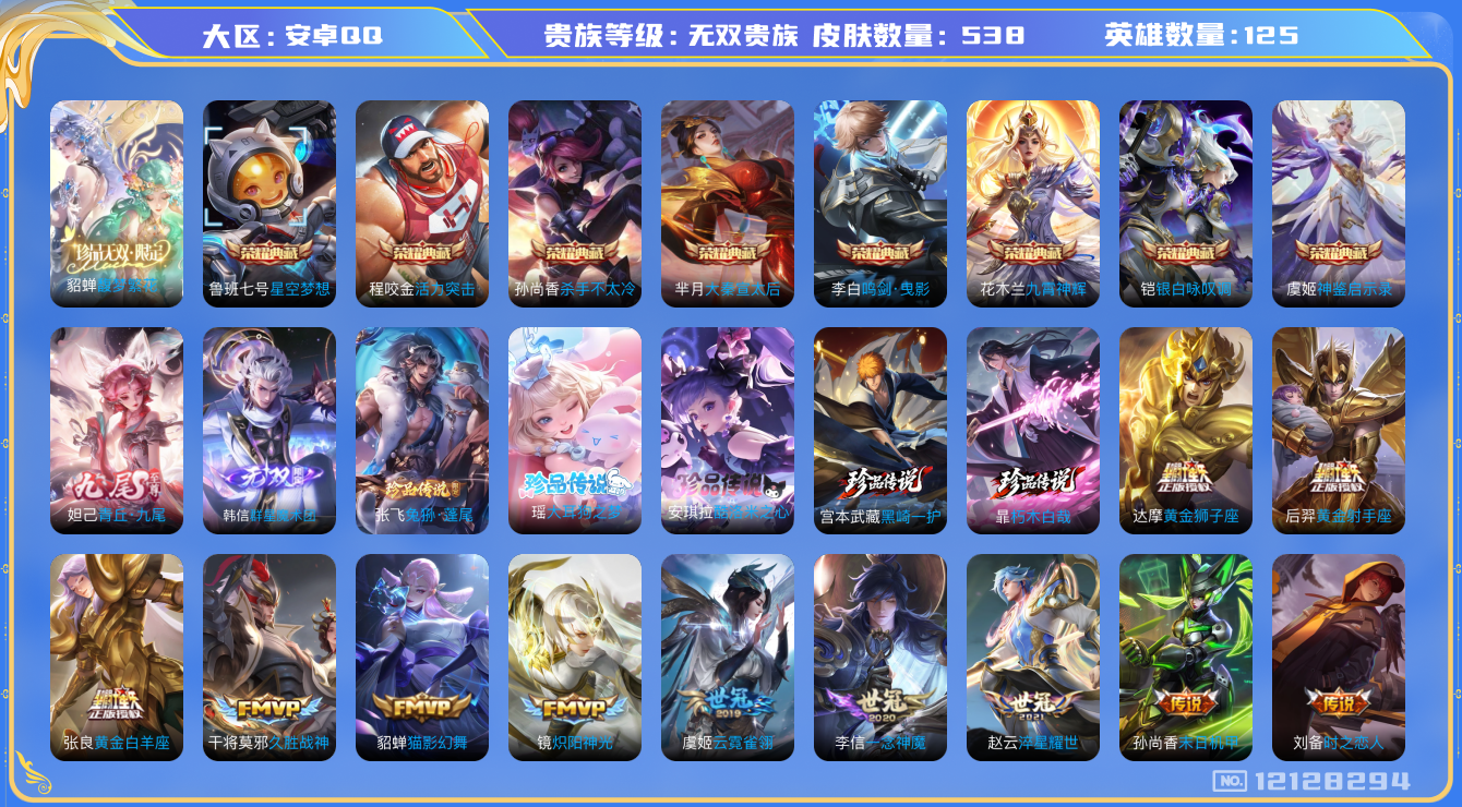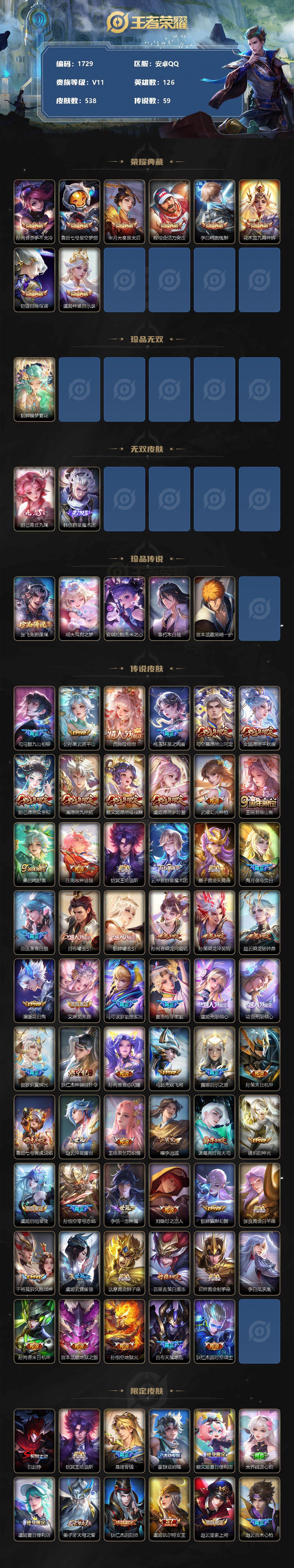 [12128294]【商品标题】:安卓Q-V11-永恒钻石II段位-126英雄-538皮肤-8典藏-1珍品无双-2无双-5珍品传说-59传说-180史诗