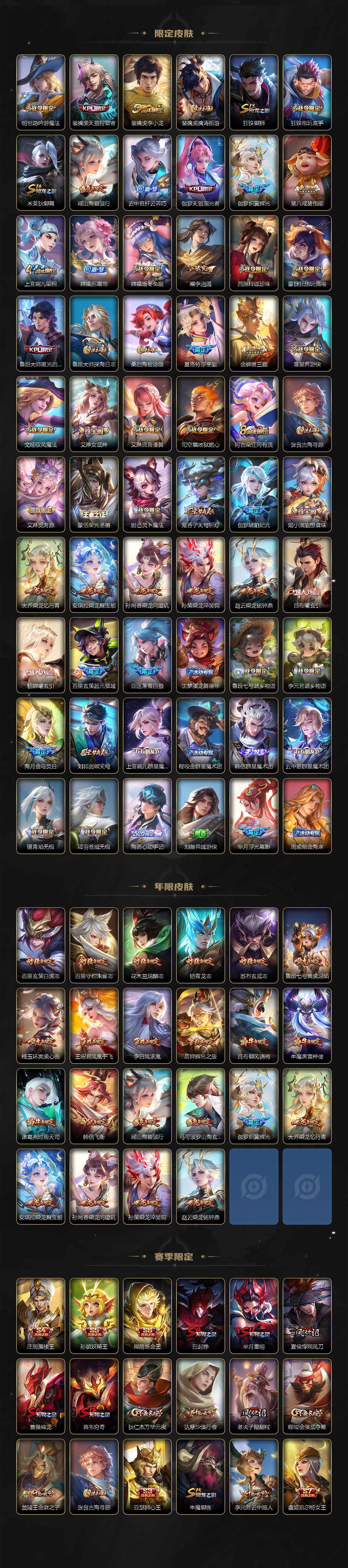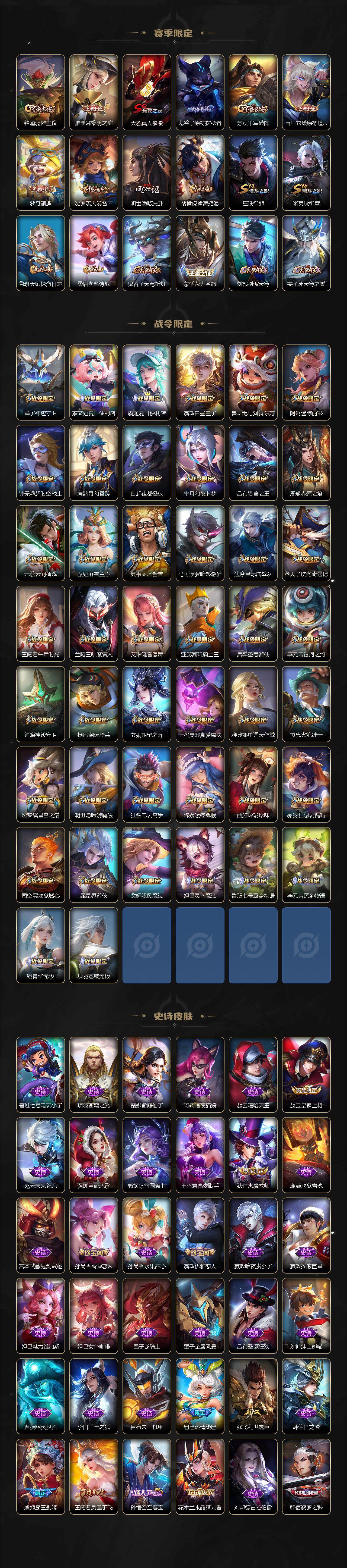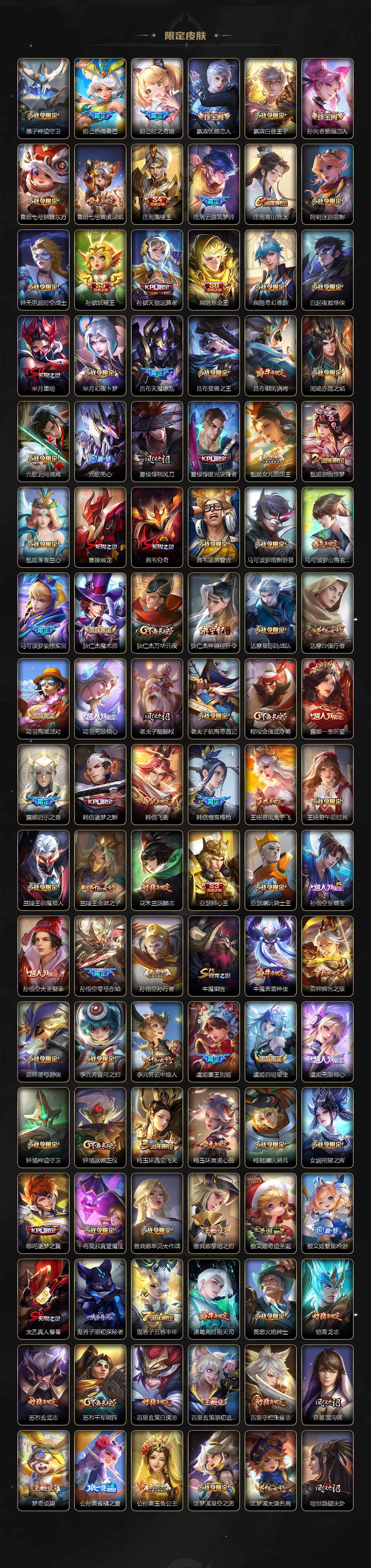 【限定皮肤】:白起狰,铠冥王哈迪斯,暃埋骨钱,蒙犽顽岩魄,蔡文姬夏日便利店,大乔绒语心约,虞姬夏日便利店,姜子牙天穹之誓,狄仁杰阴阳师,虞姬凯尔特女王,赵云皇家上将,赵云百木心枪,墨子神迹守卫,妲己热情桑巴,妲己时之奇旅,嬴政优雅恋人,嬴政白昼王子,孙尚香蔷薇恋人,鲁班七号狮舞东方,鲁班七号寅虎瑞焰,庄周蜃楼王,庄周云端筑梦师,庄周高山流水,阿轲迷踪丽影,钟无艳超时空战士,孙膑妖精王,孙膑天狼运算者,扁鹊炼金王,扁鹊奇幻香踪,白起夜都怪侠,芈月重明,芈月幻夜卜梦,吕布天魔缭乱,吕布猎兽之王,吕布御风骁将,周瑜赤莲之焰,元歌云间偶戏,元歌无心,夏侯惇朔风刀,夏侯惇匿光决锋者,甄姬女儿国国王,甄姬游园惊梦,甄姬落雪兰心,曹操烛龙,典韦穷奇,典韦蓝屏警告,马可