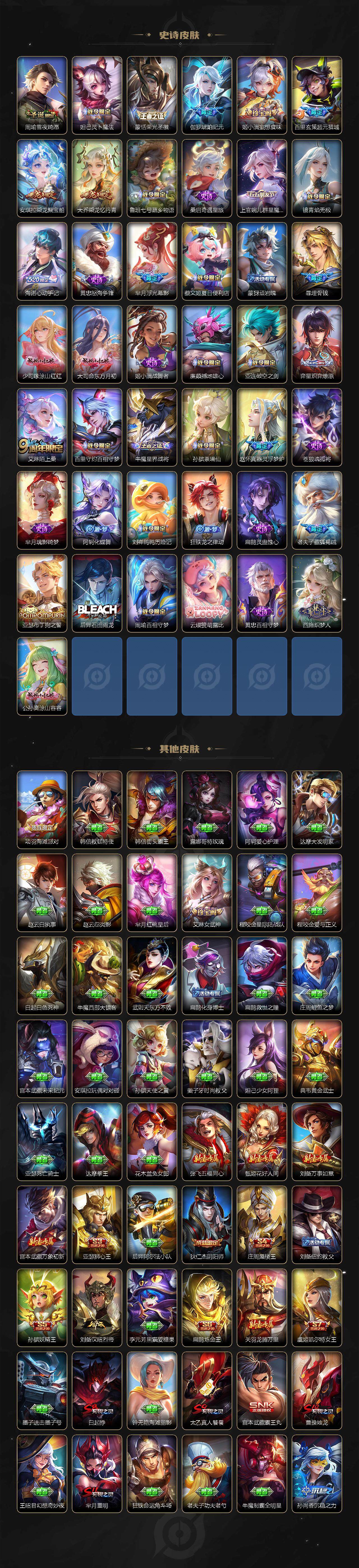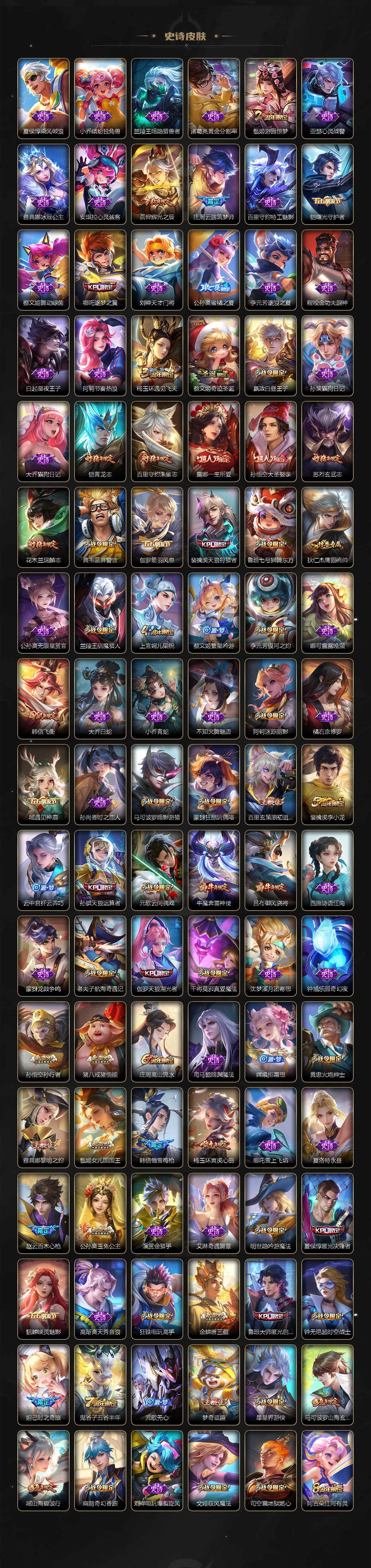 亚瑟狮心王,庄周蜃楼王,孙膑妖精王,扁鹊炼金王,虞姬凯尔特女王,白起狰,太乙真人饕餮,曹操烛龙,芈月重明,典韦穷奇,狂铁御狮,米莱狄御霄,牛魔御旌,夏侯惇朔风刀,明世隐疑决卦,老夫子醍醐杖,鬼谷子原初探秘者,狄仁杰万华元夜,程咬金演武夺筹,钟馗驱傩正仪,苏烈千军破阵,吕布猎兽之王,嬴政白昼王子,女娲朔望之晖,典韦蓝屏警告,钟馗神迹守卫,鲁班七号狮舞东方,沈梦溪星空之诺,李元芳银河之约,马可波罗暗影游猎,蒙犽狂想玩偶喵,元歌云间偶戏,弈星混沌棋,达摩沙漠行僧,兰陵王金庭之子,沈梦溪大漠名商,李元芳云中旅人,桑启海盐诗旅,裴擒虎擒涛扼浪,鲁班大师探海日志,张良古海寻踪,项羽苍威无极,镜青焰无极