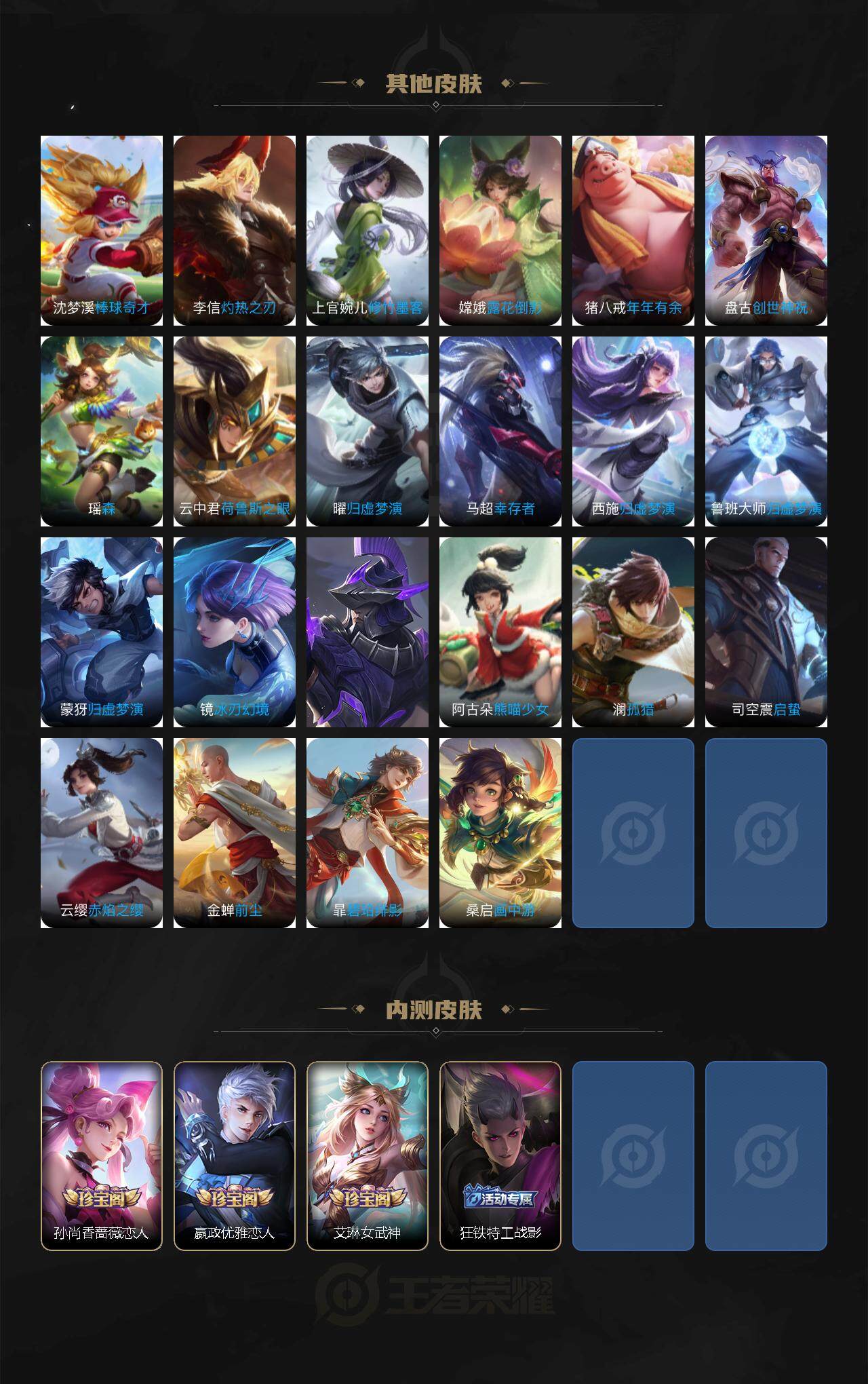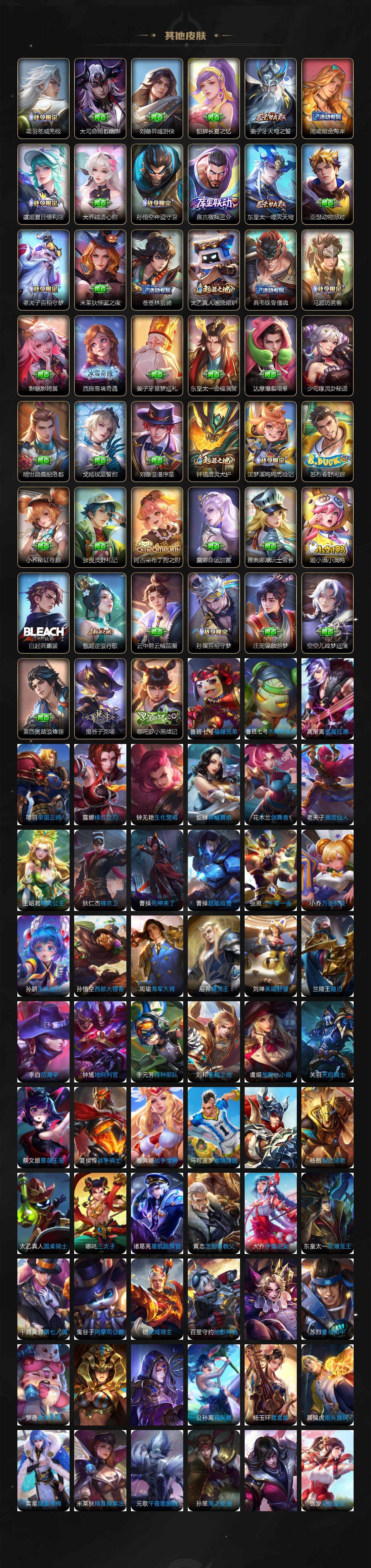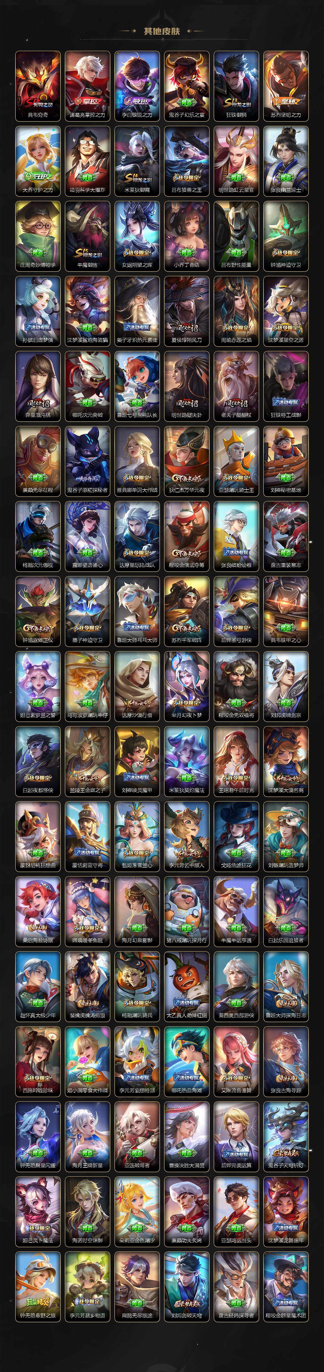 裴擒虎李小龙,上官婉儿梁祝,牛魔奔雷神使,吕布御风骁将,诸葛亮时雨天司,后羿辉光之辰,韩信飞衡,裴擒虎天狼狩猎者,孙膑天狼运算者,伽罗天狼溯光者,哪吒逐梦之翼,韩信逐梦之影,铠青龙志,百里玄策白虎志,花木兰瑞麟志,苏烈玄武志,百里守约朱雀志,王昭君凤凰于飞,虞姬霸王别姬,孙悟空大圣娶亲,露娜一生所爱,孙悟空至尊宝,妲己热情桑巴,蔡文姬奇迹圣诞,公孙离蜜橘之夏,庄周云端筑梦师,猪八戒猪悟能,孙悟空孙行者,甄姬女儿国国王,韩信傲雪梅枪,鲁班七号寅虎·瑞焰,杨玉环寅虎·心曲,赵云百木心枪,公孙离玉兔公主,露娜启示之音,夏侯惇匿光决锋者,金蝉唐三藏,鲁班大师匿光启智者,妲己时之奇旅,马可波罗山海·玄木吟,瑶山海·碧波行,桑启鸣野蒿,艾琳陌上桑,王昭君映山客,澜愿照·九州拓,蔡文姬愿照·福禄聚,虞姬愿照·岁时盈,司空震愿照·山河定,妲己愿照·众生和,女娲愿照·千秋盛