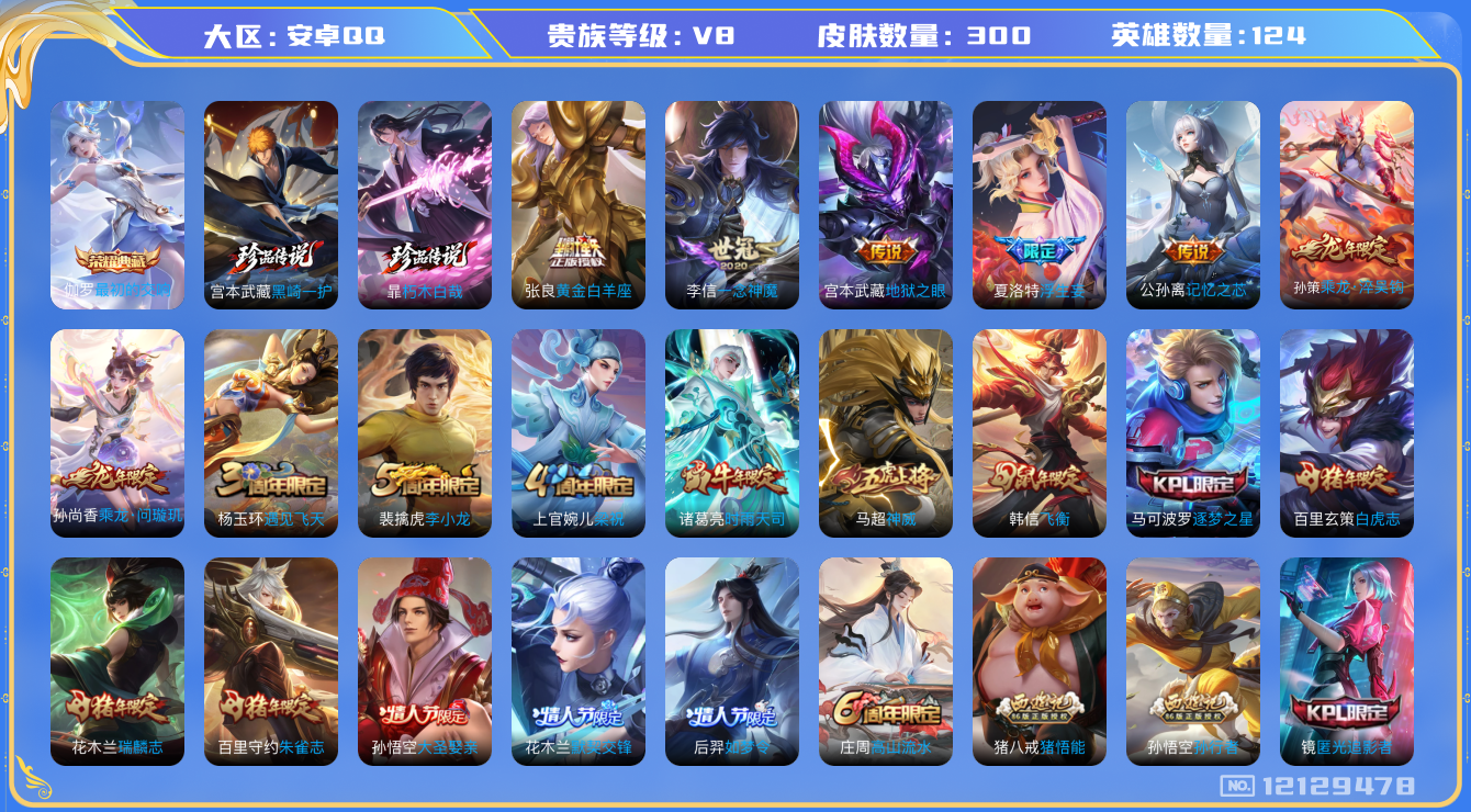 [12129478]【商品标题】:安卓Q-V7-永恒钻石I段位-125英雄-300皮肤-1典藏-0珍品无双-0无双-2珍品传说-13传说-97史诗