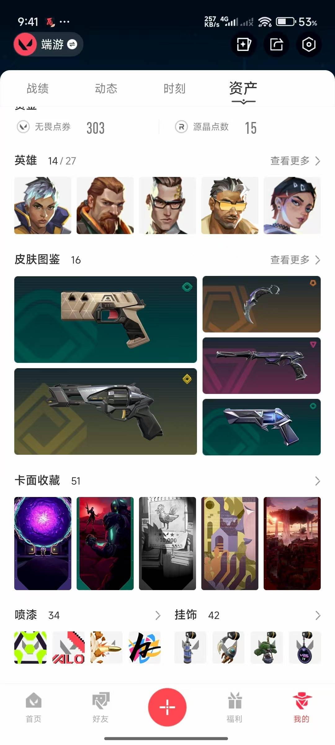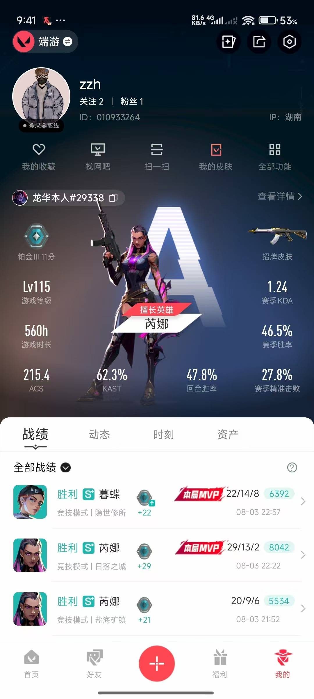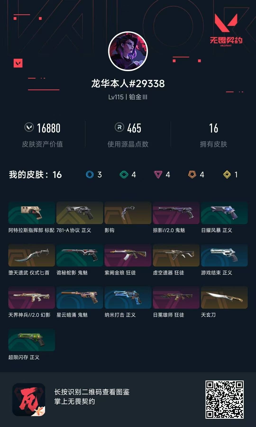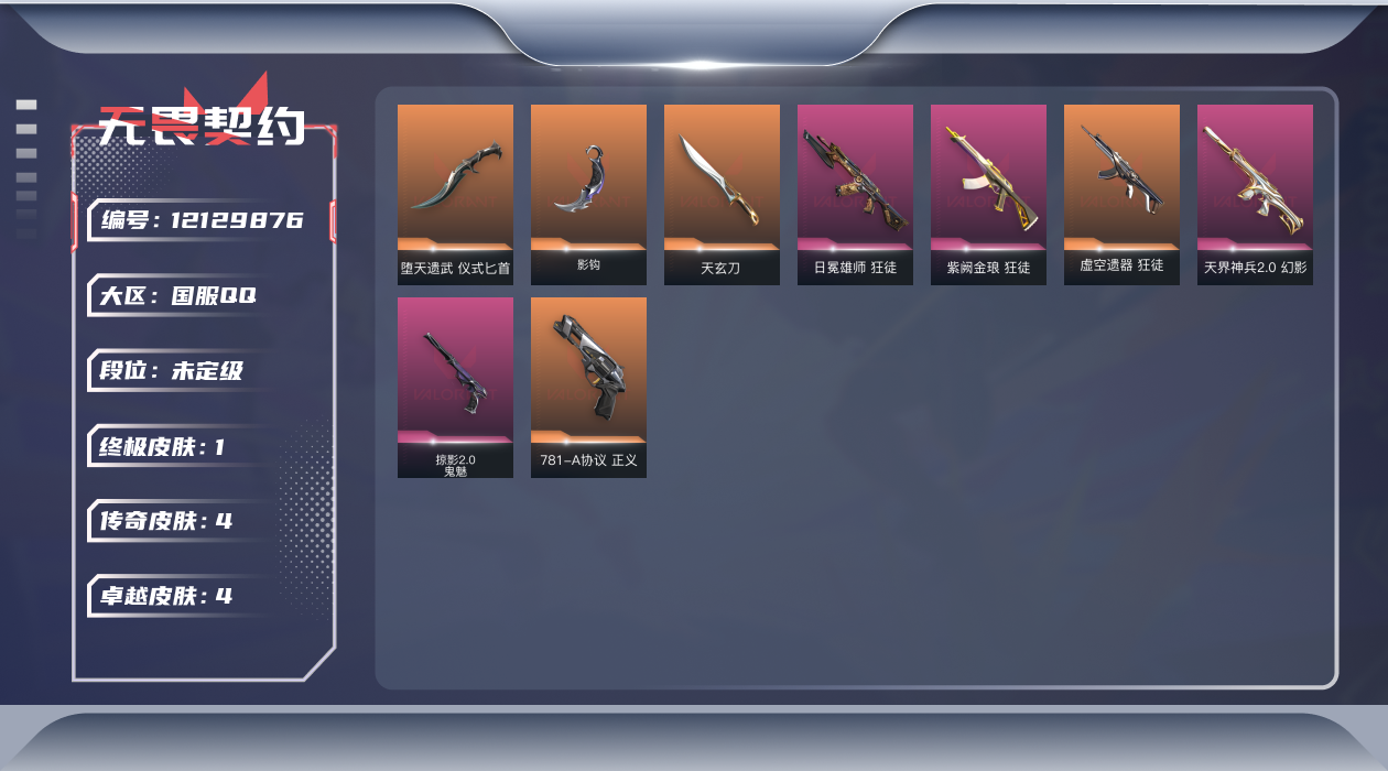 [12129876]4橙皮 1金皮 4紫皮 16皮肤 14英雄 51卡面 465已用源晶 未定级 优质装备:正义-781-A协议,狂徒-紫阙金琅,幻影-天界神兵2.0,狂徒-日冕雄师,天玄刀,堕天遗武 仪式匕首,影钩 佩枪皮肤:鬼魅-掠影2.0 步枪皮肤:狂徒-虚空遗器 1
