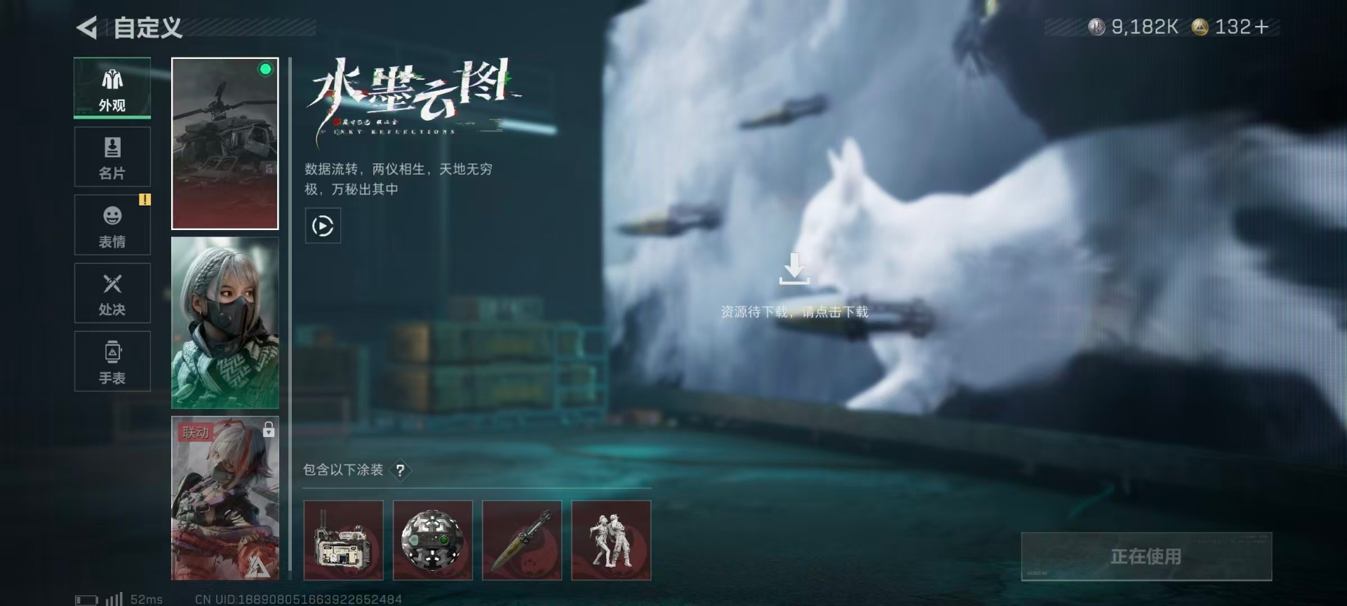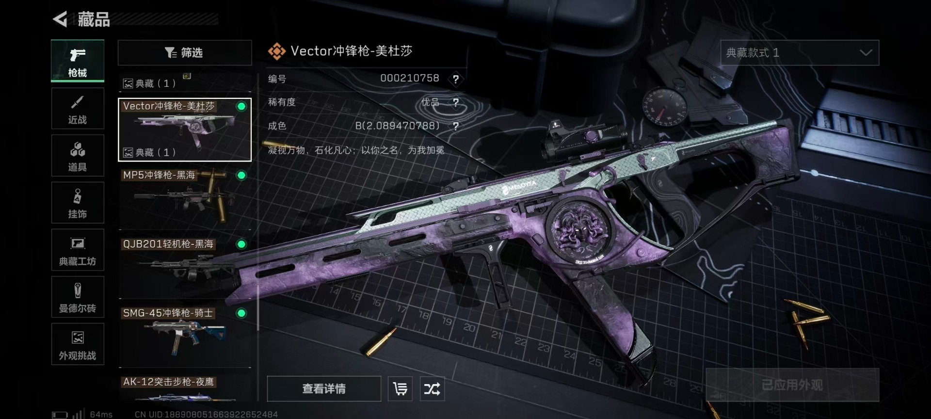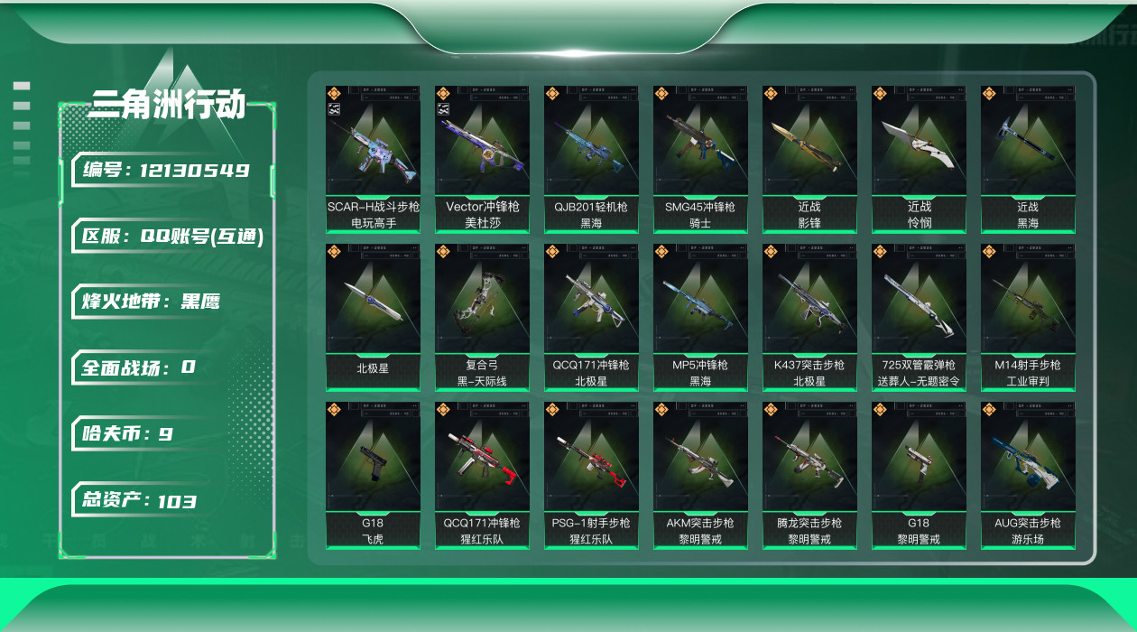 [12130549]总资产:103.9M 6干员外观 4近战传说 41传说枪械 哈夫币:9.182K 可二次 可修改实名 优质装备:近战-怜悯,近战-影锋,近战-黑海,近战-北极星,Vector冲锋枪-美杜莎,SCAR-H战斗步枪-电玩高手 烽火地带段位:黑鹰 全面战场段位:上等兵 传说武器皮肤:SCAR-H战斗步枪-水墨云图,SR-25射手步枪-水墨云图,AWM狙击步枪-影锋,M1014霰弹枪-影锋,M250通用机枪-游乐场,M870霰弹枪-游乐场,PSG-1射手步枪-猩红乐队,QCQ171冲锋枪-猩红乐队,K437突击步枪-猩红乐队,腾龙突击步枪-黎明警戒,AKM突击步枪-黎明警戒,G18-黎明警戒,G18-飞虎,AUG突击步枪-游乐场,G3战斗步枪-幻想曲,AK-12突击步枪-特斯拉线圈,SR-3M紧凑突击步枪-特斯拉线圈,UZI冲锋枪-特斯拉线圈,M250通用机枪-骑士之心,K416突击步枪-幻想曲,K437突击步枪-北极星,M14射手步枪-工业审判,SMG45冲锋枪-骑士,QCQ171冲锋枪-北极星,M16A4突击步枪-狩猎时刻,725双管霰弹枪-送葬人-无题密令,复合弓-黑-天际线,Vector冲锋枪-狩猎时刻,G3战斗步枪-狩猎时刻,ASh-12战斗步枪-怜悯,M4A1突击步枪-蚀金玫瑰,AK-12突击步枪-夜鹰,MP5冲锋枪-黑海,QJB201轻机枪-黑海,CAR-15突击步枪-黑鹰坠落 史诗武器皮肤:Vector冲锋枪-潜袭者,PSG-1射手步枪-原型机(典藏),MP7冲锋枪-原型机(典藏),AK-12突击步枪-原型机(典藏),M1014霰弹枪-潜袭者,QBZ95-1突击步枪-ACE,AUG突击步枪-特勤执行,M4A1突击步枪-特勤执行,Vector冲锋枪-红色彗星,SKS射手步枪-ACE,PKM通用机枪-蝮蛇,M700狙击步枪-蝮蛇,AUG突击步枪-蝮蛇,G3战斗步枪-战场英杰,SR-3M紧凑突击步枪-荒野求生,PKM通用机枪-荒野求生,M1014霰弹枪-林中猎手,SVD狙击步枪-荒野求生,PSG-1射手步枪-无垢,MP7冲锋枪-无垢,腾龙突击步枪-无垢,SV-98狙击步枪-林中猎手,PTR-32突击步枪-英雄,SV-98狙击步枪-囚徒,AS Val突击步枪-尖端治疗,M16A4突击步枪-竞赛选手,M700狙击步枪-守夜人,Vector冲锋枪-阿萨拉文明,SVD狙击