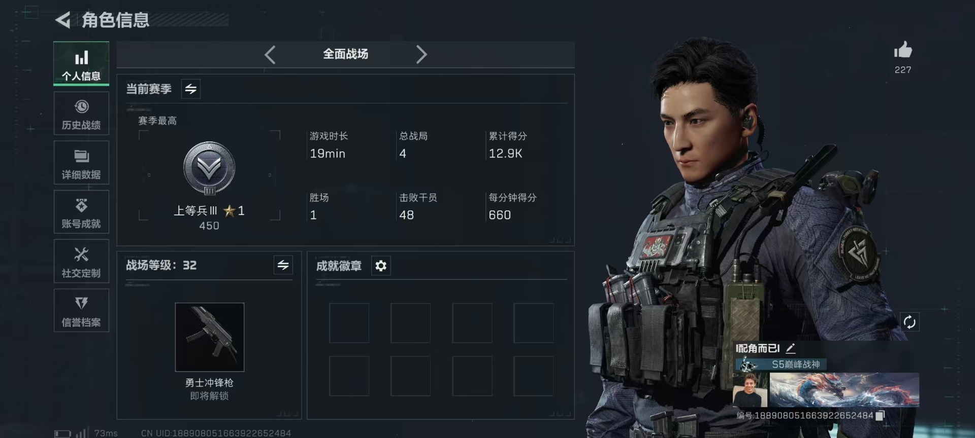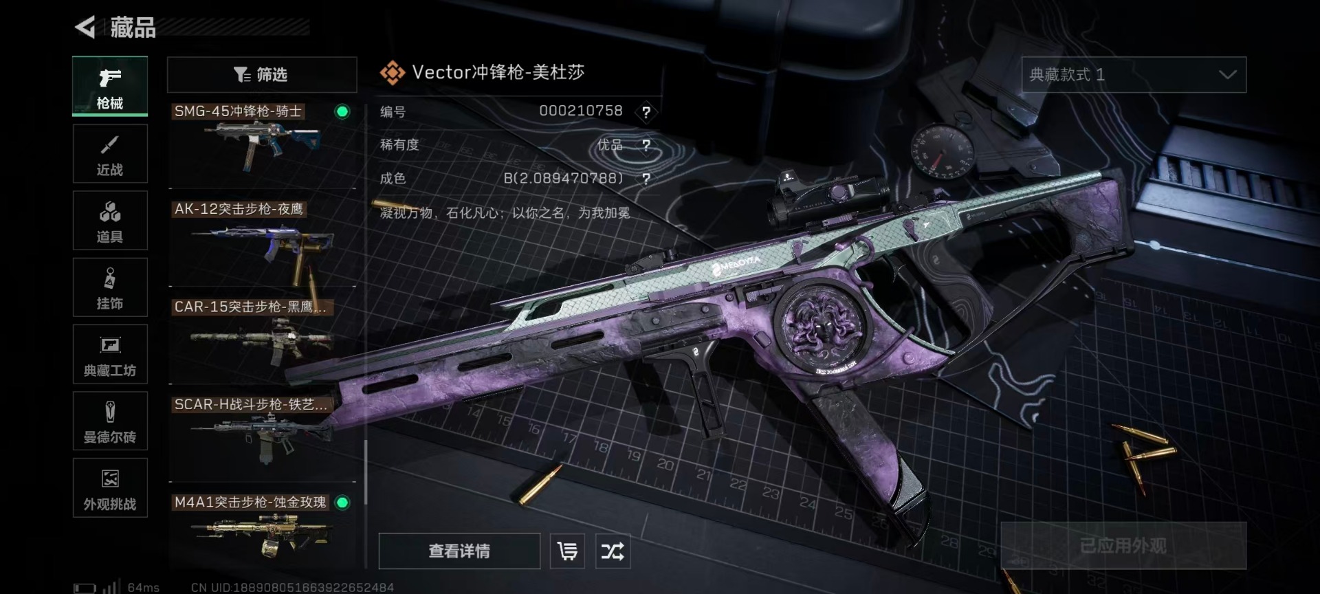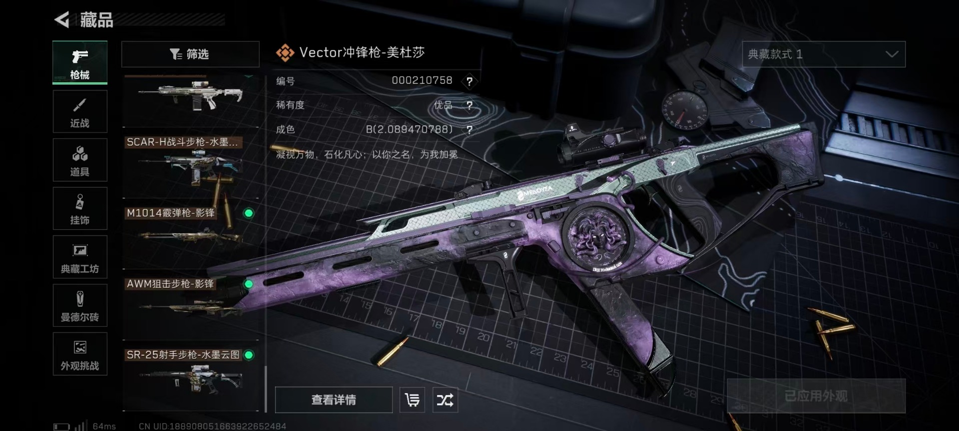 [12130549]总资产:103.9M 6干员外观 4近战传说 41传说枪械 哈夫币:9.182K 可二次 可修改实名 优质装备:近战-怜悯,近战-影锋,近战-黑海,近战-北极星,Vector冲锋枪-美杜莎,SCAR-H战斗步枪-电玩高手 烽火地带段位:黑鹰 全面战场段位:上等兵 传说武器皮肤:SCAR-H战斗步枪-水墨云图,SR-25射手步枪-水墨云图,AWM狙击步枪-影锋,M1014霰弹枪-影锋,M250通用机枪-游乐场,M870霰弹枪-游乐场,PSG-1射手步枪-猩红乐队,QCQ171冲锋枪-猩红乐队,K437突击步枪-猩红乐队,腾龙突击步枪-黎明警戒,AKM突击步枪-黎明警戒,G18-黎明警戒,G18-飞虎,AUG突击步枪-游乐场,G3战斗步枪-幻想曲,AK-12突击步枪-特斯拉线圈,SR-3M紧凑突击步枪-特斯拉线圈,UZI冲锋枪-特斯拉线圈,M250通用机枪-骑士之心,K416突击步枪-幻想曲,K437突击步枪-北极星,M14射手步枪-工业审判,SMG45冲锋枪-骑士,QCQ171冲锋枪-北极星,M16A4突击步枪-狩猎时刻,725双管霰弹枪-送葬人-无题密令,复合弓-黑-天际线,Vector冲锋枪-狩猎时刻,G3战斗步枪-狩猎时刻,ASh-12战斗步枪-怜悯,M4A1突击步枪-蚀金玫瑰,AK-12突击步枪-夜鹰,MP5冲锋枪-黑海,QJB201轻机枪-黑海,CAR-15突击步枪-黑鹰坠落 史诗武器皮肤:Vector冲锋枪-潜袭者,PSG-1射手步枪-原型机(典藏),MP7冲锋枪-原型机(典藏),AK-12突击步枪-原型机(典藏),M1014霰弹枪-潜袭者,QBZ95-1突击步枪-ACE,AUG突击步枪-特勤执行,M4A1突击步枪-特勤执行,Vector冲锋枪-红色彗星,SKS射手步枪-ACE,PKM通用机枪-蝮蛇,M700狙击步枪-蝮蛇,AUG突击步枪-蝮蛇,G3战斗步枪-战场英杰,SR-3M紧凑突击步枪-荒野求生,PKM通用机枪-荒野求生,M1014霰弹枪-林中猎手,SVD狙击步枪-荒野求生,PSG-1射手步枪-无垢,MP7冲锋枪-无垢,腾龙突击步枪-无垢,SV-98狙击步枪-林中猎手,PTR-32突击步枪-英雄,SV-98狙击步枪-囚徒,AS Val突击步枪-尖端治疗,M16A4突击步枪-竞赛选手,M700狙击步枪-守夜人,Vector冲锋枪-阿萨拉文明,SVD狙击