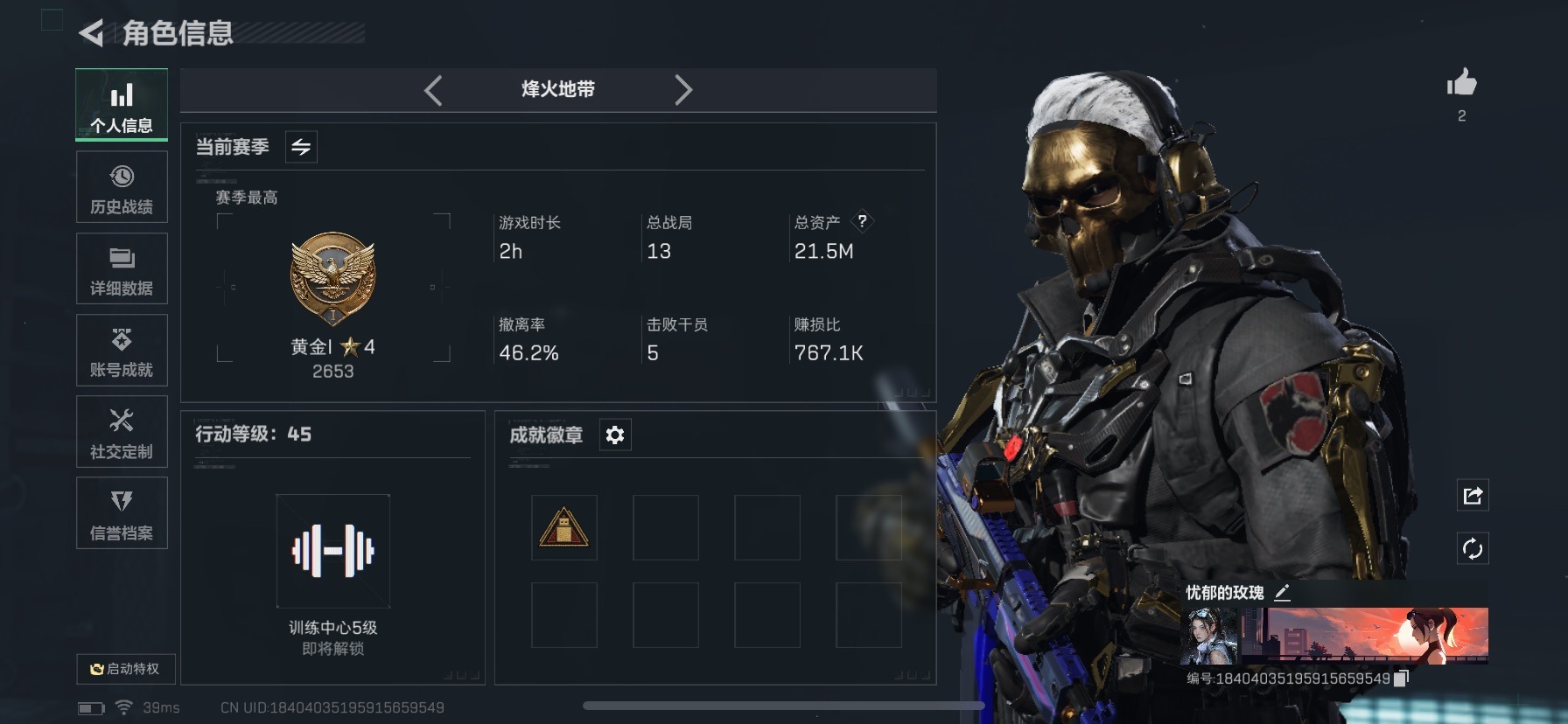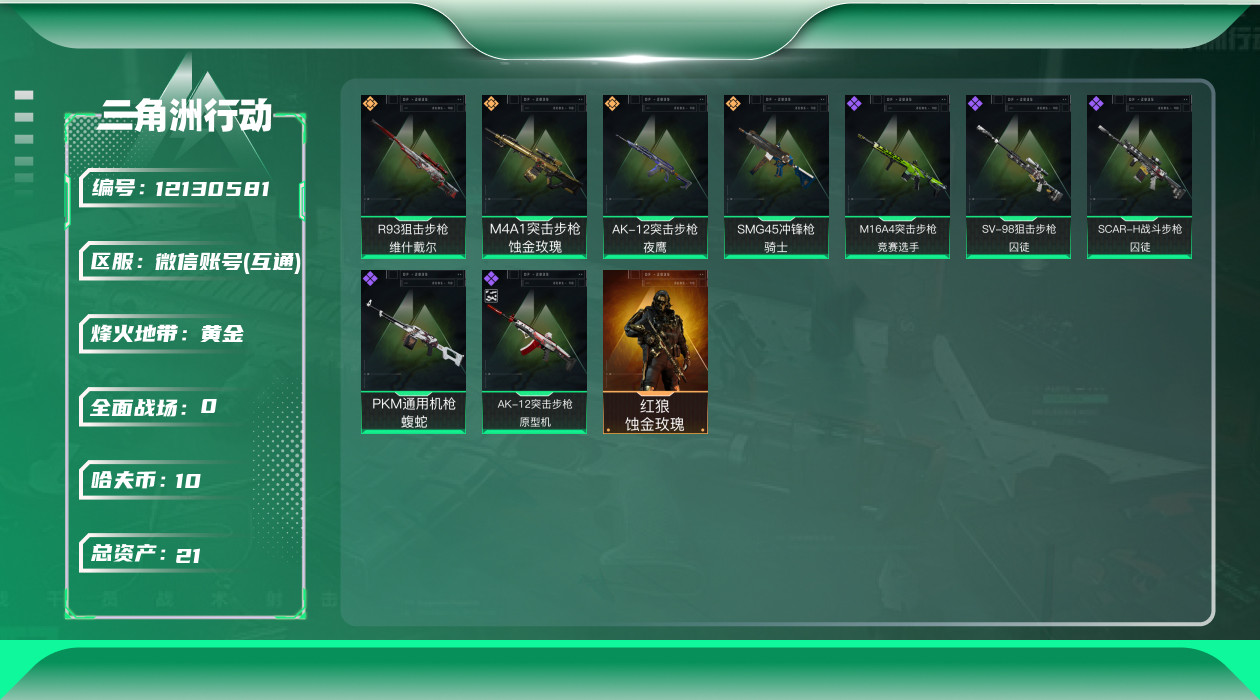 [12130581]总资产:21.5M 1干员外观 4传说枪械 哈夫币:10.811K 可二次 可修改实名 烽火地带段位:黄金 全面战场段位:无段位 传说武器皮肤:SMG45冲锋枪-骑士,M4A1突击步枪-蚀金玫瑰,AK-12突击步枪-夜鹰,R93狙击步枪-维什戴尔 史诗武器皮肤:AK-12突击步枪-原型机(典藏),PKM通用机枪-蝮蛇,SCAR-H战斗步枪-囚徒,SV-98狙击步枪-囚徒,M16A4突击步枪-竞赛选手 干员外观:红狼-蚀金玫瑰