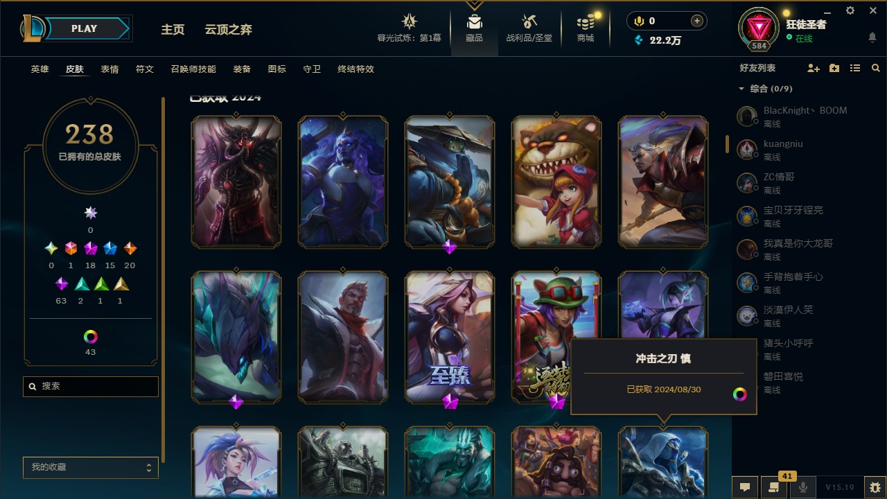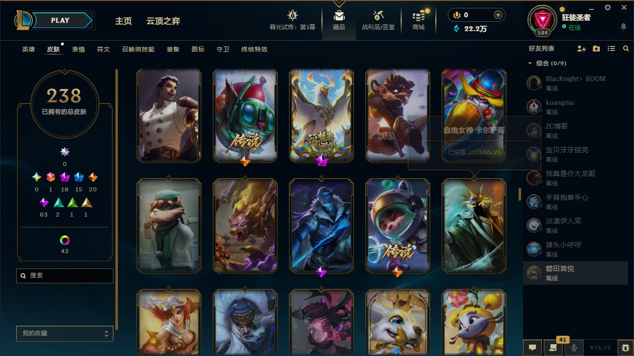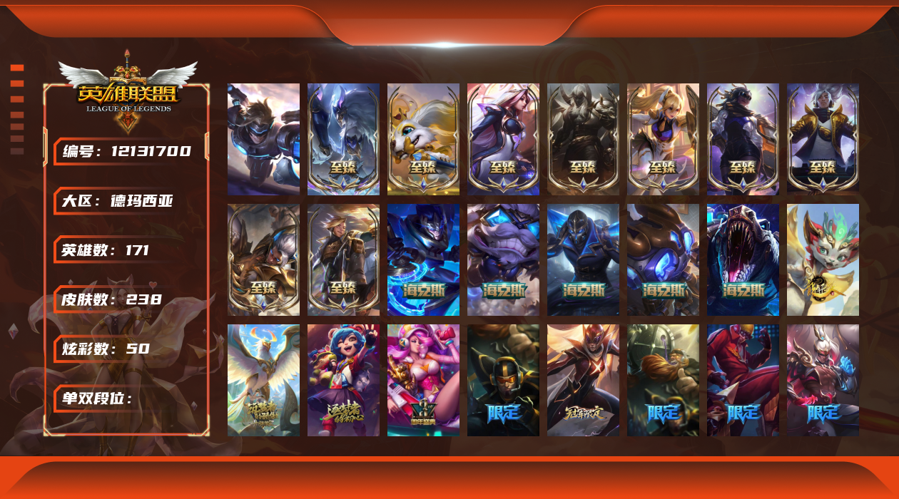 [12131700]1终极 18神话 15限定 20传说 63史诗 238皮肤 50炫彩 171英雄 可二次 可修改实名 优质装备:至臻 腥红之月 亚托克斯,至臻 绒毛菲兹,至臻 真实伤害 赛娜,至臻 战斗学院 蕾欧娜,至臻 灵能特工 伊泽瑞尔,至臻 神龙尊者 炎龙瑟提,至臻 真实伤害 亚索,源代码 乐芙兰,防爆天使 凯尔,暗影 沃里克,都铎王朝 图奇,警用试作体K-9 内瑟斯,未来战士,至臻 绝息圣堂 厄运小姐,至臻 绒毛 菲兹,十五周年纪念 希维尔,暗星 科加斯 海克斯:海克斯 吉格斯,海克斯 卡萨丁,海克斯 嘉文四世,海克斯 雷克顿,海克斯 阿木木 赛季限定皮:胜利之运 崔斯特 冠军限定系列:S13 T1 李青,S1FNC 酒桶,S1FNC 嘉文四世,S3 SKT T1 李青,S9 FPX 薇恩 冰雪节限定:雪默丁格 泳池派对:泳池派对 吉格斯,泳池派对 凯特琳 万圣节限定:魅惑女巫 奈德丽 年限:天龙之子 斯莫德 周年:3周年 厄运小姐,10周年 安妮,10周年 凤凰
