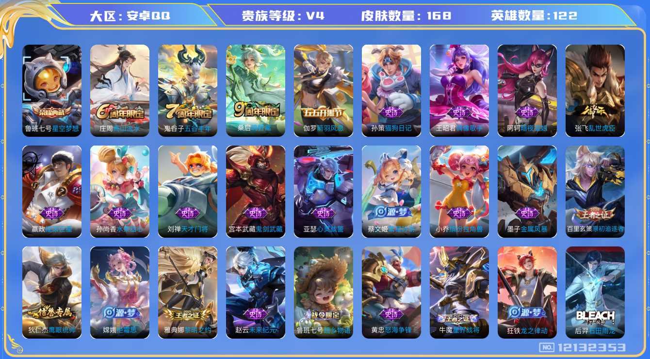 [12132353]【商品标题】:安卓Q-V4-最强王者段位-123英雄-168皮肤-1典藏-0珍品无双-0无双-0珍品传说-1传说-30史诗