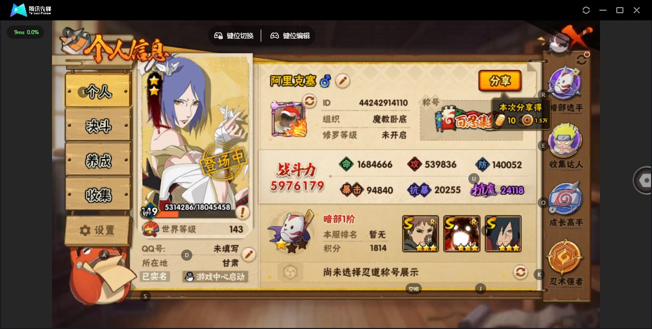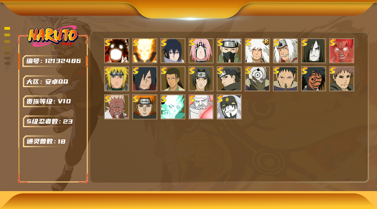 [12132486]V10 23S忍 37A忍 18通灵 597.6W战力 可二次 可修改实名 优质装备:熊猫,罗砂「四代目风影」,迈特凯「死门」,宇智波带土 「忍界大战」,“宇智波斑” 「白面具」,漩涡鸣人 「九喇嘛连结」,大筒木金式「博人传」,春野樱 「忍界大战」,神秘面具男 「红夜之刃」,宇智波佐助「永恒万花筒」,千手柱间·木叶创立,宇智波斑「秽土转生·解」,大筒木桃式,艾「忍界大战」,宇智波止水「须佐能乎」,旗木卡卡西「须佐能乎」,大筒木舍人 「最终章」,自来也 「传说中的三忍」,漩涡鸣人 「暴怒·第六尾」 S级忍者:自来也 「舞之豪杰」,宇智波鼬 「须佐能乎」,佩恩「天道」,波风水门,大蛇丸