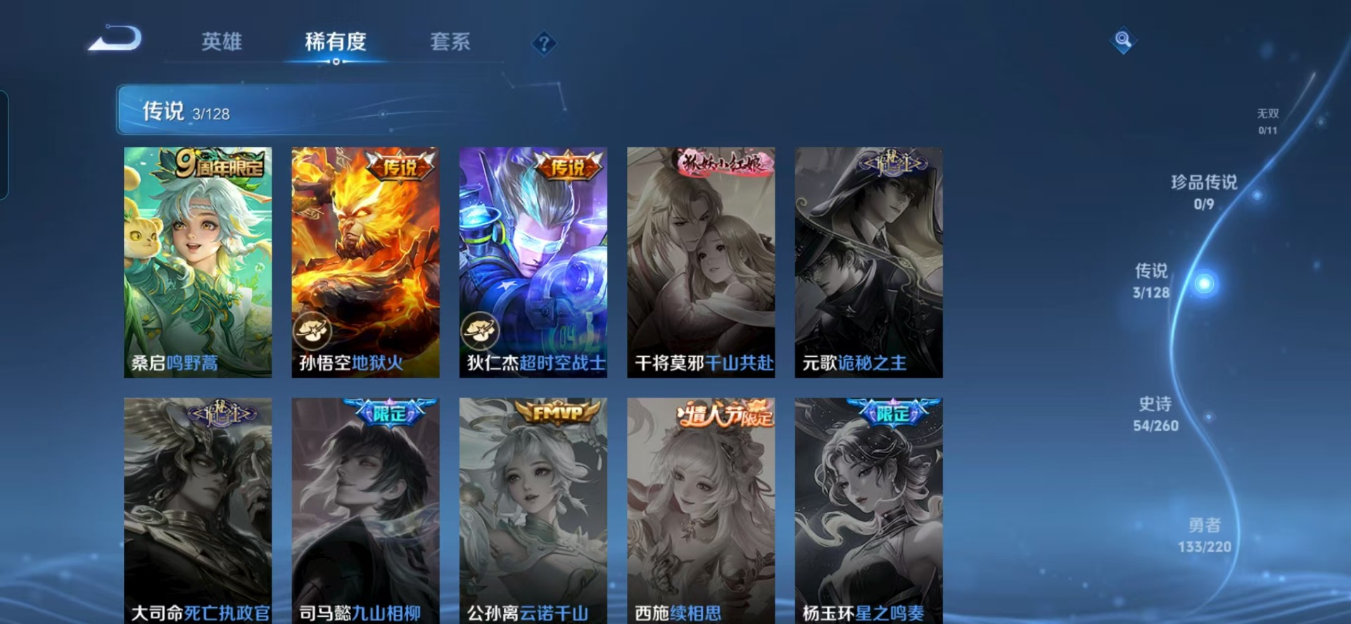 后羿如梦令,裴擒虎李小龙,上官婉儿梁祝,桑启鸣野蒿,猪八戒猪悟能,孙悟空大圣娶亲,孙悟空至尊宝,孙悟空美猴王,百里守约朱雀志,关羽冰锋战神