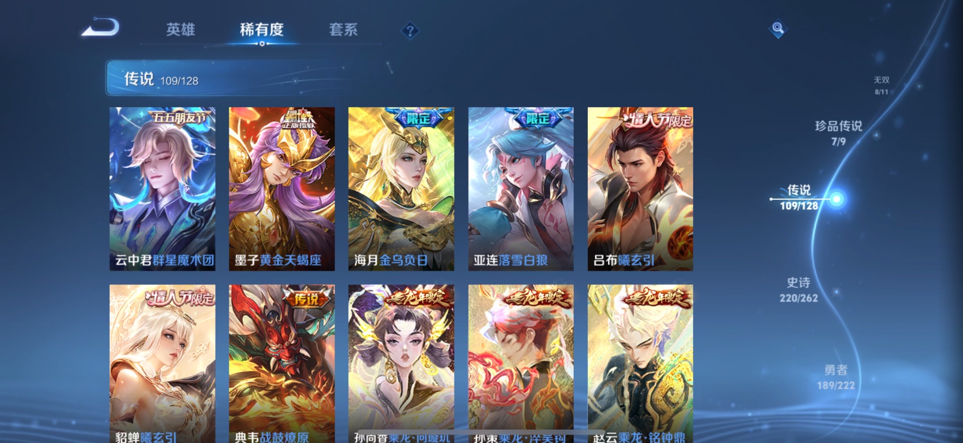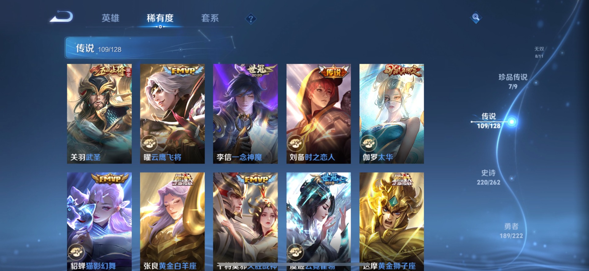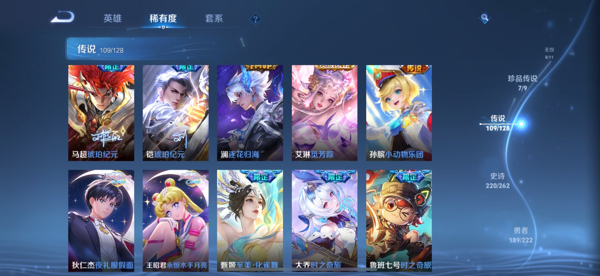 刘备时之恋人,小乔音你心动,李信一念神魔,孙尚香音你闪耀,孙尚香乘龙·问璇玑,庄周牧神诗旅,镜炽阳神光,朵莉亚心动手记,周瑜音你心动,杨玉环星之鸣奏,宫本武藏惊梅引,貂蝉遇见胡旋,貂蝉猫影幻舞,裴擒虎祥瑞亨通,嬴政玄雷天君,张良黄金白羊座,孙悟空零号·赤焰,曜云鹰飞将,曜李逍遥,云中君群星魔术团,百里守约碎云,墨子黄金天蝎座,澜逐花归海,虞姬云霓雀翎,貂蝉曦玄引,王昭君永恒水手月亮,大乔挚爱花嫁,大乔时之奇旅,铠绛天战甲,铠冥王哈迪斯,铠琥珀纪元,赵云乘龙·铭钟鼎,孙膑小动物乐团,张飞百相守梦,赵云淬星耀世,干将莫邪久胜战神,典韦战鼓燎原,干将莫邪画中仙,孙策末日机甲,孙策挚爱之约,孙策乘龙·淬吴钩,达摩黄金狮子座,海月金乌负日,王昭君乞巧织情,鲁班七号时之奇旅,吕布曦玄引,吕布遇见神鼓,公孙离记忆之芯,亚连落雪白狼,夏洛特浮生妄,艾琳觅芳踪,西施游龙清影,西施续相思,狄仁杰夜礼服假面,马超琥珀纪元,马超无双飞将,李元芳飞鸢探春,蔡文姬花朝如约,云缨幻光神枪