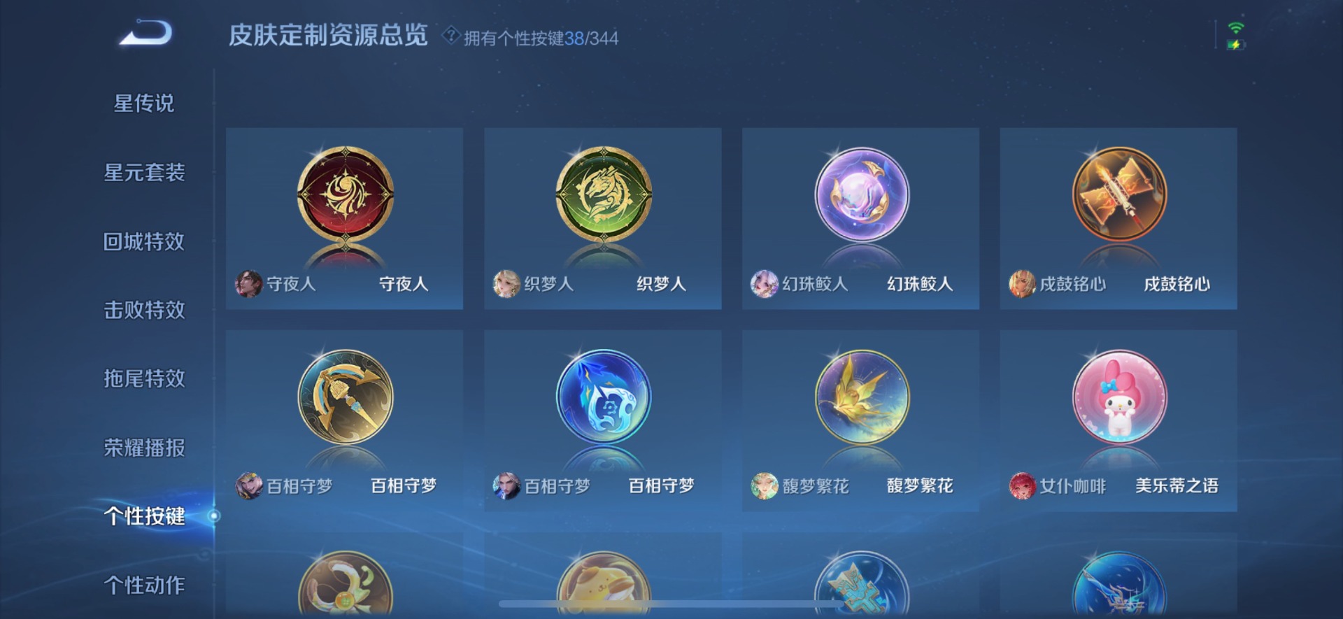 金蝉唐三藏,夏侯惇匿光决锋者,夏侯惇霜北刀,黄忠烈魂,小乔纯白花嫁,孙尚香异界灵契,不知火舞绯月行,牛魔奔雷神使,露娜启示之音,露娜一生所爱,镜匿光追影者,杨玉环寅虎·心曲,司空震愿照·山河定,貂蝉逐梦之音,裴擒虎天狼狩猎者,裴擒虎寅虎·赤拳,上官婉儿神器·万象笔,花木兰默契交锋,花木兰青春决赛季,马可波罗山海·玄木吟,马可波罗深海之息,孙悟空孙行者,孙悟空大圣娶亲,孙悟空至尊宝,芈月白晶晶,云中君时之祈愿,韩信傲雪梅枪,韩信飞衡,墨子降魔,澜愿照·九州拓,虞姬愿照·岁时盈,嫦娥如梦令,王昭君凤凰于飞,王昭君星穹之声,王昭君映山客,橘右京枫霜尽,哪吒逐梦之翼,甄姬幽恒,甄姬女儿国国王,甄姬至美·化雀舞,铠青龙志,伽罗天狼溯光者,伽罗太华,张飞虎魄,赵云百木心枪,孙膑寅虎·展翼,干将莫邪冰霜恋舞曲,鲁班七号乒乒小将,鲁班七号寅虎·瑞焰,后羿如梦令,后羿辉光之辰,公孙离玉兔公主,兰陵王影龙天霄,公孙离蜜橘之夏,鲁班大师匿光启智者,李白诗剑行,安琪拉魔法小厨娘,艾琳陌上桑,西施至美·乘鲤谣,桑启鸣野蒿,女娲补天,女娲愿照·千秋盛,马超神威,盘古冰霜神祇,妲己时之彼端,妲己愿照·众生和,蔡文姬奇迹圣诞,蔡文姬愿照·福禄聚,瑶时之祈愿,瑶山海·碧波行,娜可露露前尘镜,妲己热情桑巴,关羽武圣,关羽冰锋战神