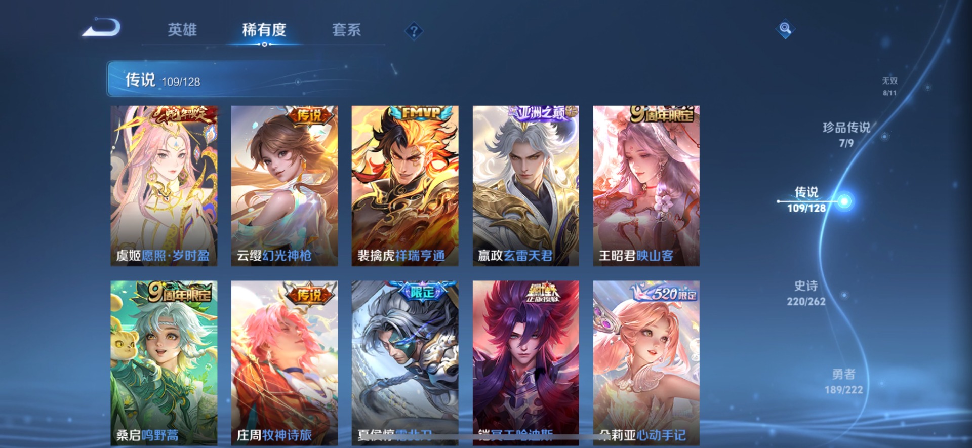 - [11471565]V8 2典藏 1无双 10传说 123英雄 219皮肤 可修改实名 荣耀水晶:银白咏叹调(倪克斯侍卫),全息碎影(猴子典藏) 无双皮:碎月剑心(李白无双) 传说皮:黄金射手座,零号·赤焰,地狱火,仲夏夜之梦(大飞蛾),末日机甲-孙尚香(绿蚂蚱),云霓雀翎,一念神魔,久胜战神,时之恋人-刘备(电焊工) 珍宝阁皮:优雅恋人,蔷薇恋人,女武神 限定皮:至尊宝,神威(电光马子),龙胆,烈魂,天狼绘梦者,李小龙,逐梦之影,引擎之心,美猴王 史诗皮:百相守梦-黄忠,黄金分割率,特工魅影,千年之狐,完美假期,江河有灵,百解令(蒙犽),匿光破解者,偶像歌手,晚萤,魅语,末日机甲-吕布,猫狗日记-孙策,猫狗日记-大乔,时之恋人-孙尚香,修罗,摇滚巨星,水果甜心,天才门将,星夜王子,暗隐猎兽者,心灵战警,舞动绿茵,地狱岩魂,纤云弄巧,繁星吟游(呼啦呼啦),拒霜思,缤纷独角兽,逐浪之夏,水晶猎龙者,热力回旋,金属风暴,鹰眼统帅,魅力维加斯,未来纪元-赵云