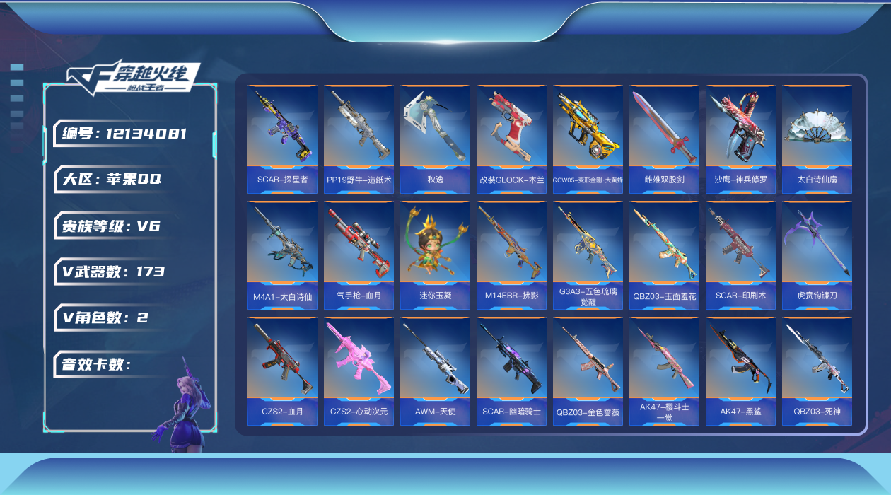 [12134081]可二次 可修改实名 V6 3王者武器 173英雄武器 2英雄角色 286万化 枪皇SS 武器:王者之影,M4A1-星象,AK47-奉先,MR1-龙吟惊沧海,TAC-晴舞,MK47-云舞,王者之隐,COP 357-堕天神,M4A1-黑龙,M4A1-死神,M4A1-黑骑士,AK47-木兰,M4A1-雷神,AK47-风神翼龙,AK47-黑武士觉醒,AK47-机械迷城,AK47-无影,巴雷特-毁灭,巴雷特-极光,98K-黑骑士,MK47-机械纪元,AWM-天使,QBZ03-金色蔷薇,QBZ03-死神,AUG-机械纪元,M12S-雷霆,双持斯泰尔-天使,MK5-机械纪元,M4A1-运输船,M4A1-夏清觉醒,AK47-黑鲨,AK47-血武士,AK47-春雅,AK47-猩红传说,AK47-沙漠郡主-超觉,AK47-幸运日觉醒,AK47-樱斗士-一觉,M200-心动次元觉醒,09式狙-天神,SCAR-幽暗骑士,AN94-四凶觉醒,SCAR-幽暗骑士觉醒,SCAR-探星者,AN94-超新星,AWM-裁决,AK12-天启,M14EBR-天神,9A91-天神,RPK-赤炎盘龙,SCAR-印刷术,AK47-破空冰刃,CBJ-MS-毒蜂,地狱火,QCW05-变形金刚·大黄蜂,CZS2-血月,CZS2-心动次元,地狱烈炎,PP19野牛-造纸术,MK47-鼓龙,G3A3-五色琉璃觉醒,QBZ03-玉面羞花,M14EBR-拂影,AN94-赳赳秦师,M4A1-太白诗仙,虎贲钩镰刀,墨刃-幻神,雌雄双股剑,沙鹰-修罗,沙鹰-宇航兔兔,改装GLOCK-木兰,沙鹰-超新星,气手枪-血月,沙鹰-神兵修罗,双持柯尔特-极光,M16-恶魔,尼泊尔-雷霆,手斧-机械迷城,麒麟刺-堕天神,尼泊尔-冰锋觉醒,擎天觉醒,QBB95-再战涿鹿,蝴蝶刀-极光,蟒蛇-火力竞放,麒麟刺,秋逸,血阳,屠龙,星芒,龙鳞-觉醒,迷你玉凝,丛林匕首-火力竞放,丛林匕首-庆龙觉醒,斩魔刀,神罚战斧,龙啸,太白诗仙扇,蝴蝶刀-天神,黑骑士手雷,黑武士手雷,幻兽手雷,燃烧弹-游骑兵,手雷-竞界荣光,SCAR-心动PICK,AN94-盖,双持沙鹰-元让,左轮-卧龙觉醒,甩棍-卧龙觉醒,CZS2-仲康,QBZ97-浩瀚征途,XM8-湮灭,M14EBR-葫芦山庄,FAMAS-湮灭,MAC-10-孟获,烈焰弓,蛮神巨斧,AWM-大湾溢彩