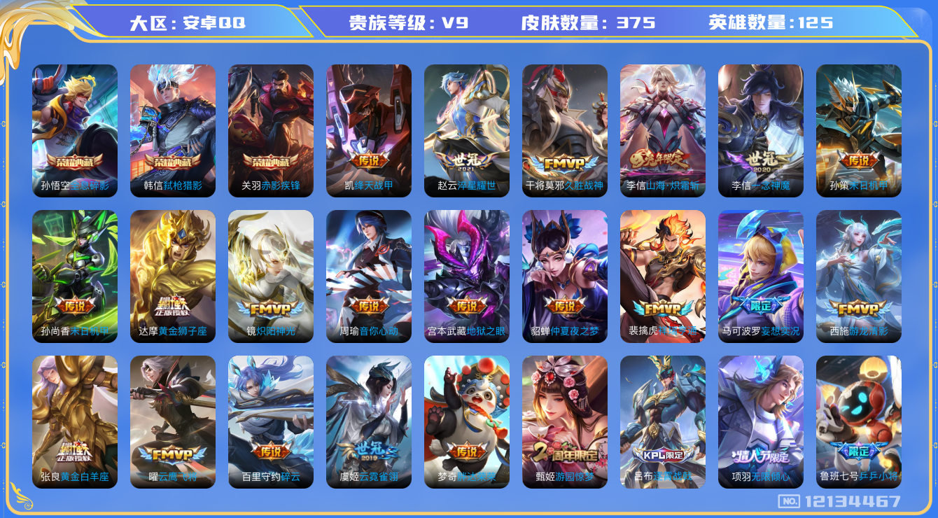 [12134467]V9 3典藏 26传说 125英雄 375皮肤 可修改实名 优质装备:全息碎影(猴子典藏),赤影疾锋,弑枪猎影(韩信典藏),黄金狮子座,云鹰飞将(小将军),绛天战甲(鸡嘴战神),黄金白羊座,久胜战神,炽阳神光,一念神魔,云霓雀翎,末日机甲-孙尚香(绿蚂蚱),仲夏夜之梦(大飞蛾),地狱之眼,音你心动-周瑜,胖达荣荣,游龙清影(小青龙),淬星耀世,末日机甲-孙策,碎云,山海·炽霜斩(李信年限),妄想实况 传说皮:祥瑞亨通 珍宝阁皮:胡桃夹子,优雅恋人,蔷薇恋人 限定皮:愿照·九州拓(澜年限),逐霄战戟,鸣野蒿,至尊宝,神威(电光马子),飞衡(韩信年限),无限倾心-项羽,遇见飞天,高山流水,齐天大圣,怒海麟威,降魔,五谷丰年,冰锋战神,游园惊梦,梁祝,李小龙,朱雀志(守约年限),乒乒小将,匿光追影者,山海·玄木吟(马可年限),冰霜神祇 史诗皮:灵蛊蚀心,星界战将,石田雨龙,蒙犽顽岩魄,琥珀纪元伽罗,蔬乡物语(鲁班七号),百相守梦-黄忠,紫霞仙子,苍穹之光,电玩小子(小书包),白龙吟,黄金分割率,特工魅影,千年之狐,永昼,江河有灵,真我赫兹(百里守约),魅语,百解令(蒙犽),高渐离燃音魔法,蒙恬荣光圣徽,冰冠公主,青蛇,偶像歌手,晚萤,电玩·爆裂旋风,暗夜猫娘,龙骑士(小龙虾),末日机甲-吕布,猫狗日记-孙策,猫狗日记-大乔,乱世虎臣,节奏热浪,修罗,女仆咖啡,摇滚巨星,水果甜心,绅士熊喵,天才门将,星夜王子,心灵骇客,功夫厨神,德古拉伯爵,暗隐猎兽者,幽灵船长,鬼剑武藏,心灵战警,乐园奇幻夜,舞动绿茵,地狱岩魂,纤云弄巧,拒霜思,缤纷独角兽,乘风破浪,逐浪之夏,水晶猎龙者,曙光守护者,箭羽风息,金属风暴,原初追逐者,圣诞狂欢,圣诞恋歌,鹰眼统帅,王者之锤,暗夜贵公子,魅力维加斯,黎明之约,赏金猎手,无心,未来纪元-赵云