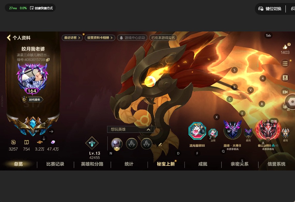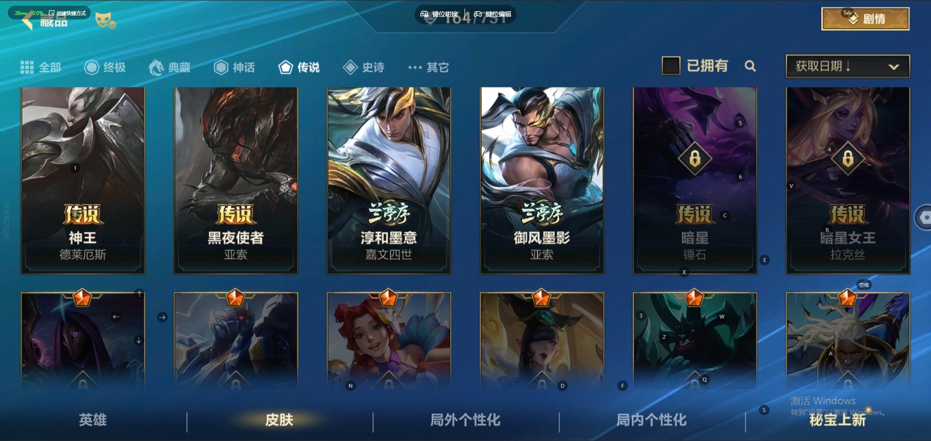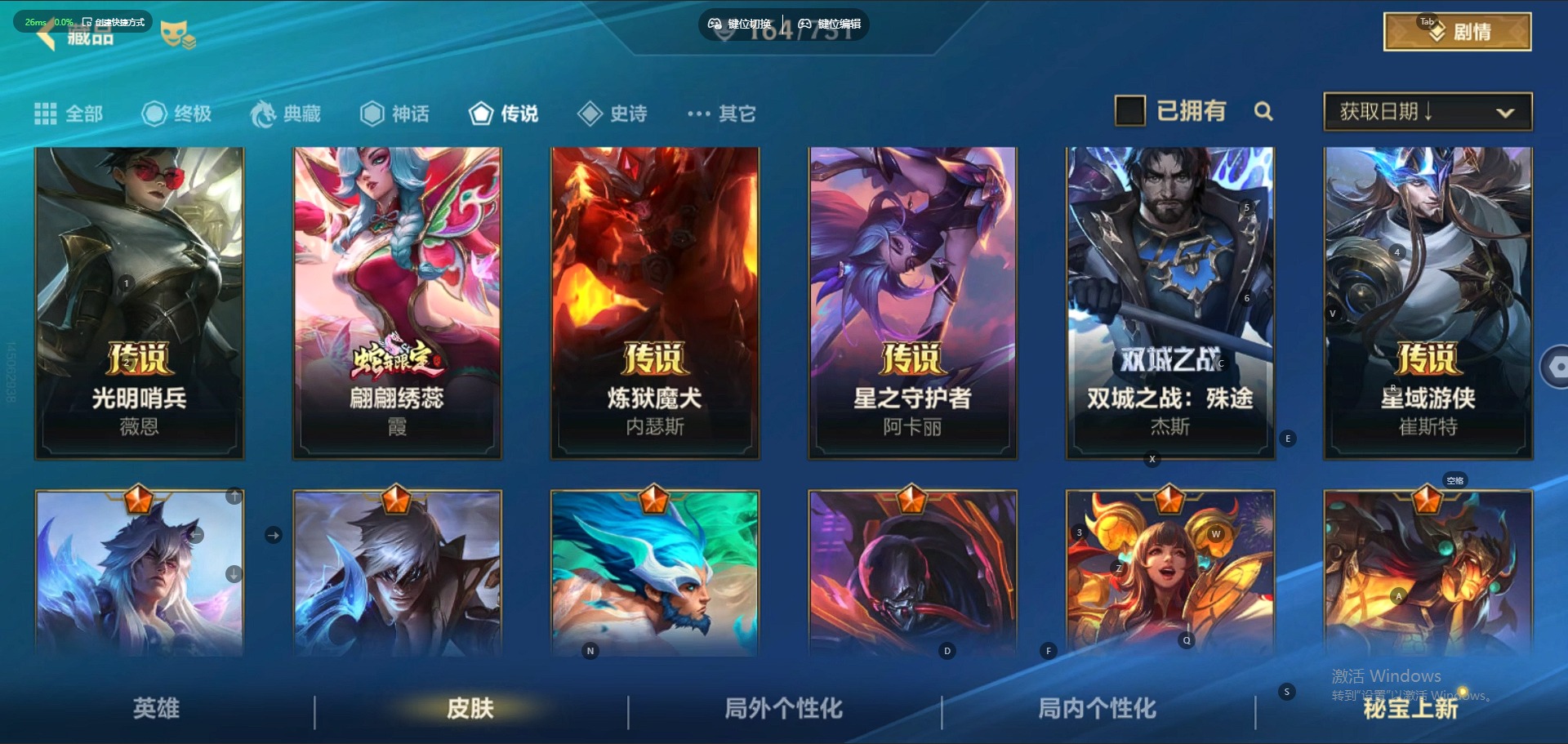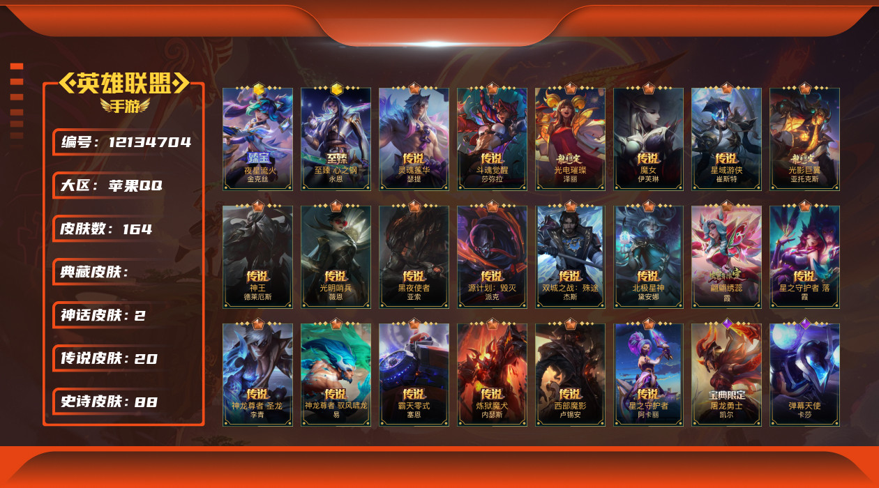 [12134704]20传说 88史诗 164皮肤 可二次 可修改实名 优质装备:光明哨兵薇恩,黑夜使者亚索,炼狱魔犬,神龙尊者 驭风啸龙,神王诺手,西部魔影卢锡安,星域游侠卡牌,星之守护者 落,霸天零式塞恩,灵魂莲华腕豪,魔女伊芙琳,至臻心之钢永恩,斗魂觉醒 莎弥拉 段位:宗师 神话皮:夜星流火 金克丝 限定皮肤:星之守护者霞,星之守护者洛,神龙烈焰金克丝,美猴王,关羽云长 传说皮:光影巨翼亚托克斯,神龙尊者 圣龙 李青,光电璀璨泽丽,源计划:毁灭,翩翩绣蕊 霞,北极星神 黛安娜,双城之战:殊途 杰斯,星之守护者 阿卡丽