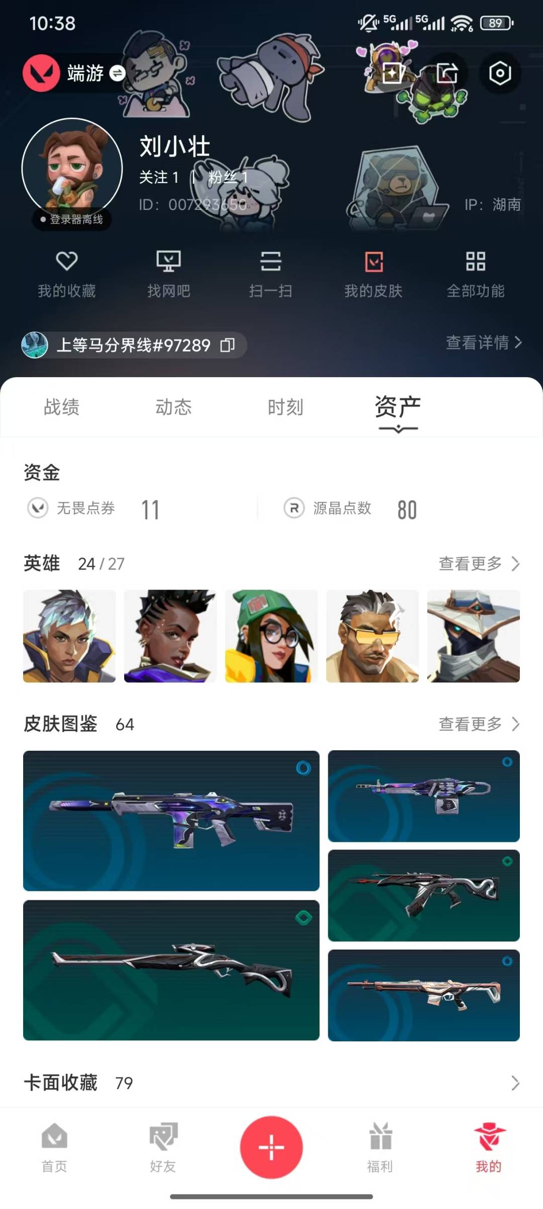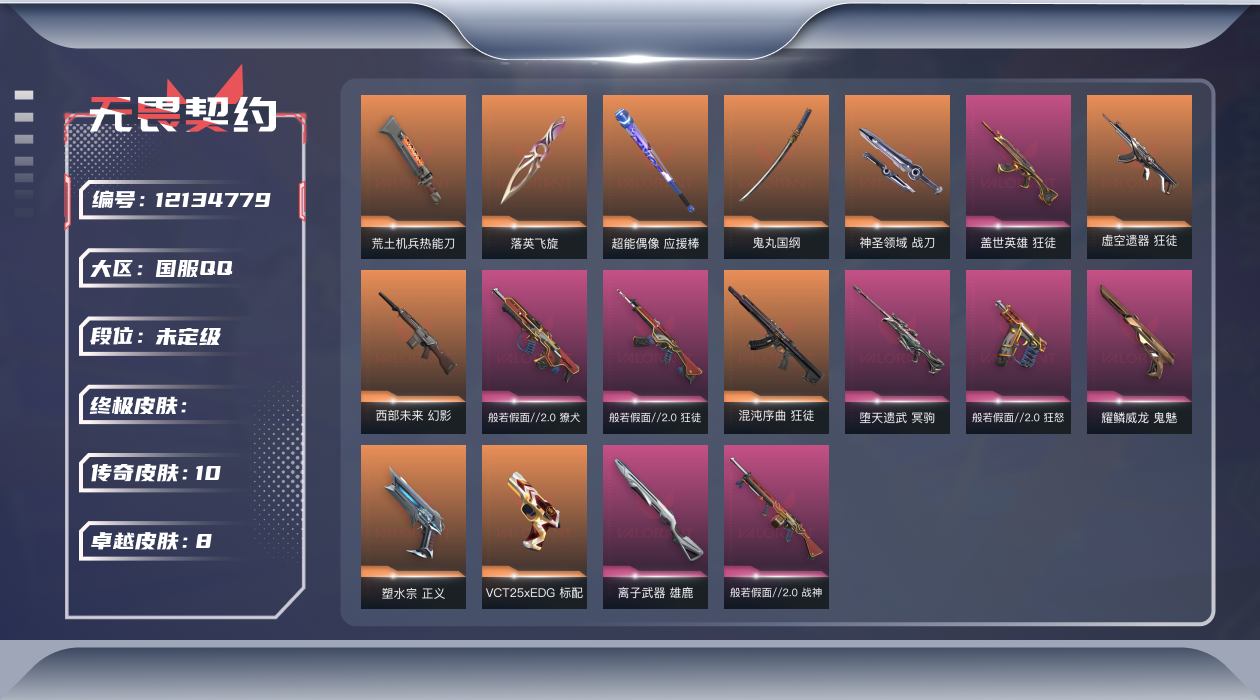 [12134779]10橙皮 8紫皮 64皮肤 24英雄 79卡面 670已用源晶 未定级 优质装备:狂徒-混沌序曲,正义-塑水宗,冥驹-堕天遗武,狂徒-盖世英雄,落英飞旋,荒土机兵热能刀,鬼丸国纲,神圣领域 战刀,雄鹿-离子武器,鬼魅-耀鳞威龙 套装:般若假面//2.0套装 佩枪皮肤:狂怒-般若假面//2.0,标配-VCT25xEDG 步枪皮肤:狂徒-般若假面//2.0,幻影-西部未来,狂徒-虚空遗器,獠犬-般若假面//2.0 机枪皮肤:战神-般若假面//2.0 近战武器皮肤:超能偶像 应援棒