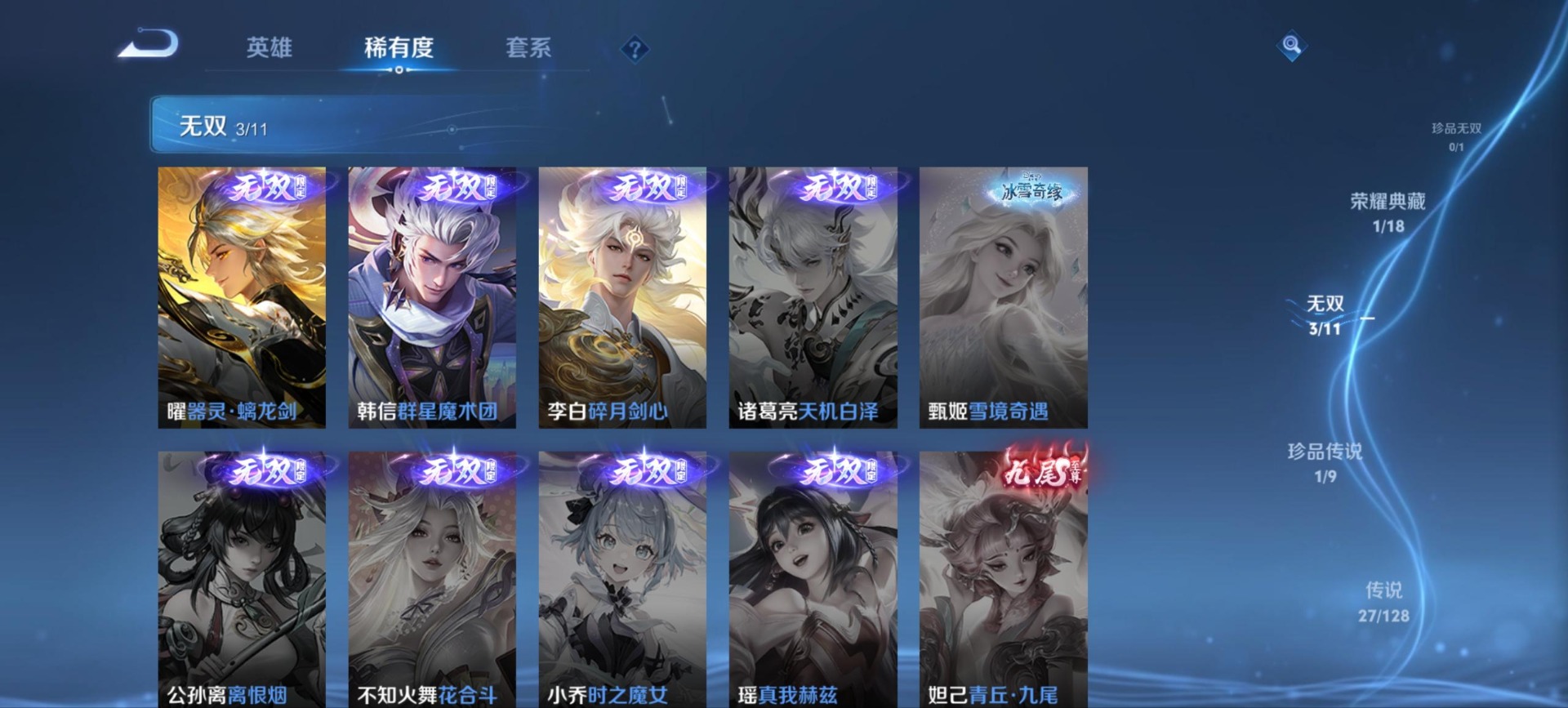 甄姬幽恒,后羿辉光之辰,裴擒虎李小龙,裴擒虎天狼狩猎者,上官婉儿梁祝,桑启鸣野蒿,孙悟空孙行者,孙悟空大圣娶亲,孙悟空至尊宝,孙悟空美猴王,马超神威,韩信傲雪梅枪,韩信飞衡,韩信逐梦之影