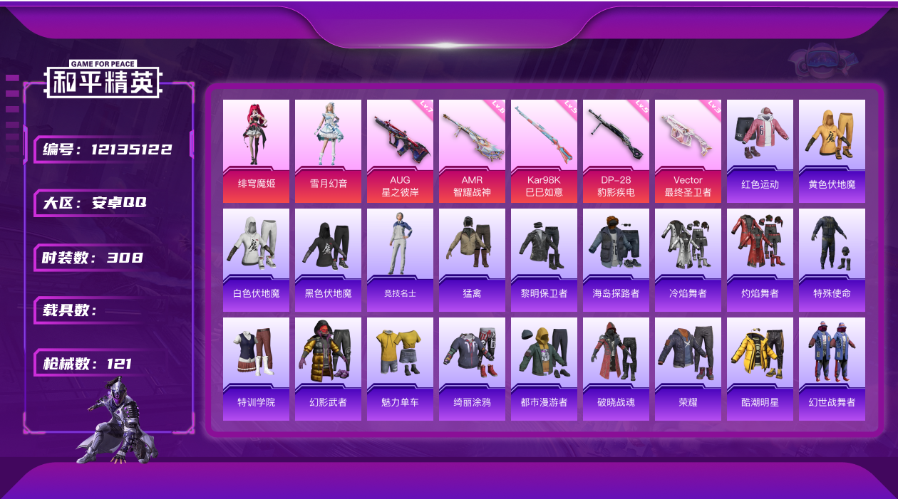- PX_2093415- 苹果手Q-13王牌印记-13粉装-6特效枪-3载具-57146热力值-128套装-140枪皮-2卓越印记-2传奇印记 【13粉装】,雪国幻梦,梦幻火箭,2号机款机体服,灵感创作师,童趣迷兔,洛天依,恐龙拽拽,千金淑猫,银龙傲海,百合蜜语,山涧鹿灵,暗翼战神,骨龙祭渊 【6特效枪】AKM-百合蜜语-7级 M16A4-垂柳戏鸭-2级 M416-风花雪月-7级 Kar98K-巳巳