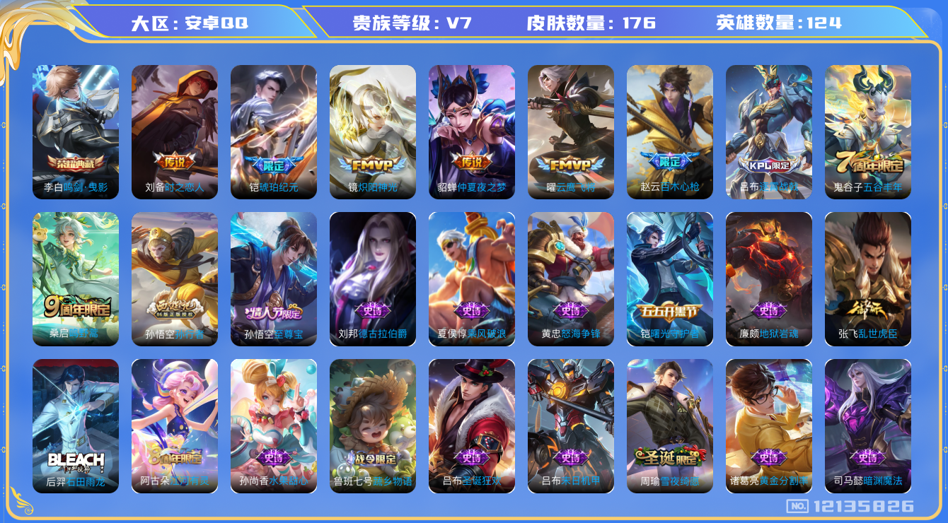 [12135826]V7 1典藏 6传说 124英雄 176皮肤 可修改实名 优质装备:鸣剑·曳影,云鹰飞将(小将军),炽阳神光,仲夏夜之梦(大飞蛾),时之恋人-刘备(电焊工),琥珀纪元铠,涂山容容 珍宝阁皮:蔷薇恋人 限定皮:逐霄战戟,鸣野蒿,至尊宝,五谷丰年,孙行者,百木心枪 史诗皮:谪仙醉月,石田雨龙,怒海争锋,破空之剑,东方月初,蒙犽顽岩魄,芈月浮光幕影,上官婉儿群星魔术团,蔬乡物语(鲁班七号),黄金分割率,特工魅影,江河有灵,雪夜绮愿(周瑜),百解令(蒙犽),冰冠公主,偶像歌手,晚萤,末日机甲-吕布,乱世虎臣,女仆咖啡,摇滚巨星,水果甜心,绅士熊喵,心灵骇客,德古拉伯爵,暗隐猎兽者,鬼剑武藏,暗渊魔法,心灵战警,天秀·启明,舞动绿茵,地狱岩魂,纤云弄巧,拒霜思,乘风破浪,水晶猎龙者,曙光守护者,金属风暴,圣诞狂欢,圣诞恋歌,暗夜贵公子,魅力维加斯,无心