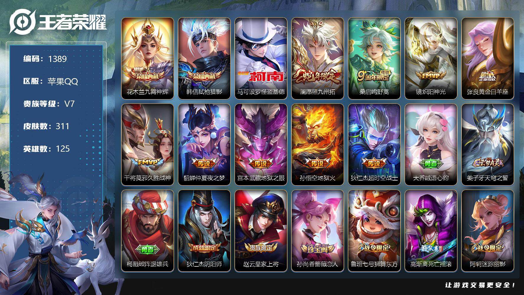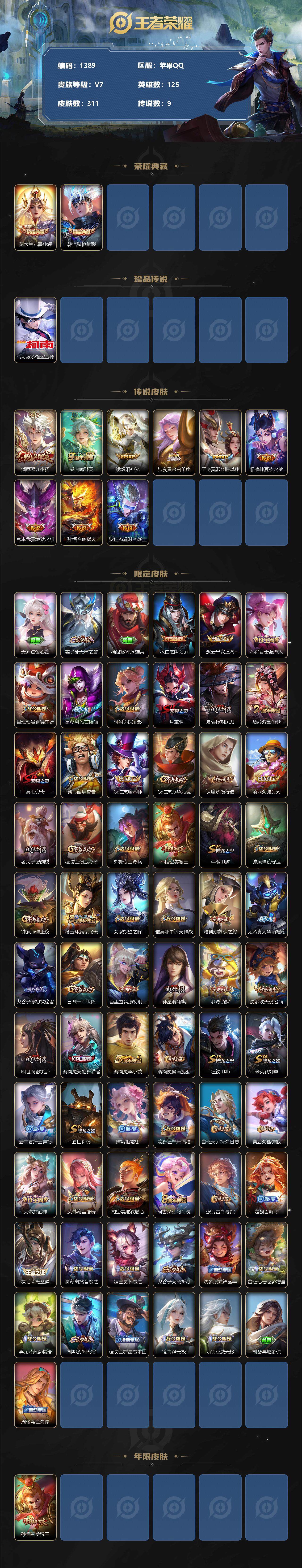 [12136632]【商品标题】:苹果Q-V7-最强王者段位-125英雄-311皮肤-2典藏-0珍品无双-0无双-1珍品传说-9传说-70史诗