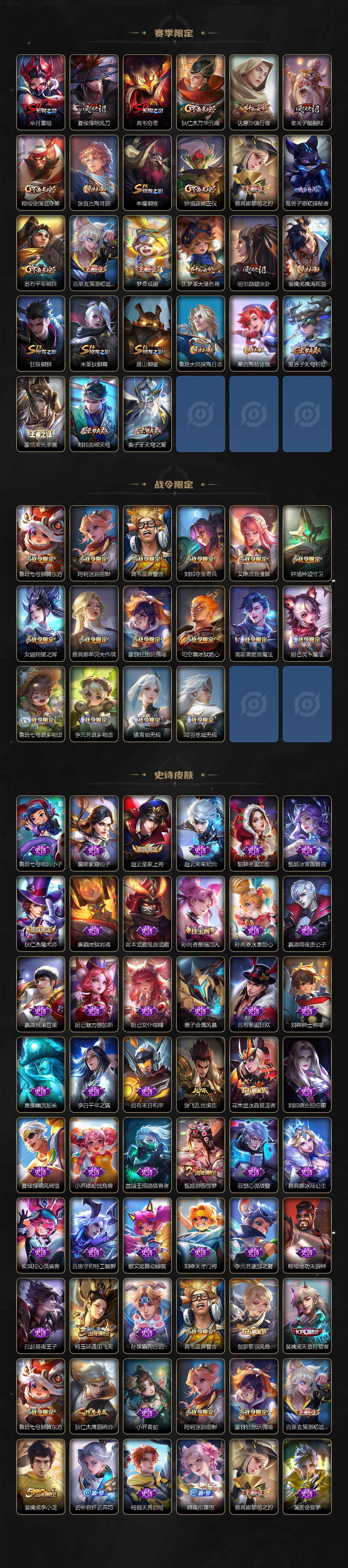 【赛季限定】:芈月重明,夏侯惇朔风刀,典韦穷奇,狄仁杰万华元夜,达摩沙漠行僧,老夫子醍醐杖,程咬金演武夺筹,张良古海寻踪,牛魔御旌,钟馗驱傩正仪,雅典娜黎明之约,鬼谷子原初探秘者,苏烈千军破阵,百里玄策原初追逐者,弈星混沌棋,梦奇顽趣,沈梦溪大漠名商,明世隐疑决卦,裴擒虎擒涛扼浪,狂铁御狮,米莱狄御霄,盾山御銮,鲁班大师探海日志,桑启海盐诗旅,鬼谷子天穹祈灯,蒙恬荣光圣徽,刘邦剑破天穹,姜子牙天穹之誓