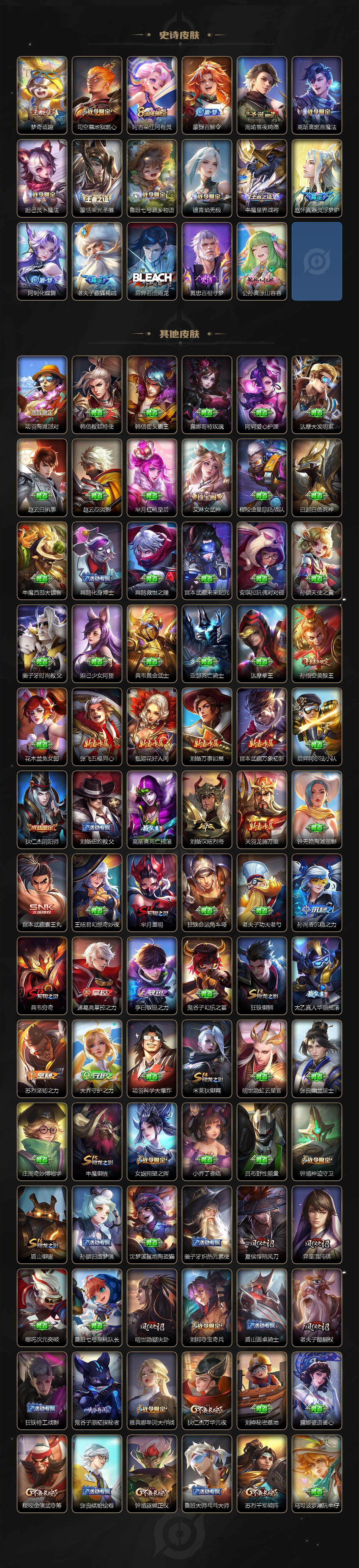 - [11681983]V7 2典藏 4传说 122英雄 270皮肤 可修改实名 荣耀水晶:鸣剑·曳影,弑枪猎影(韩信典藏) 传说皮:淬星耀世,山海·苍雷引(电光曜子) 珍宝阁皮:女武神,玩趣恶龙 限定皮:鸣野蒿,至尊宝,遇见飞天,匿光决锋者,五谷丰年,梁祝,天狼溯光者,李小龙,引擎之心,冰霜恋舞曲,枫霜尽 史诗皮:紫霞仙子,电玩小子(小书包),白龙吟,黄金分割率,特工魅影,千年之狐,永昼,江河有灵,高渐离燃音魔法,百解令(蒙犽),冰冠公主,偶像歌手,电玩·爆裂旋风,百相守梦(关羽),龙骑士(小龙虾),末日机甲-吕布,猫狗日记-孙策,猫狗日记-大乔,乱世虎臣,节奏热浪,女仆咖啡,摇滚巨星,水果甜心,绅士熊喵,天才门将,星夜王子,心灵骇客,功夫厨神,德古拉伯爵,暗隐猎兽者,幽灵船长,鬼剑武藏,心灵战警,舞动绿茵,纤云弄巧,繁星吟游(呼啦呼啦),拒霜思,缤纷独角兽,乘风破浪,逐浪之夏,水晶猎龙者,曙光守护者,箭羽风息,金属风暴,圣诞狂欢,圣诞恋歌,鹰眼统帅,暗夜贵公子,魅力维加斯,无心,未来纪元-赵云