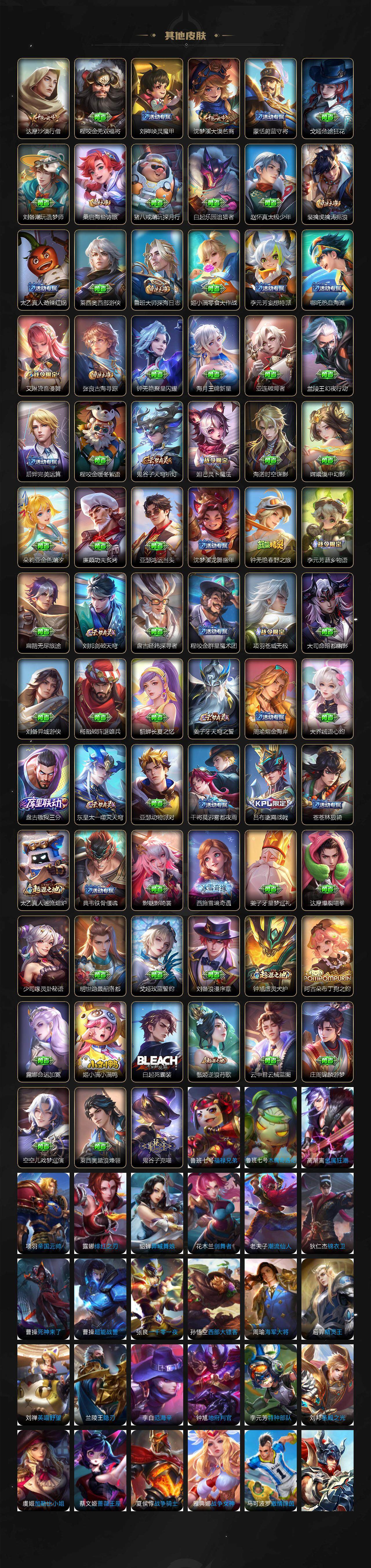 【限定皮肤】:大乔绒语心约,姜子牙天穹之誓,杨戬破阵退雄兵,狄仁杰阴阳师,赵云皇家上将,孙尚香蔷薇恋人,鲁班七号狮舞东方,高渐离死亡摇滚,阿轲迷踪丽影,芈月重明,夏侯惇朔风刀,甄姬游园惊梦,典韦穷奇,典韦蓝屏警告,狄仁杰魔术师,狄仁杰万华元夜,达摩沙漠行僧,项羽海滩派对,老夫子醍醐杖,程咬金演武夺筹,刘邦夺宝奇兵,孙悟空美猴王,牛魔御旌,钟馗神迹守卫,钟馗驱傩正仪,杨玉环遇见飞天,女娲朔望之晖,雅典娜单词大作战,雅典娜黎明之约,太乙真人华丽摇滚,鬼谷子原初探秘者,苏烈千军破阵,百里玄策原初追逐者,弈星混沌棋,梦奇顽趣,沈梦溪大漠名商,明世隐疑决卦,裴擒虎天狼狩猎者,裴擒虎李小龙,裴擒虎擒涛扼浪,狂铁御狮,米莱狄御霄,云中君纤云弄巧,盾山御銮,嫦娥拒霜思,蒙犽狂想玩偶喵,鲁班大师探海日志,桑启海盐诗旅,艾琳女武神,艾琳流音漫舞,司空震地狱燃心,阿古朵江河有灵,张良古海寻踪,蒙犽百解令,蒙恬荣光圣徽,高渐离燃音魔法,妲己灵卜魔法,鬼谷子天穹祈灯,沈梦溪龙舞盛年,鲁班七号蔬乡物语,李元芳蔬乡物语,刘邦剑破天穹,程咬金群星魔术团,镜青焰无极,项羽苍威无极,刘备异域游侠,周瑜熔金海岸