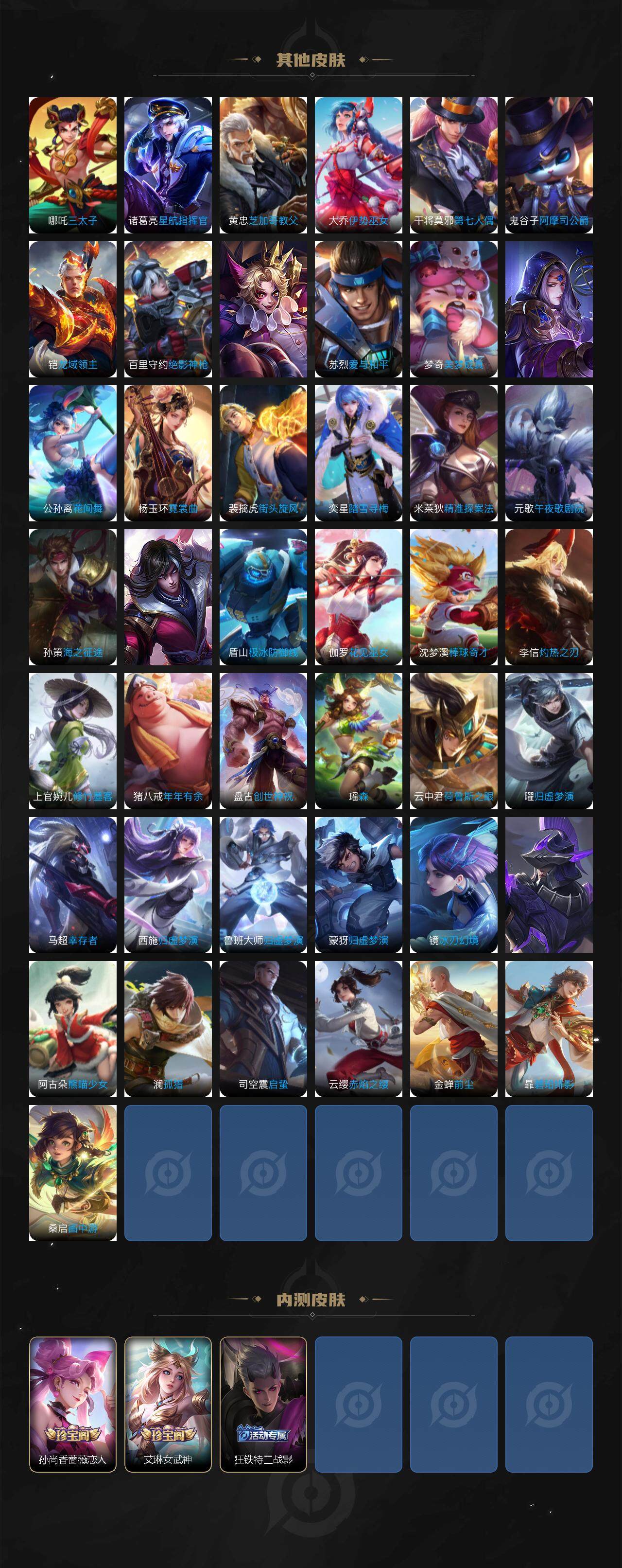 芈月重明,典韦穷奇,狂铁御狮,米莱狄御霄,牛魔御旌,夏侯惇朔风刀,明世隐疑决卦,老夫子醍醐杖,鬼谷子原初探秘者,狄仁杰万华元夜,程咬金演武夺筹,钟馗驱傩正仪,苏烈千军破阵,女娲朔望之晖,典韦蓝屏警告,钟馗神迹守卫,鲁班七号狮舞东方,刘邦夺宝奇兵,蒙犽狂想玩偶喵,弈星混沌棋,达摩沙漠行僧,沈梦溪大漠名商,桑启海盐诗旅,裴擒虎擒涛扼浪,鲁班大师探海日志,张良古海寻踪,项羽苍威无极,镜青焰无极