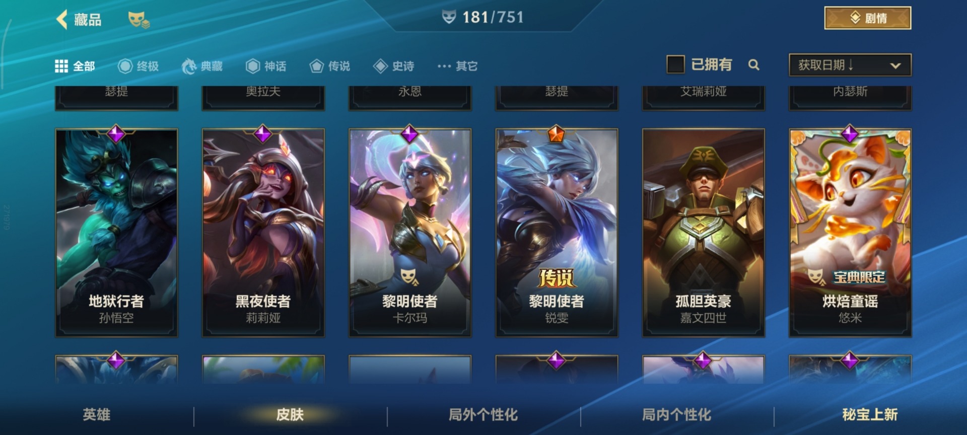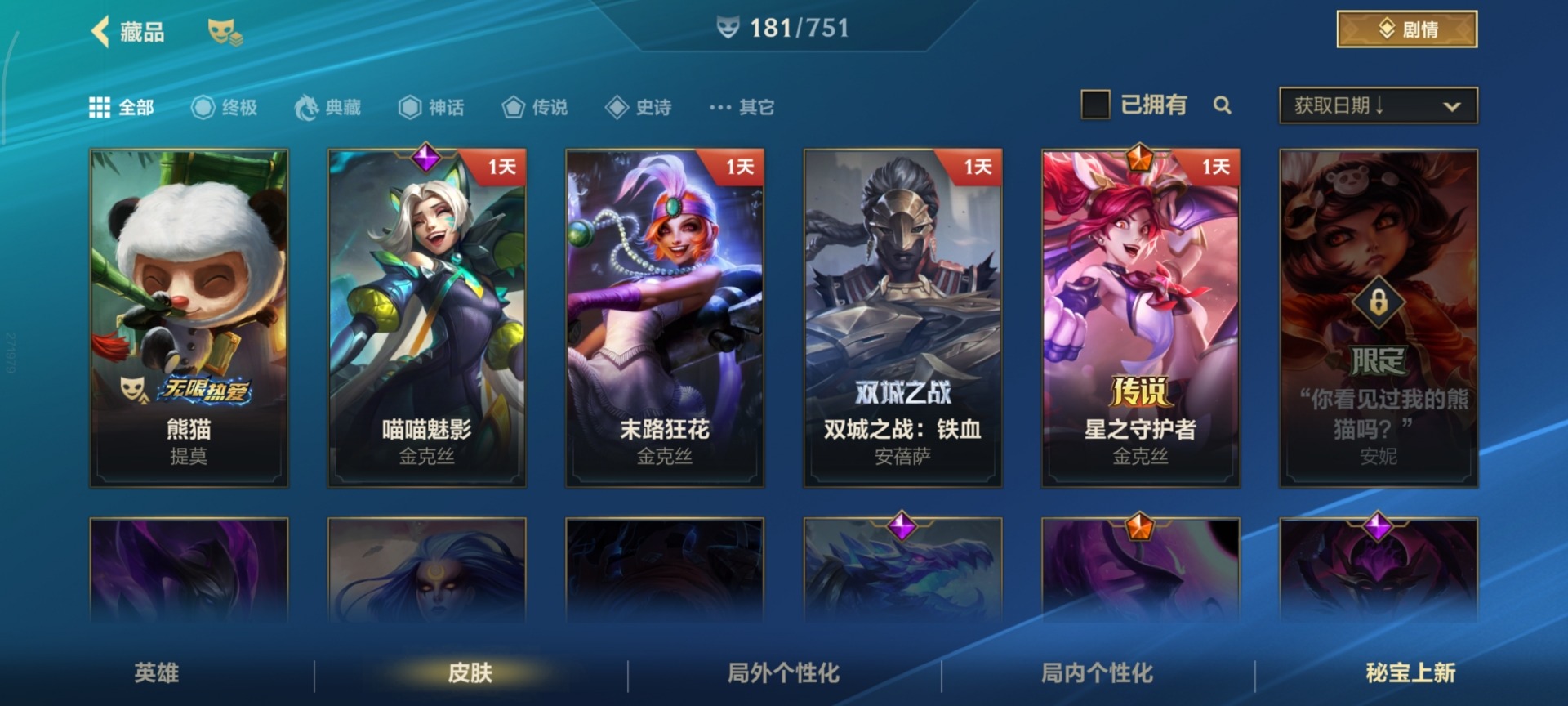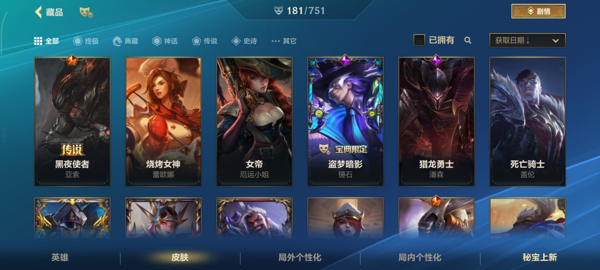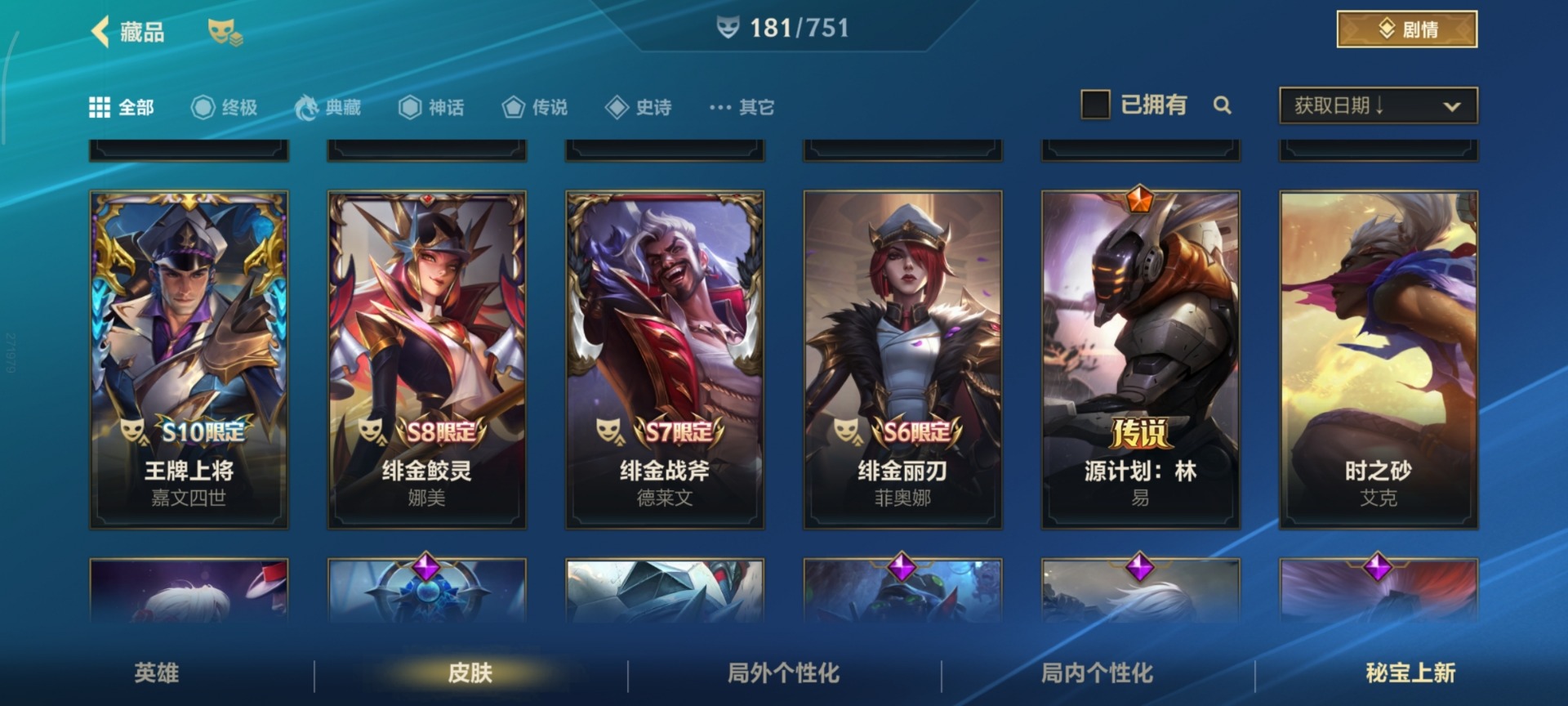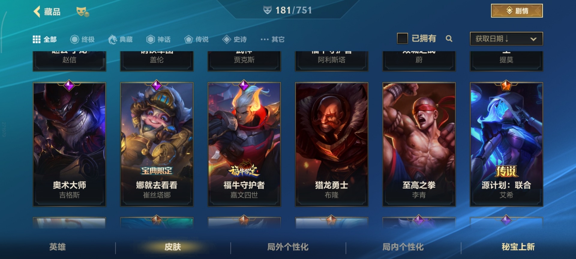 - PX_2009413-贵族等级: V7 英雄数: 121 皮肤数: 195 传说皮: 黄金白羊座,久胜战神,淬星耀世,末日机甲-孙策,乘龙·问璇玑 限定皮: 时雨天司,青春决赛季,孙行者,傲雪梅枪,五谷丰年